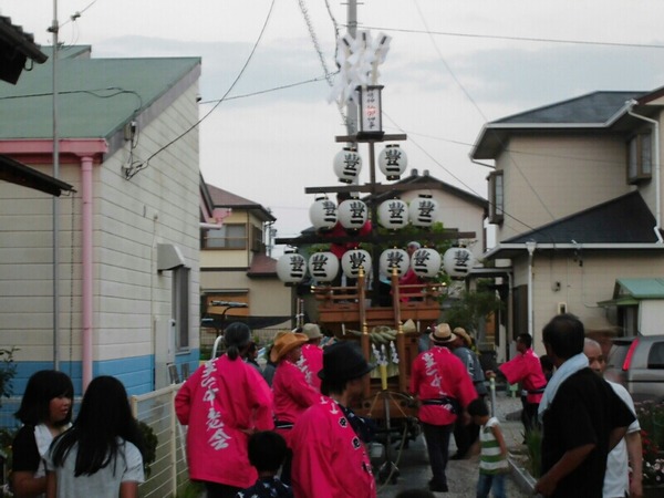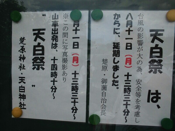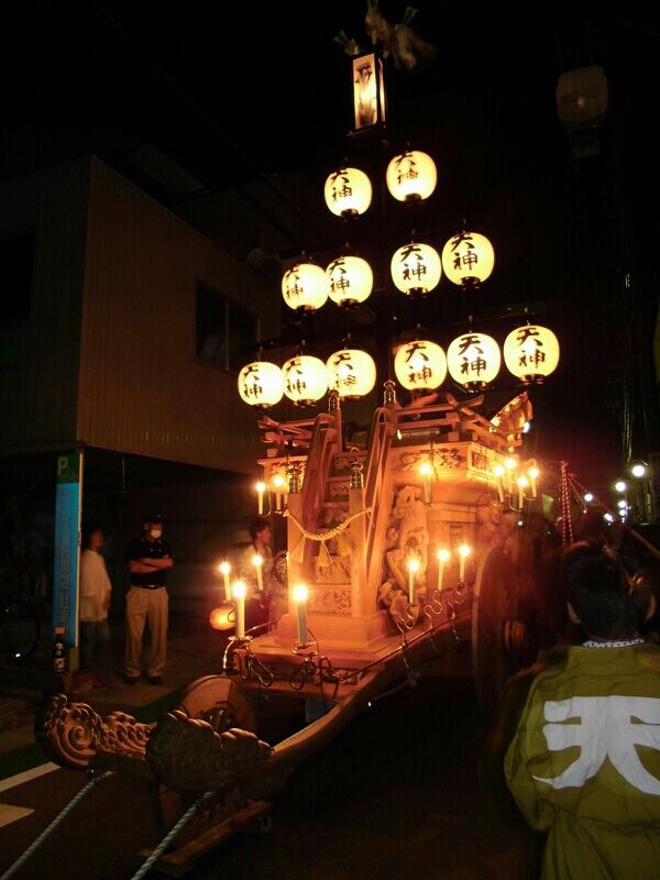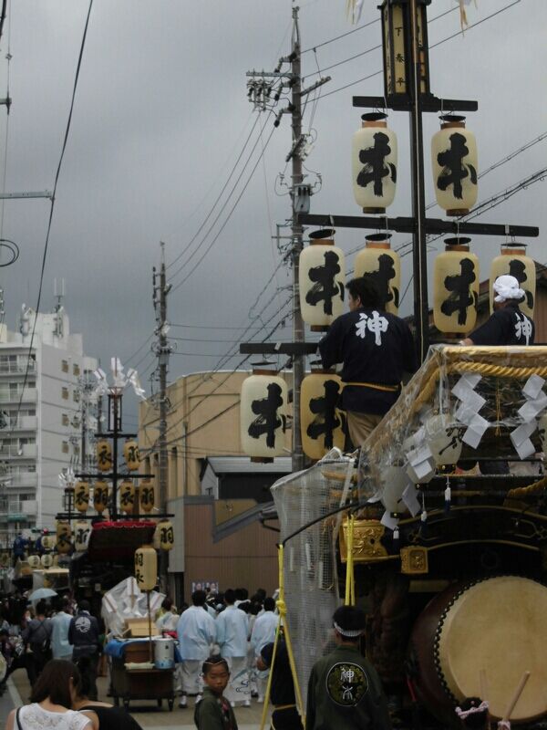 8/11 台風が接近したため、初(?)の延期。 行程も繰り上げて行われます。 平日開催という事で、鉦も二丁の少人数仕様。 祭車のお祓い、 鳥居の行燈を外して叩き出し♪ 最初は笛の入るお囃子なので、桐の桴です。 デンチャンで始まり、祭車を回転させます! そして ...