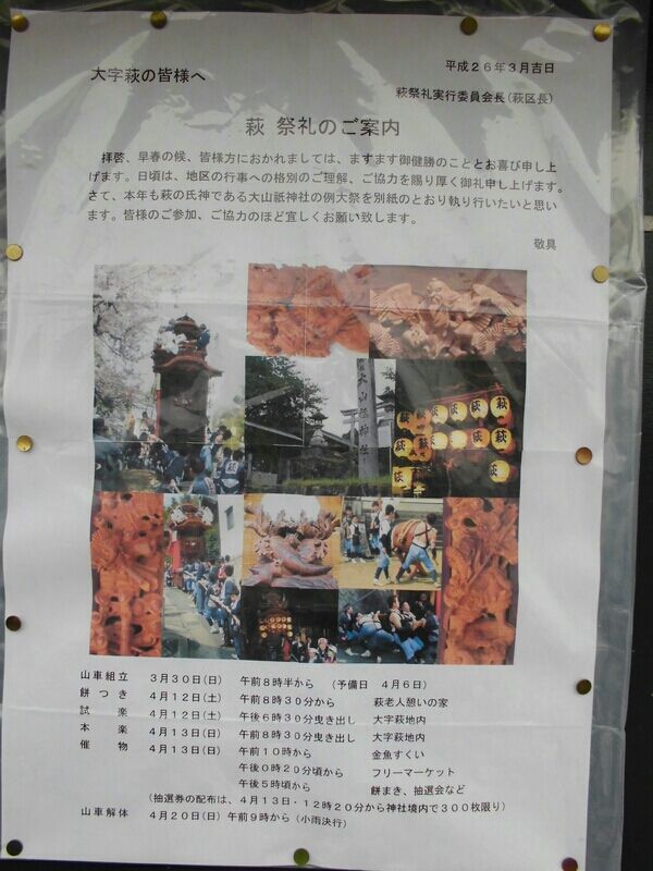 北粕谷に行った後、こちらも山車が復活するとの事で行ってみました! 数時間しか曳かないとの事で、据え置きしている所でも見られないかな?と思いダメ元で行くと、やはり姿はありませんでした。 と、そこで公民館にいらっしゃった方々に伺うと、なんと蔵を見せていただ ...