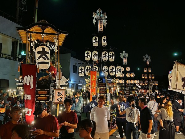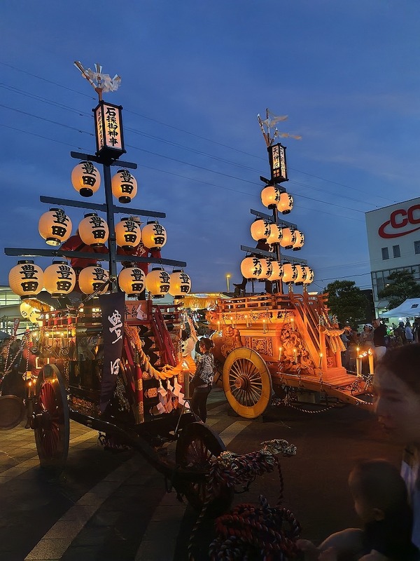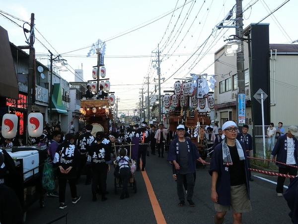 7/27 天神町が奉納を終え、曳き出します!天神町川越富洲原駅西口広場へ向かいます。豊田転かされてしまいました。2台の祭車が揃います。しかし、結構距離が離れています。夜の帳がおりると、曳き別れを行います。祭車を寄せ、両地区青年会が若松様を唄います。両地区とも五 ...