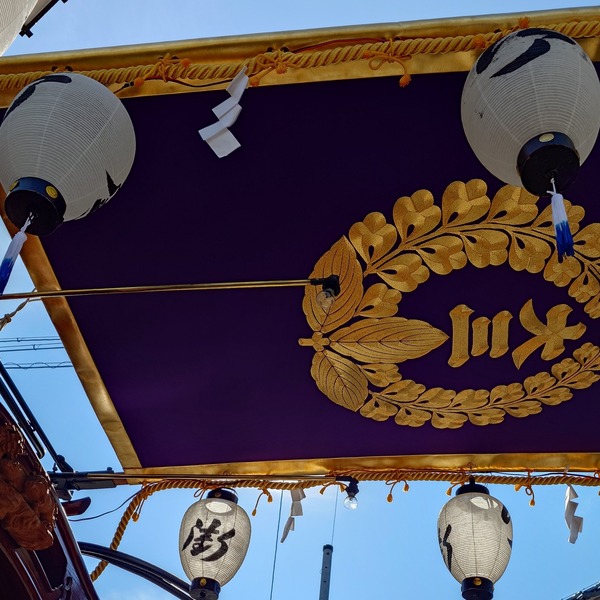 8/2 試楽日の朝です!朝御饌祭の後、祭事長の記念撮影です。その1時間後、青年会長正式参拝が行われ、同じように写真撮影が行われました。第一組 上本町午後から飾り付けを行います。万燈と御幣、山形提燈を飾ります。山形柱を背もたれにして天幕を取り付けます。試楽は小太 ...