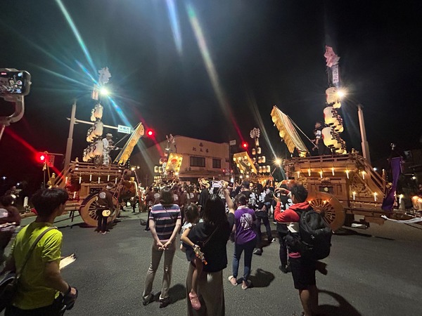 7/27 川越町から神戸へ!先に渡祭を終えた4台は、栄橋西交差点で1回目の曳き別れを行います。北向きに北萱町祭車、西向きに北新町祭車、南向きに東町祭車、東向きに六郷連祭車です。曳き別れが終わると、後4台を待たずに帰町します。神戸北萱町六郷連神戸北新町渡祭順の遅 ...