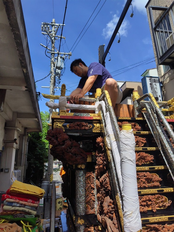 5/11 上本町は蔵改めと準備を行いました!第一組 上本町包帯を取り、燭台と電飾を取り付けます。こらっ、サボるな!本天幕縁の縫い目が開いてきたので、修理に出しました。縫い目を確認し、竿を差します。樫木材に割竹を貼り付けている柔と剛を兼ね備えた竿です。万燈の中に ...