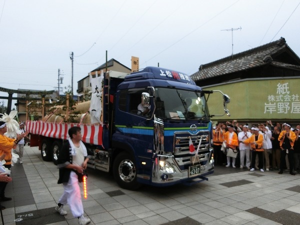 6/8 住吉浦では御神木をお迎えする準備が進みます!2tトラックがやってきました。こちらには曳綱が積まれています。動かし易いように、軽トラの荷台に積み替えます。午後4時36分、予定より早く愛知県からの御神木を載せた10tトラックが到着しました。予定より30分早く到着 ...