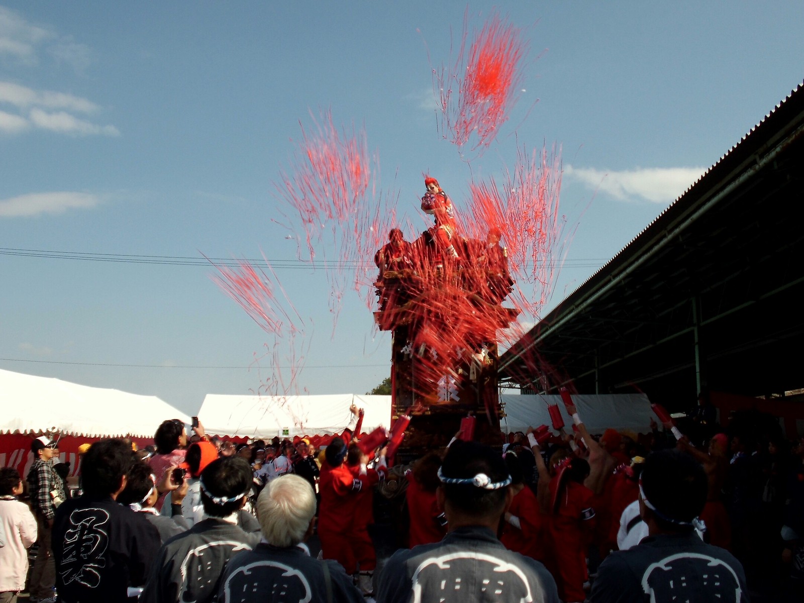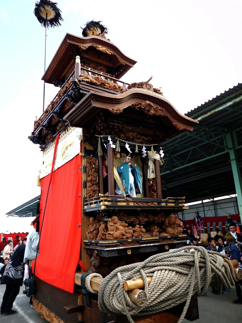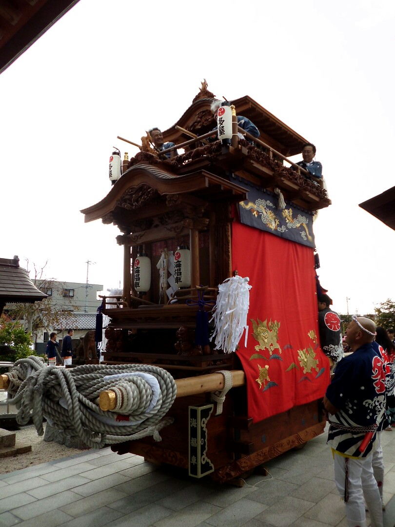 早くに山車の曳き廻しが行われ、秋晴れの雲ひとつない空のもと、神社拝殿前に