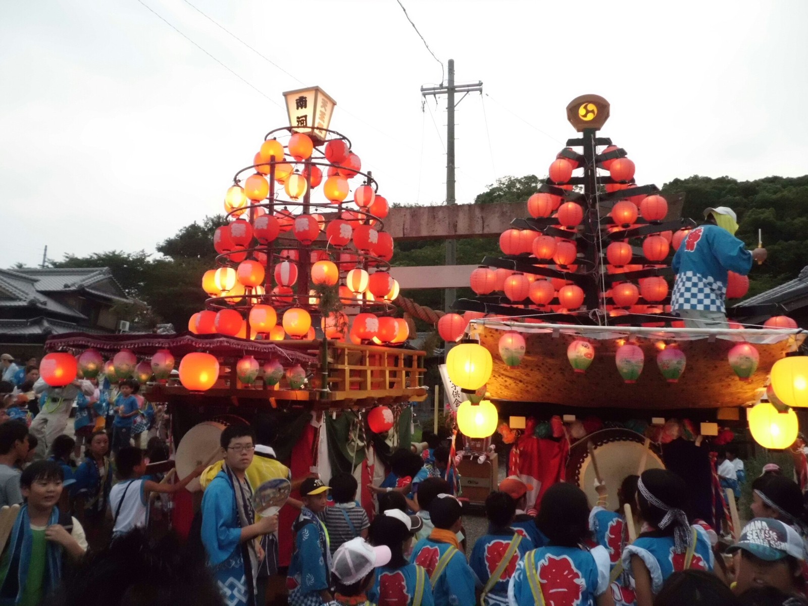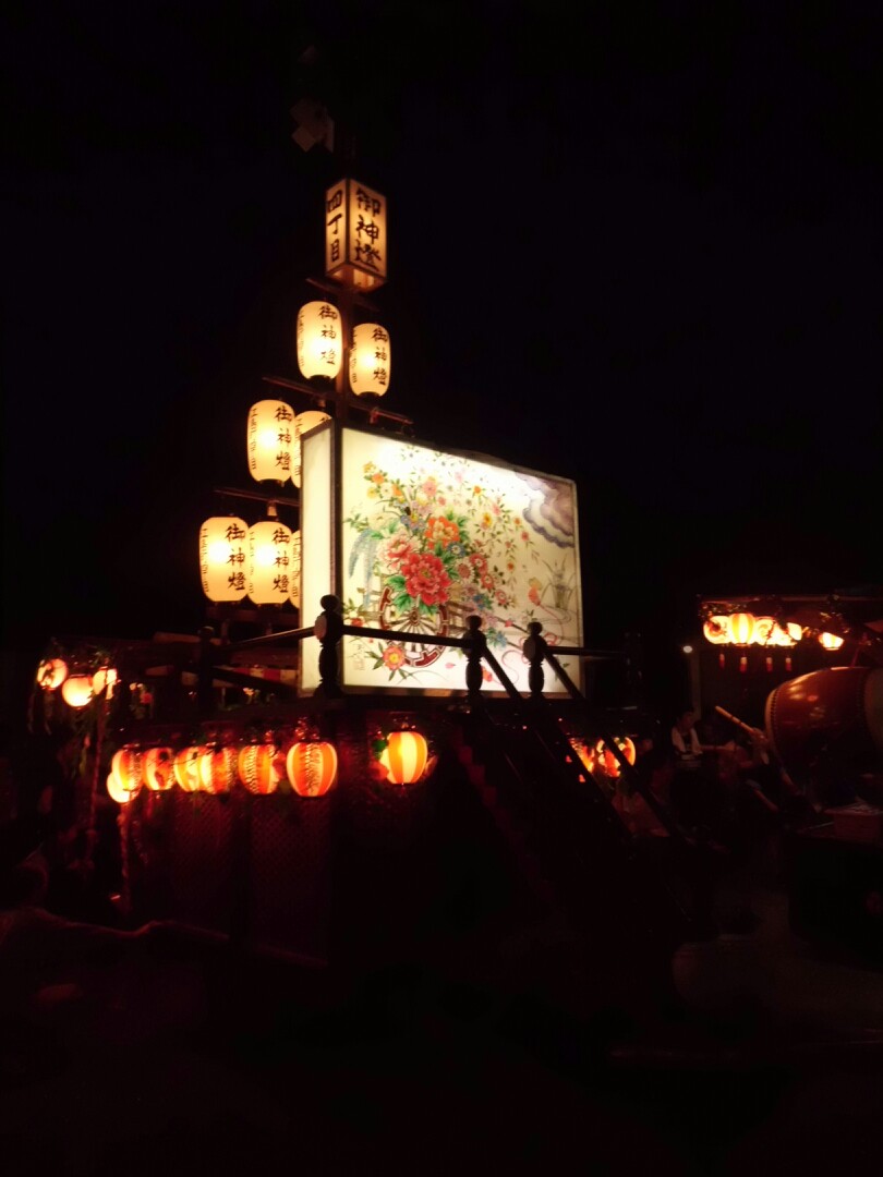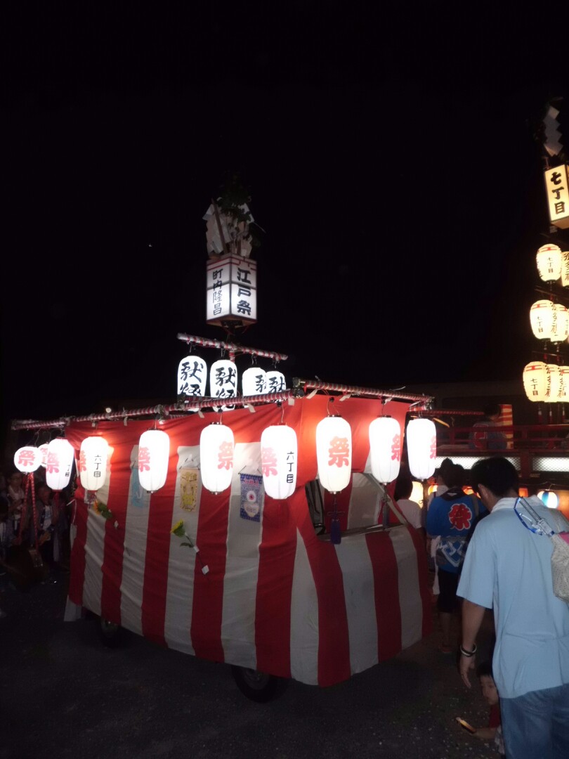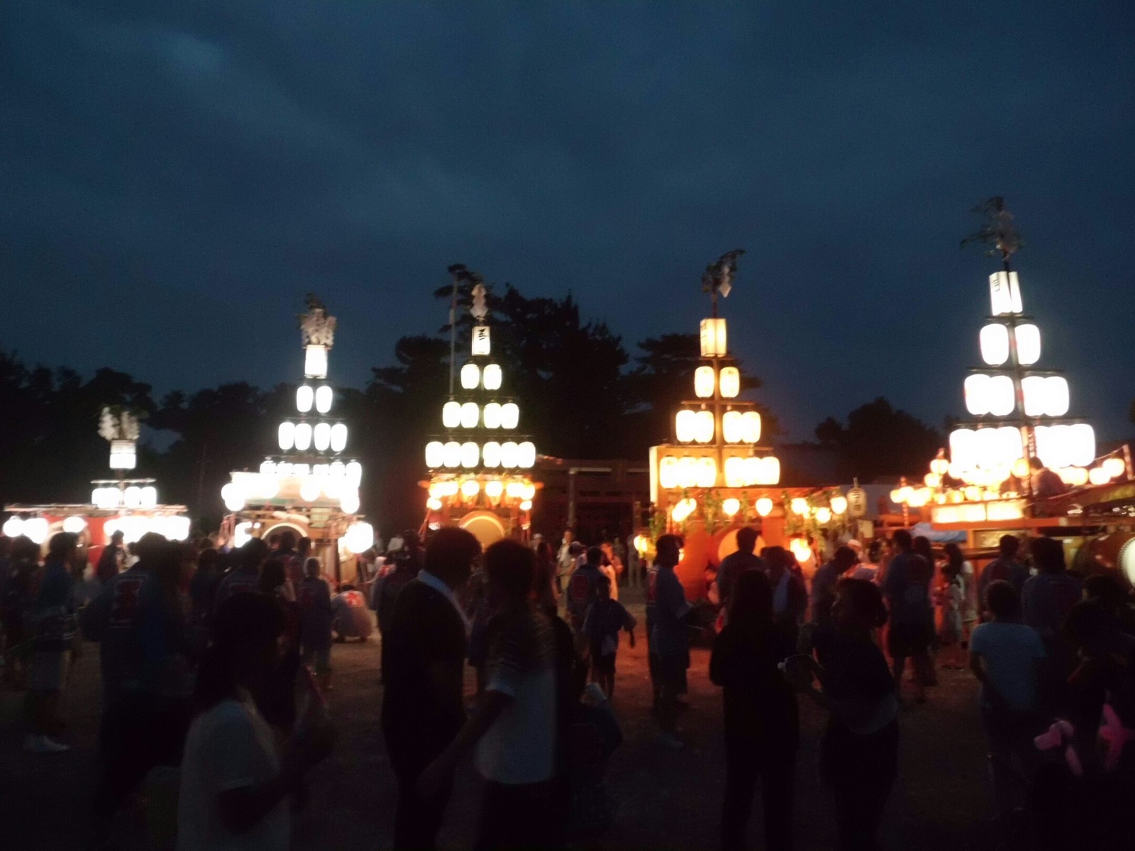 夜7時に河原田神社一の鳥居前に南北の祭車が揃います