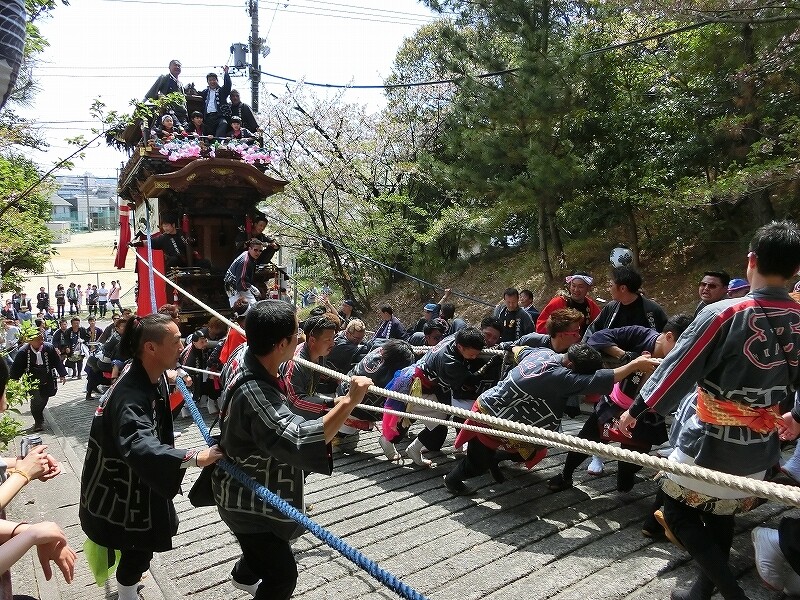 起伏の多い知多半島では急坂の上に神社があることも多く、力一杯曳く姿も見られます。