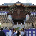 8/7 第五番羽衣の次は第六番西榮町です!第六番 第十組 西榮町蒔絵が多用されている祭車です。大きな太鼓が目立ちます!水引欄間木鼻を取り付けた近代祭車の先駆者的存在です。彫刻は小川光久の作です。本幟です。神社本庁統理 徳川宗敬の書です。替天幕も同字で金刺繍されて ...