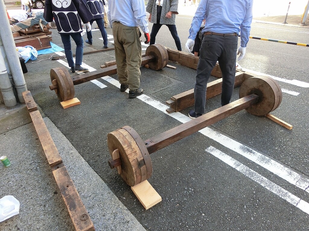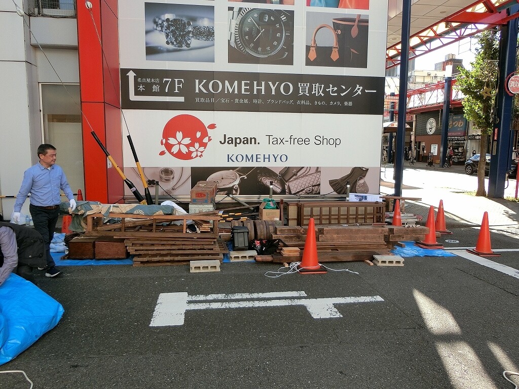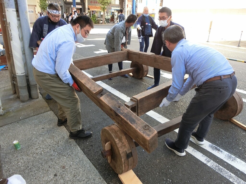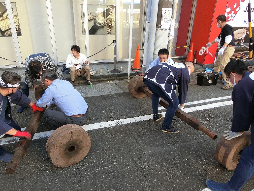 コメ兵本館北側の道で待っていると、組み上げられる市内名古屋型山車の有志メンバーがご到着。