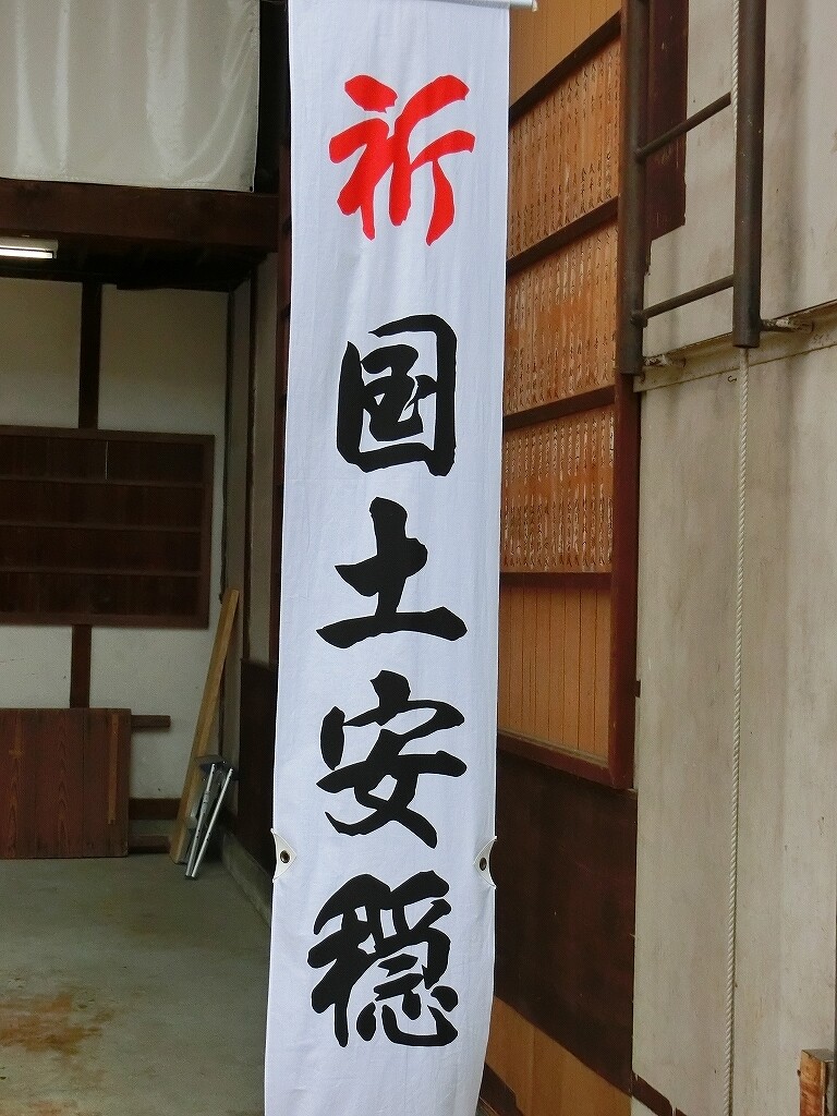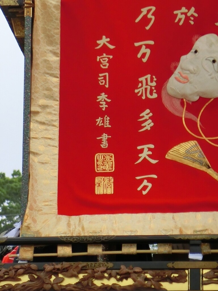 - 追幕(緋羅紗地に続日本後紀15の和歌 那々都義乃 美與爾万和倍留 毛々知阿萬利 止遠乃於支奈乃 万飛多天万津流(ななつぎの みやにまわえる ももちあまり とのおきなの まひたてまつる)と翁面の刺繍 熱田神宮大宮司千秋季雄筆)