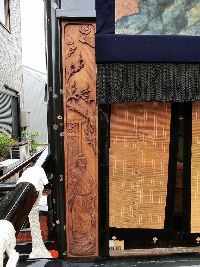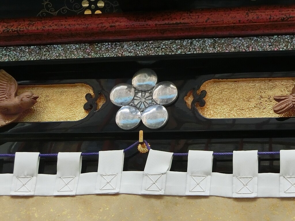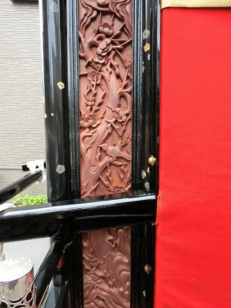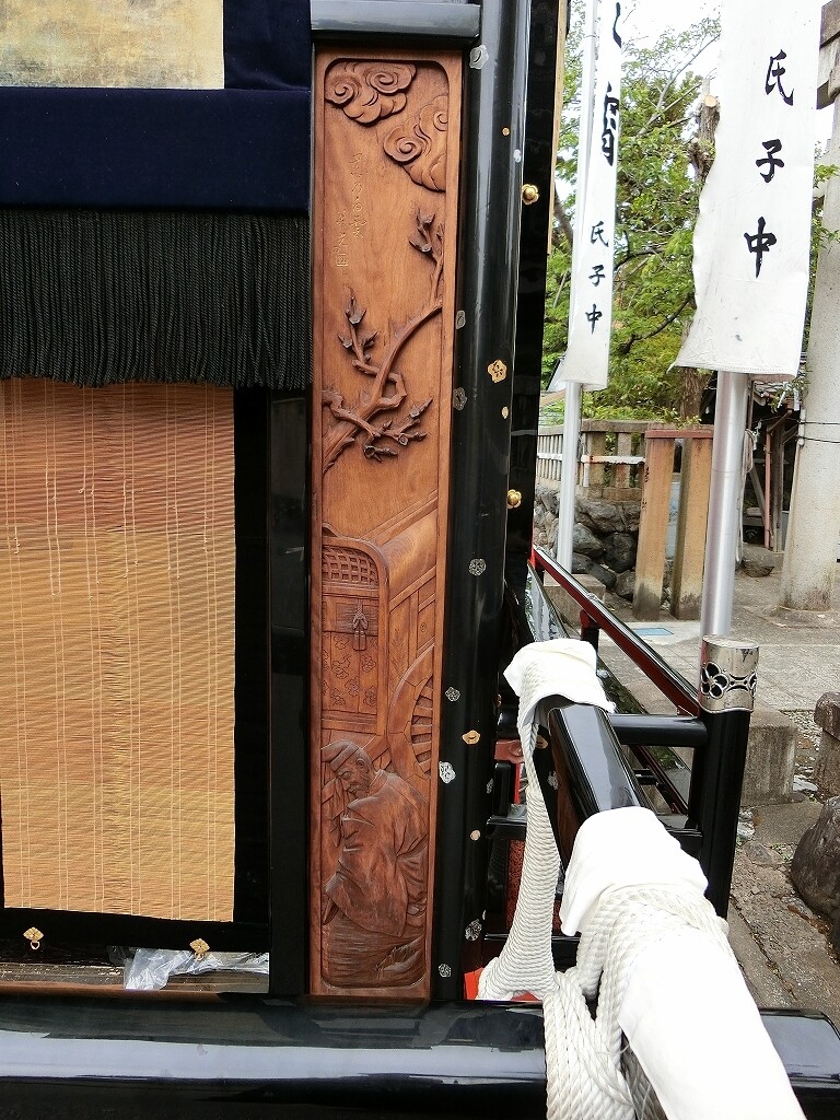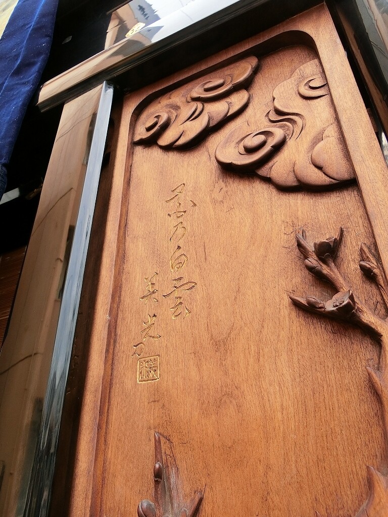 後軕は天神神社に因んだ、梅に鶯や菅原道真公の彫刻です。