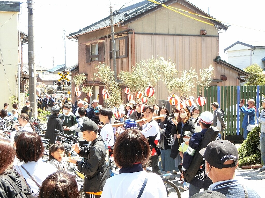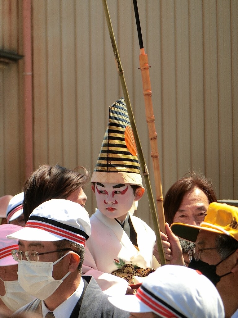 市場組は笹提燈を持ちながら、子供三番叟と共に神社へやって来ました。