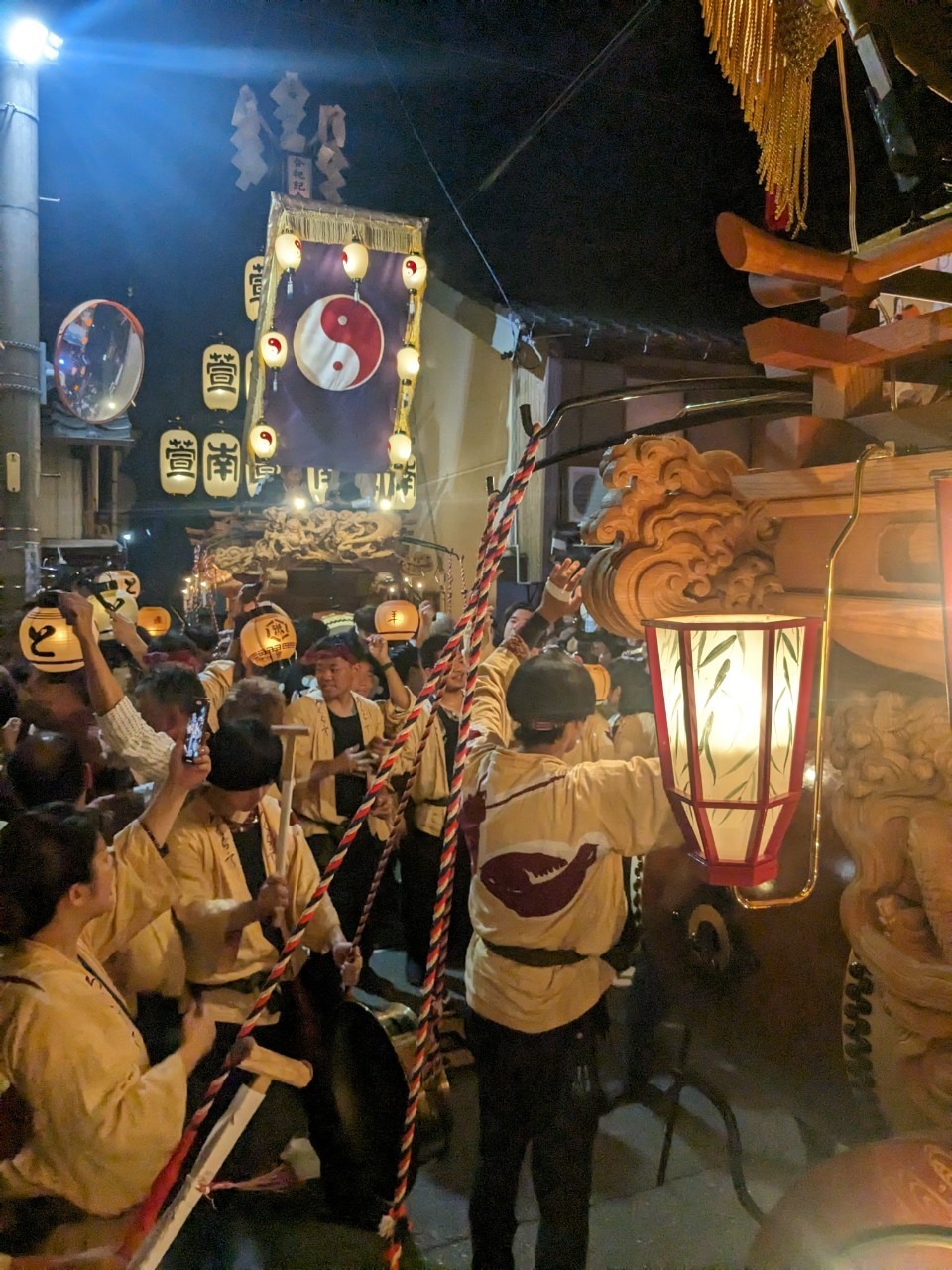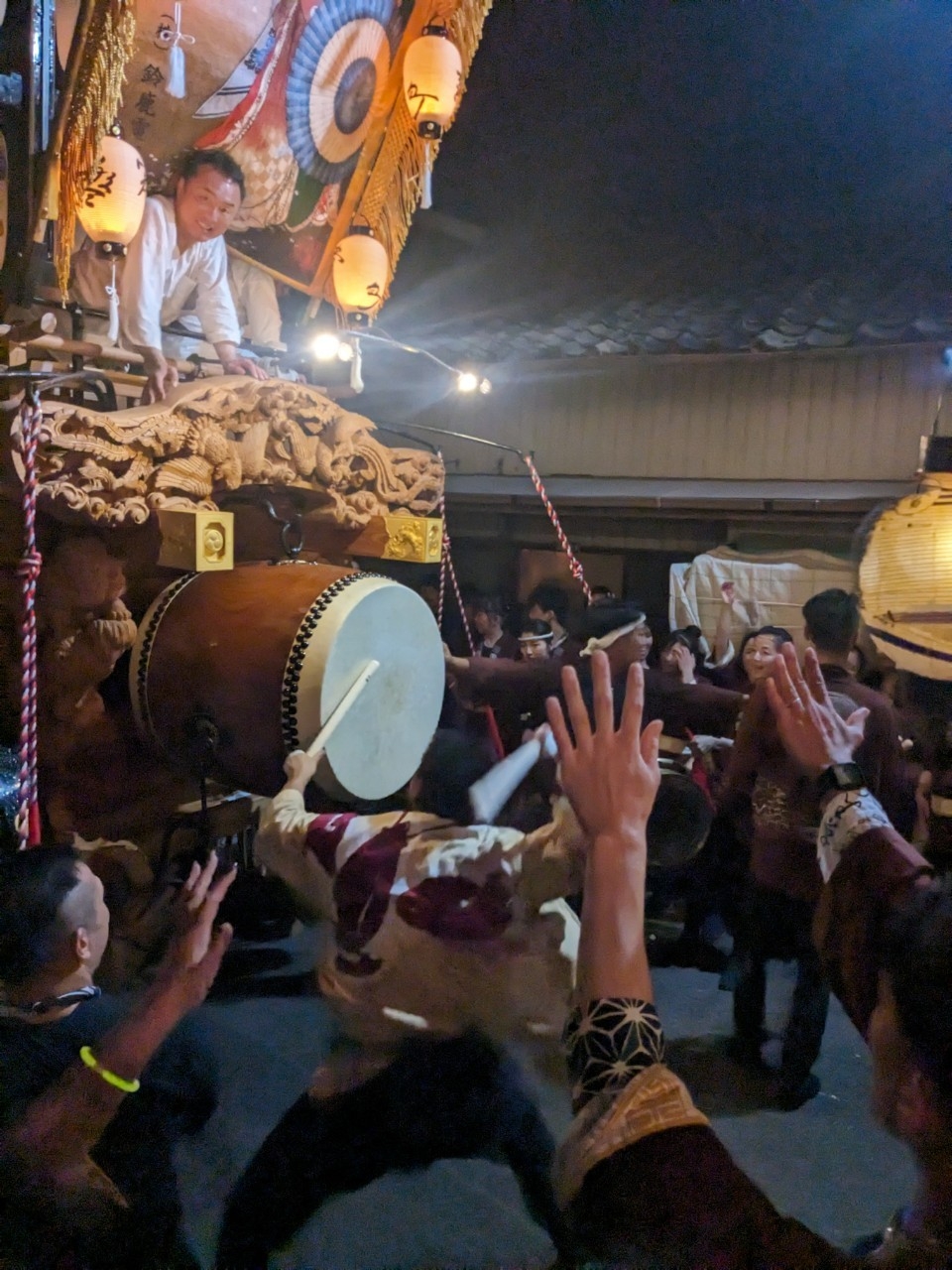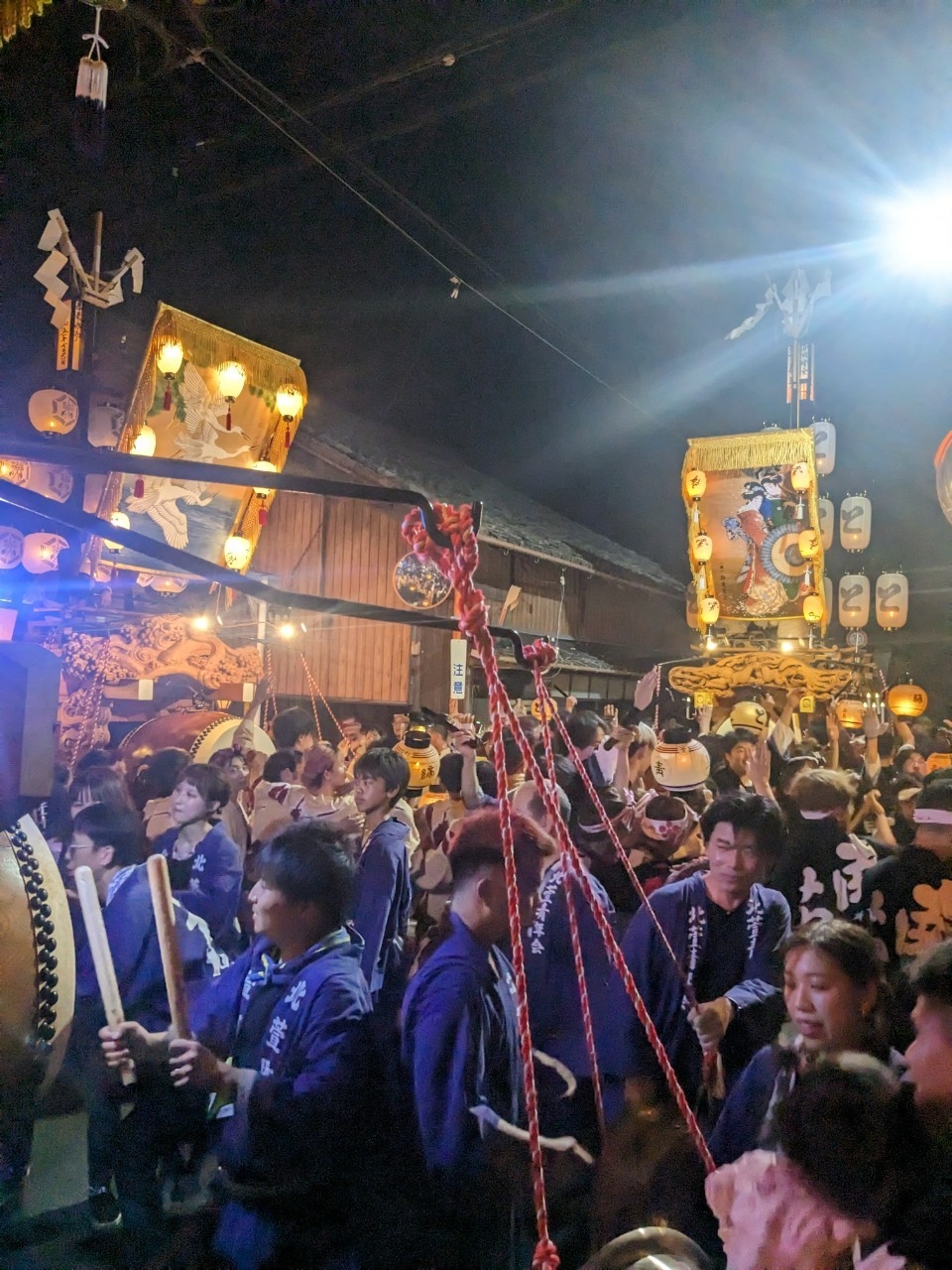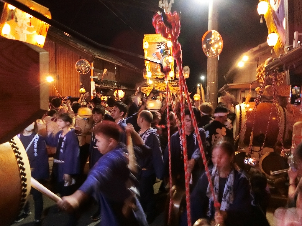 そこに町内で午前0時まで囃していた北萱町が、祭車庫へ帰ってきました。