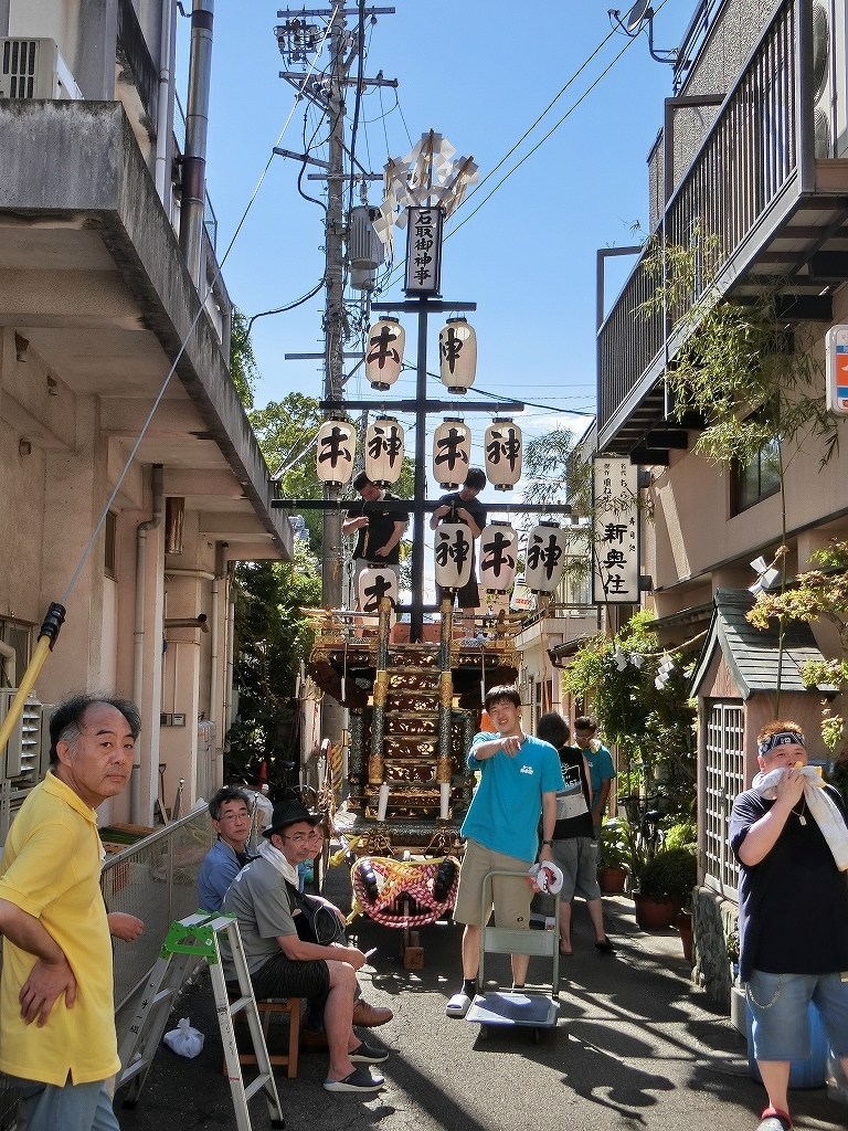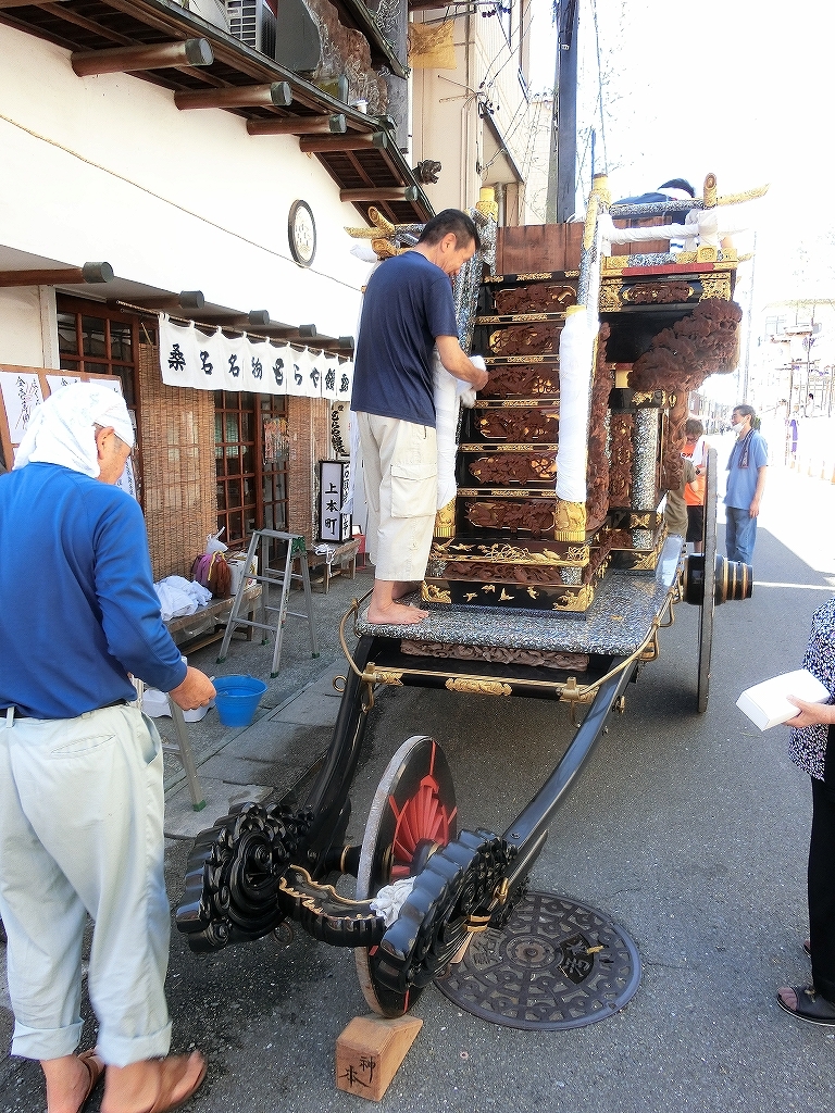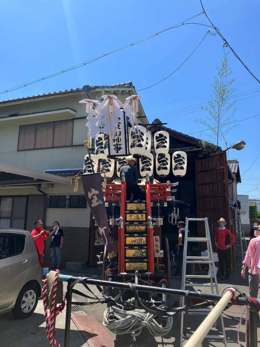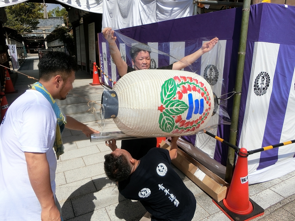 以前は叩き出し直前に山形提燈を飾っていましたが、現在は雨の心配がない年は早めに飾る事が多くなりました。