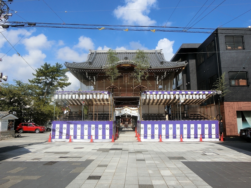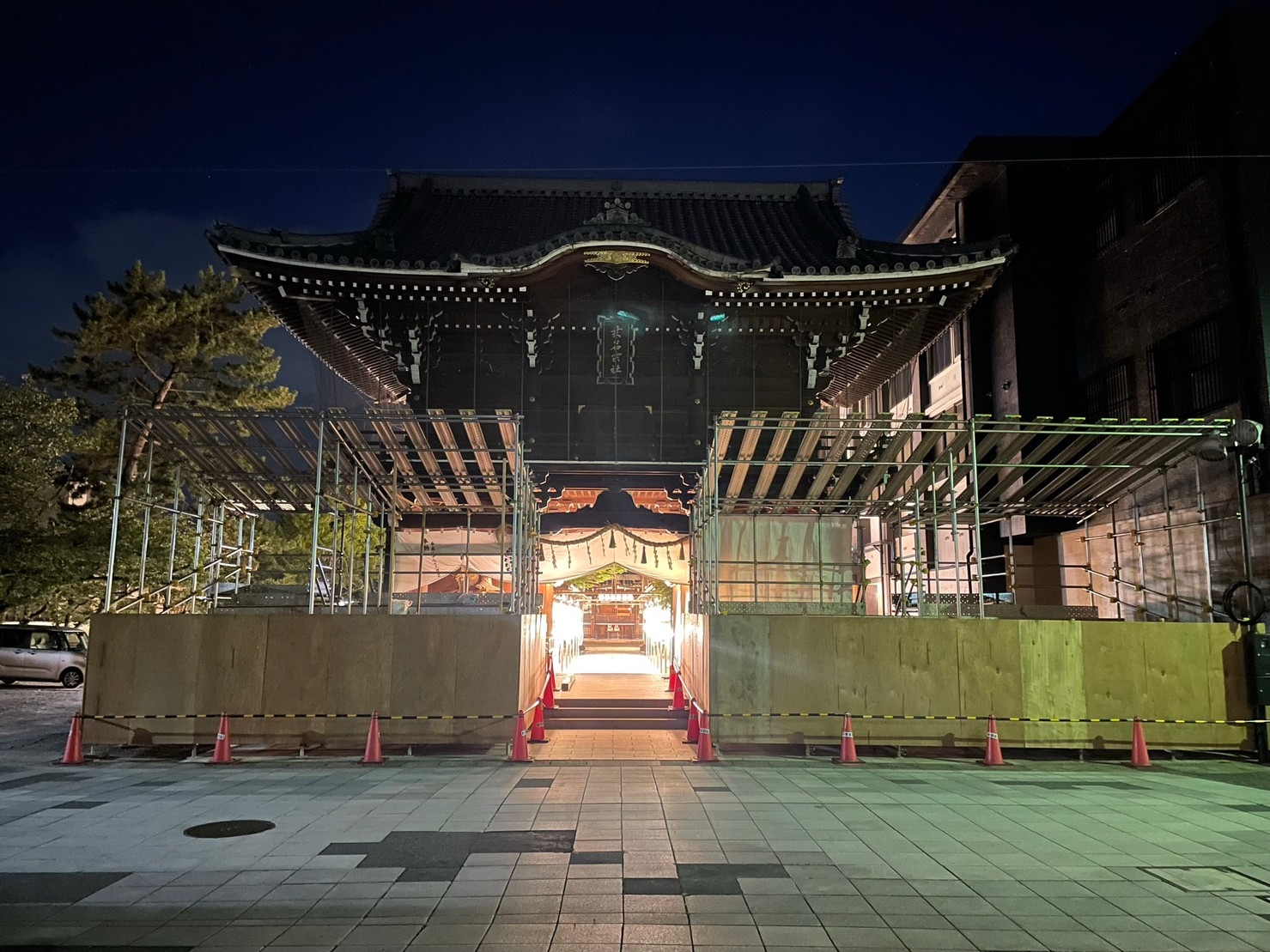 神社清掃が行われた翌日より、楼門前に桟敷席の建設が始まります!