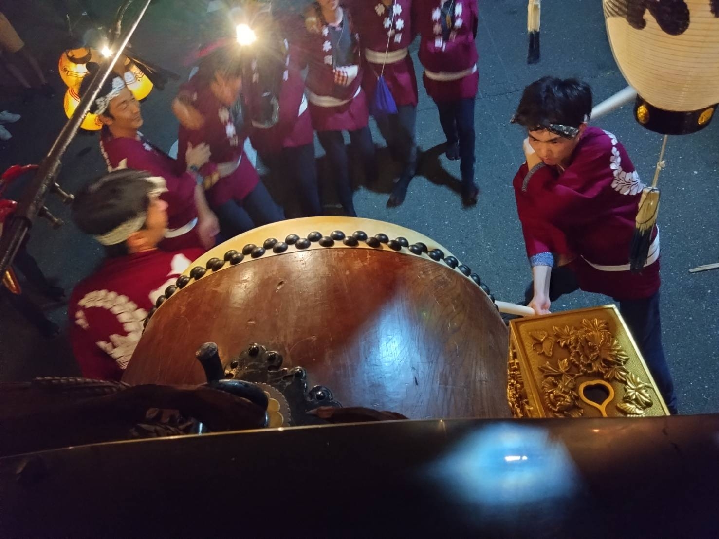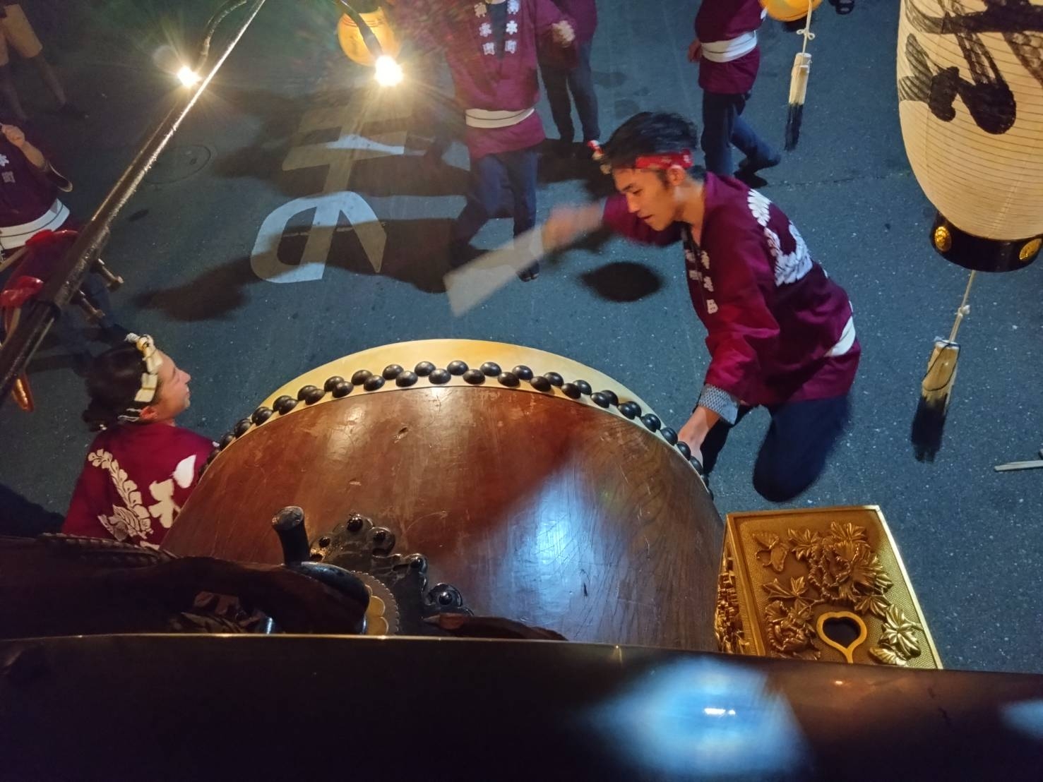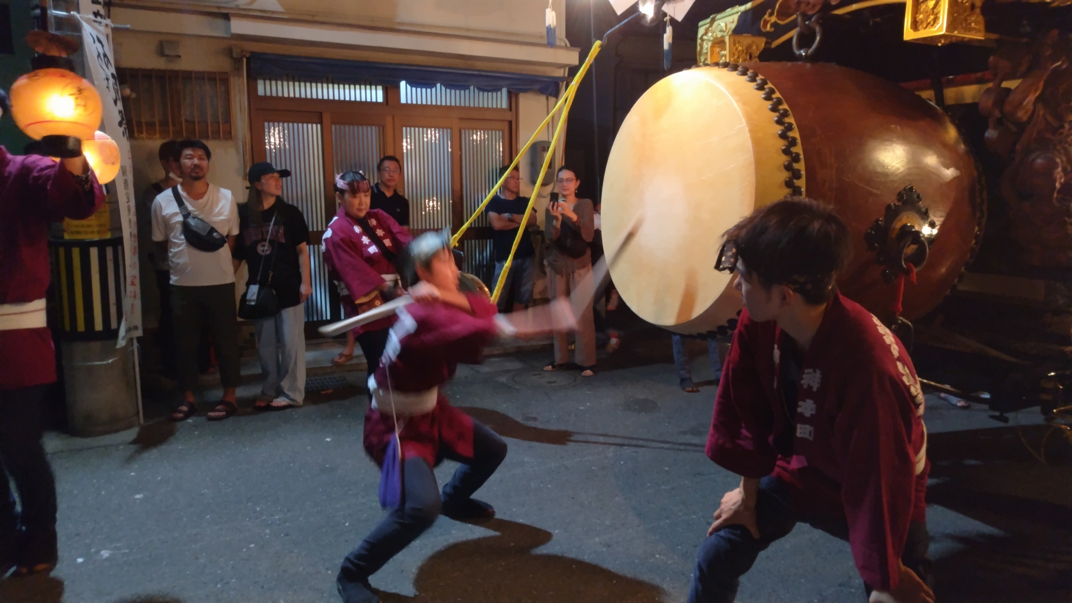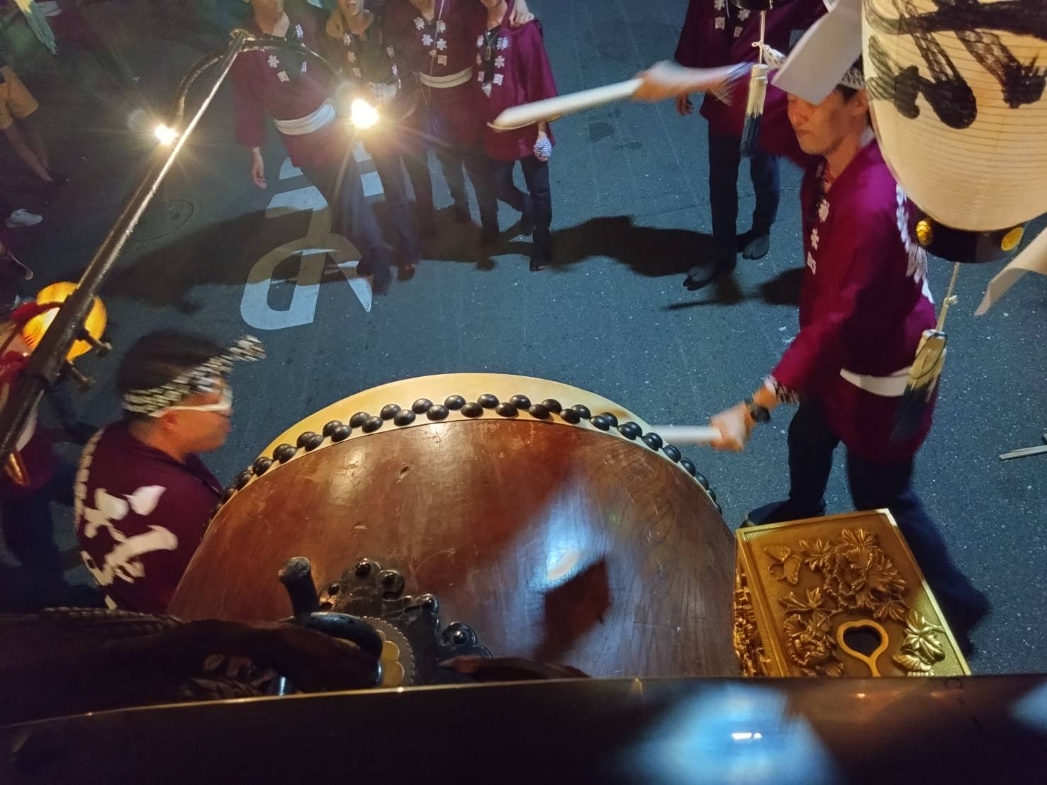 午前0時頃の神楽太鼓の合図で赤提燈が振られ、一斉に叩き出します。