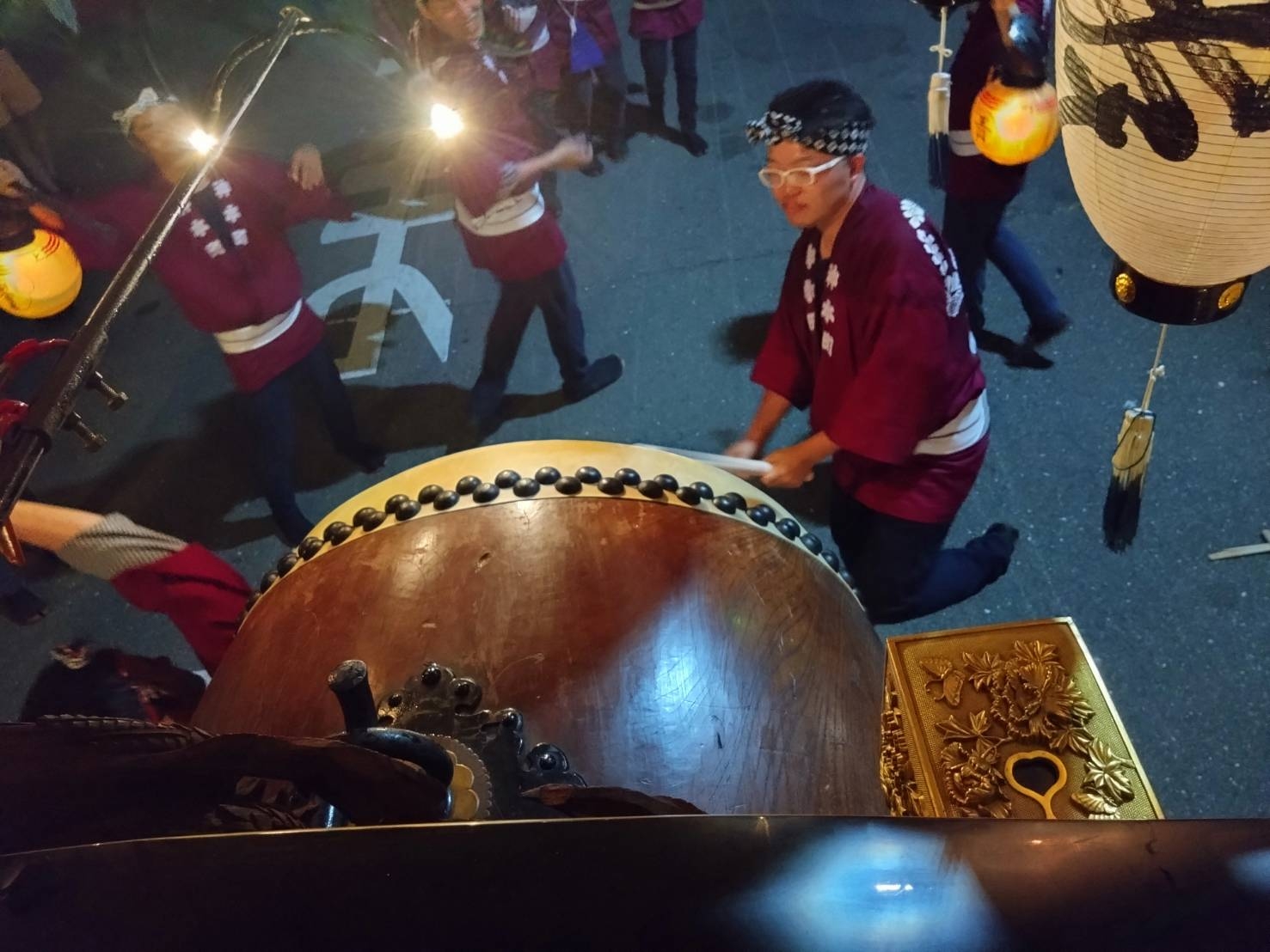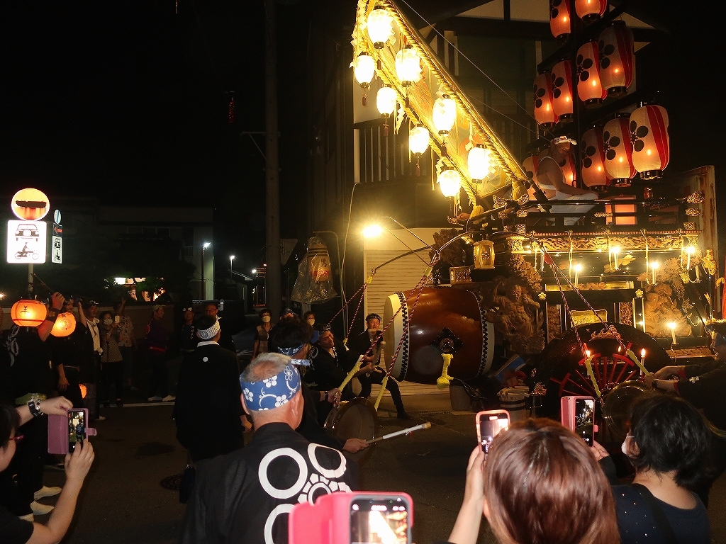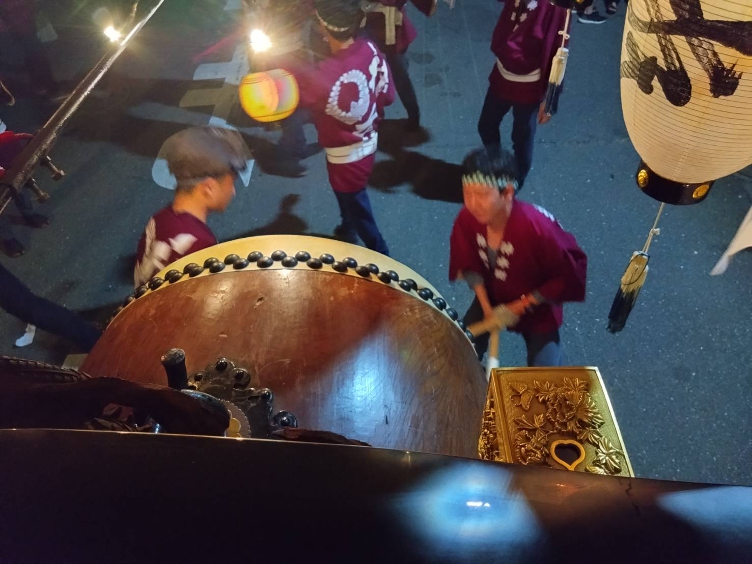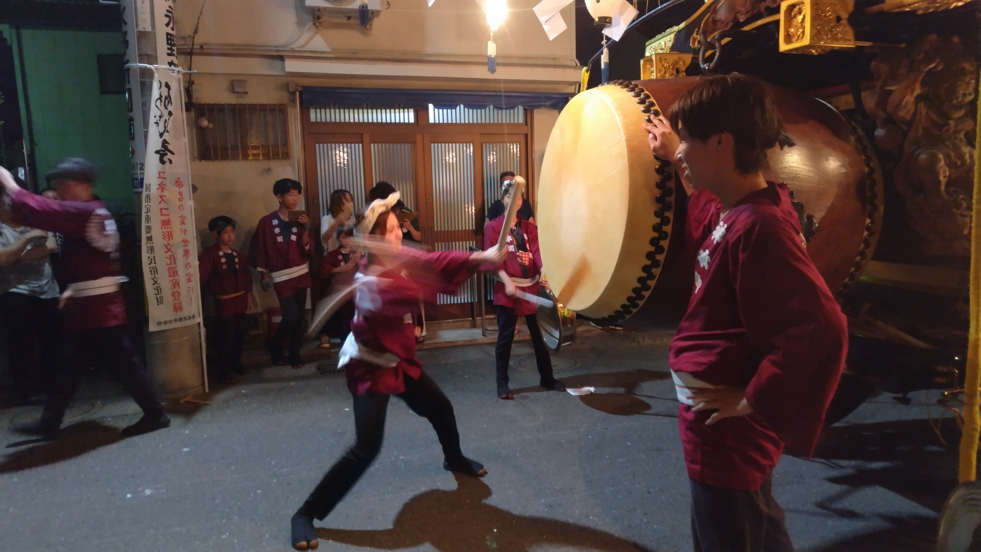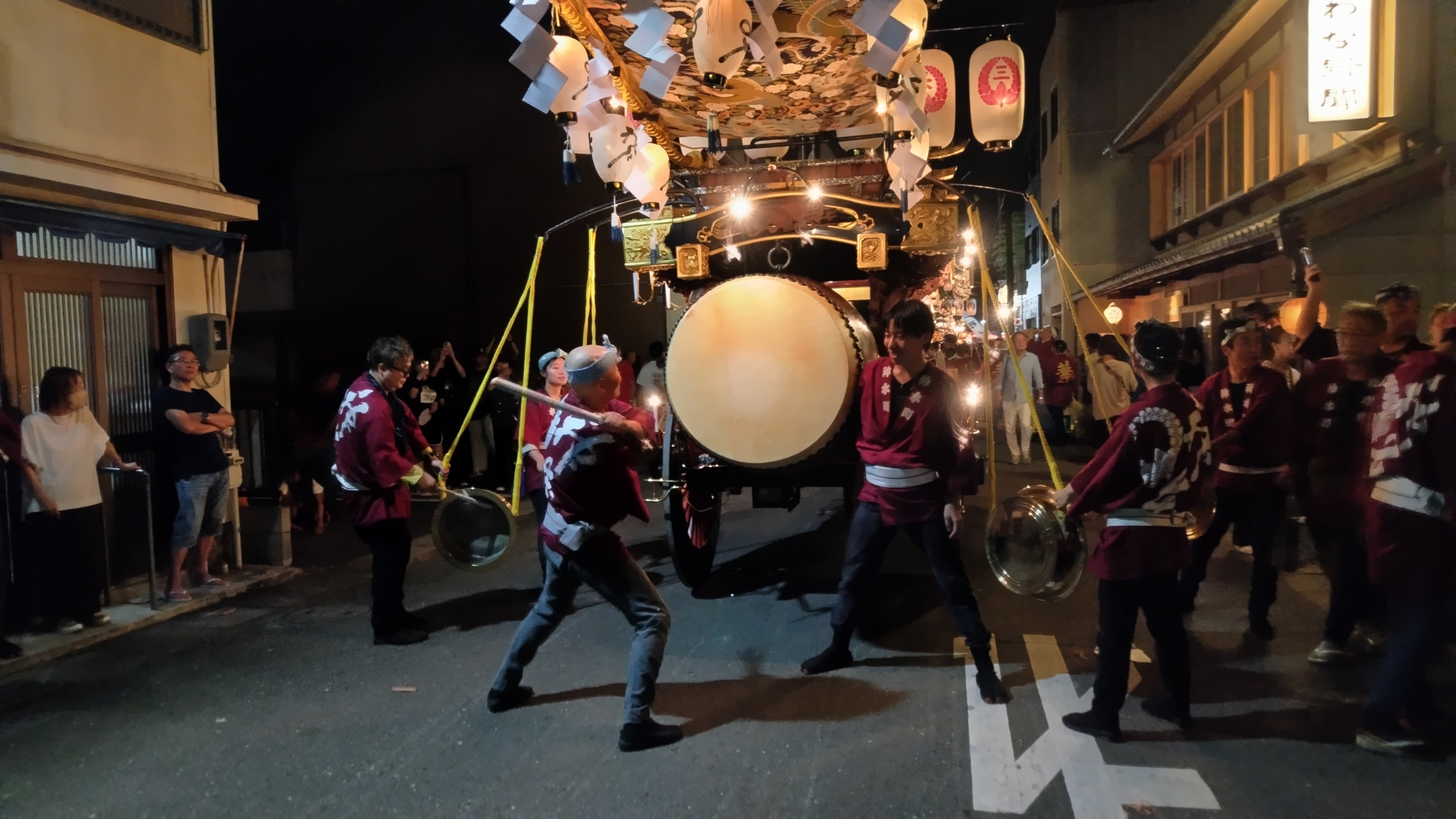 午前0時頃の神楽太鼓の合図で赤提燈が振られ、一斉に叩き出します。