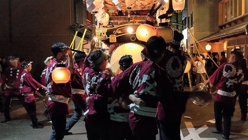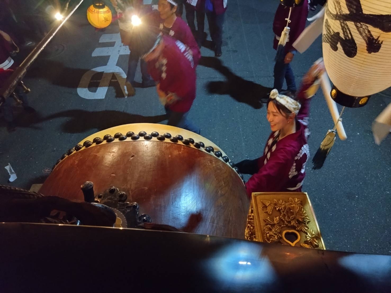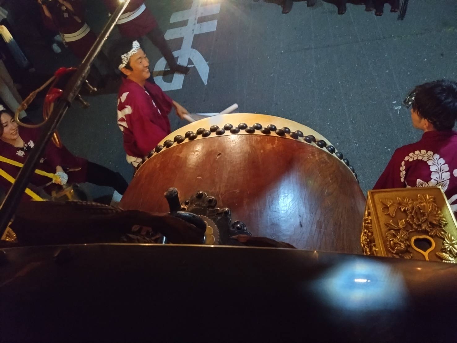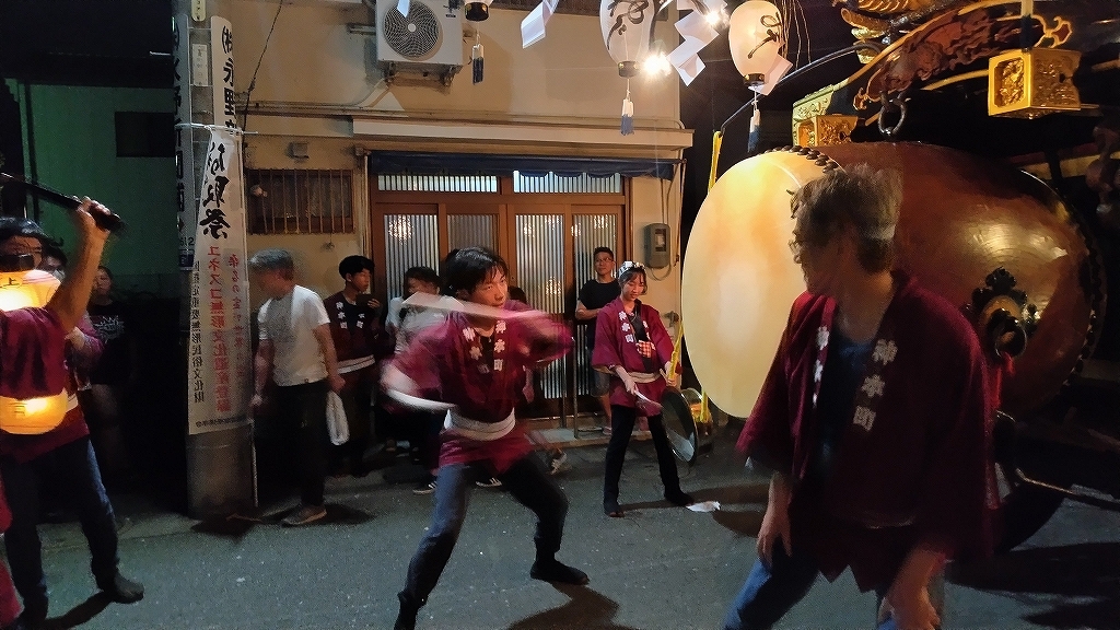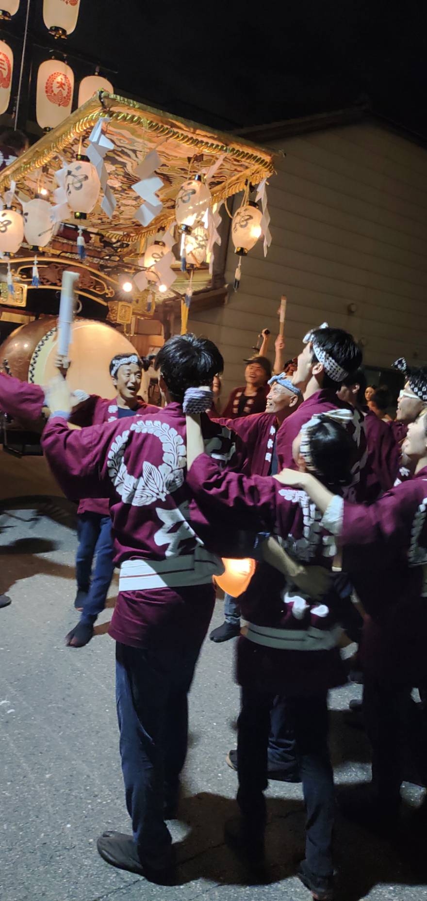 午前0時頃の神楽太鼓の合図で赤提燈が振られ、一斉に叩き出します。