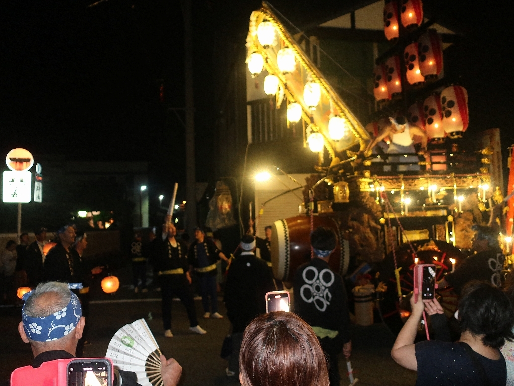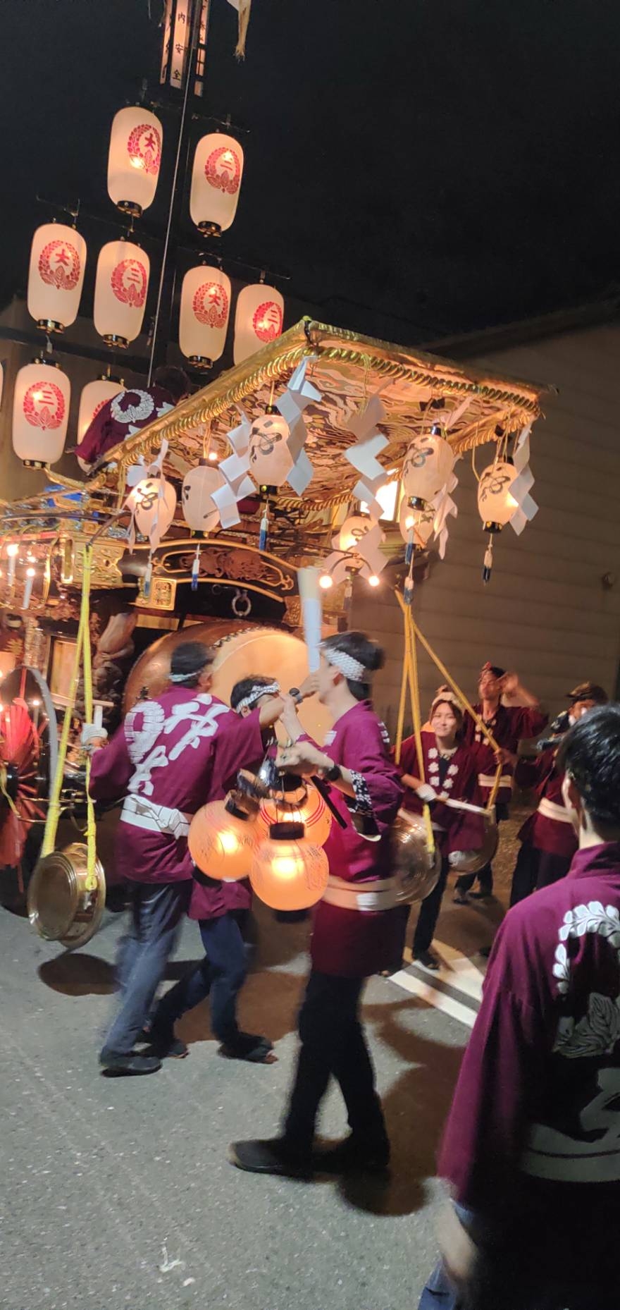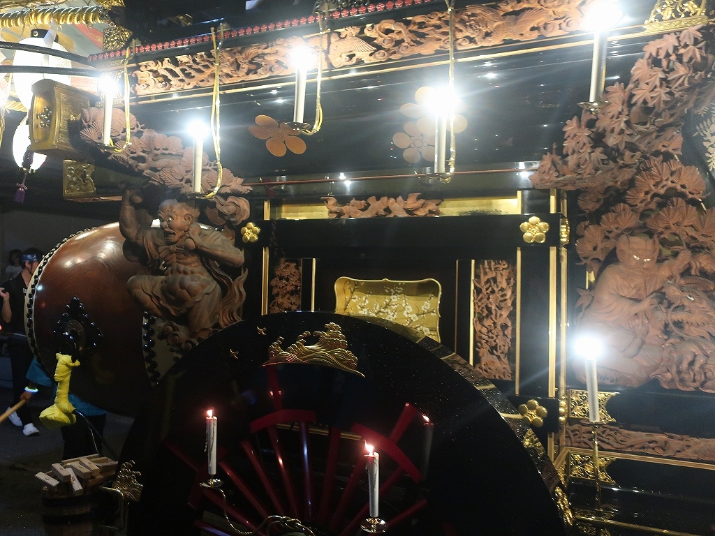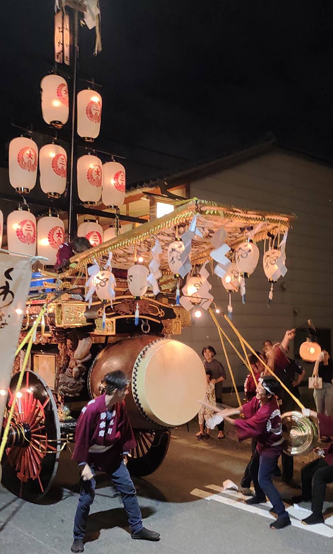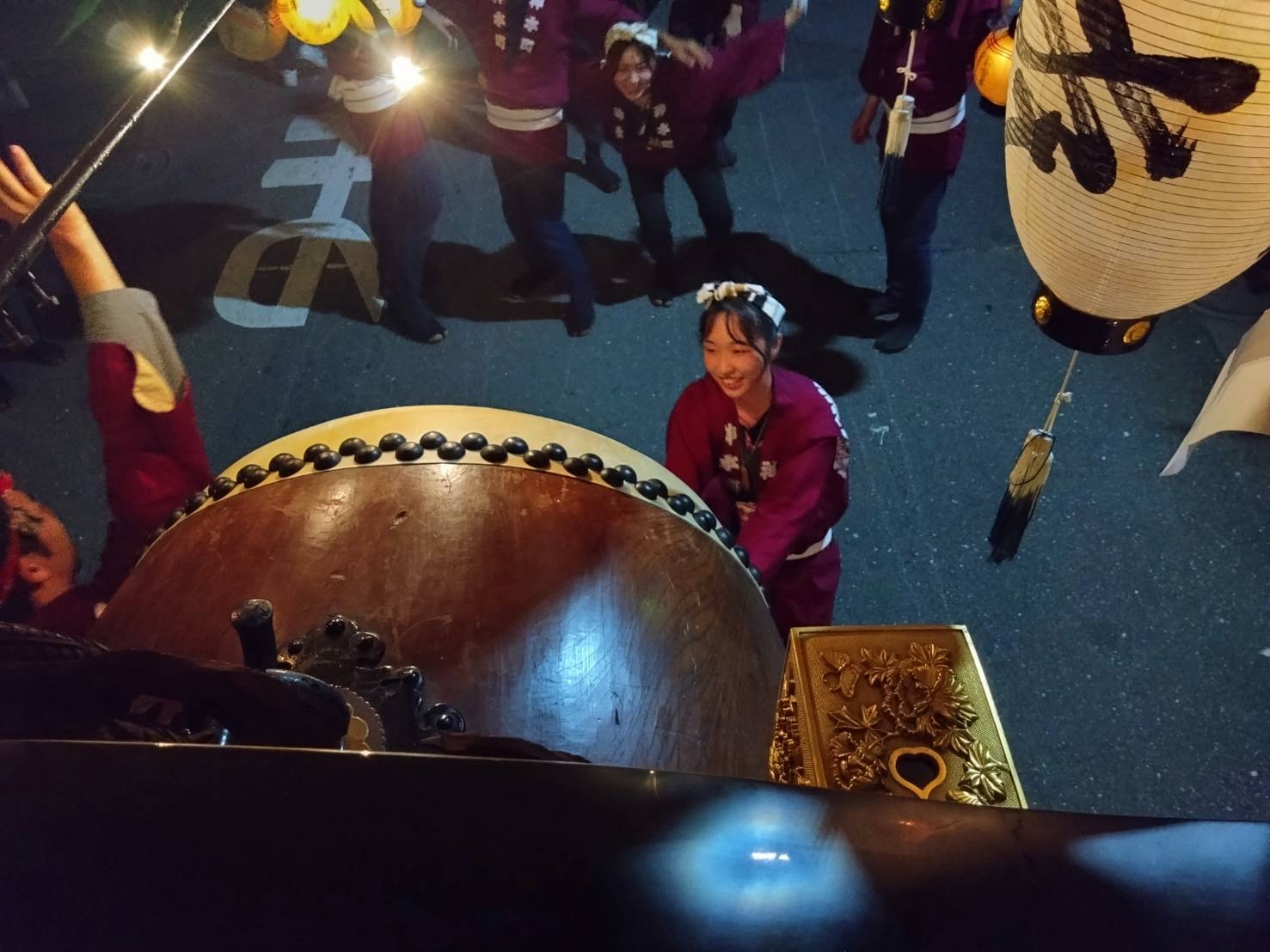 午前0時頃の神楽太鼓の合図で赤提燈が振られ、一斉に叩き出します。