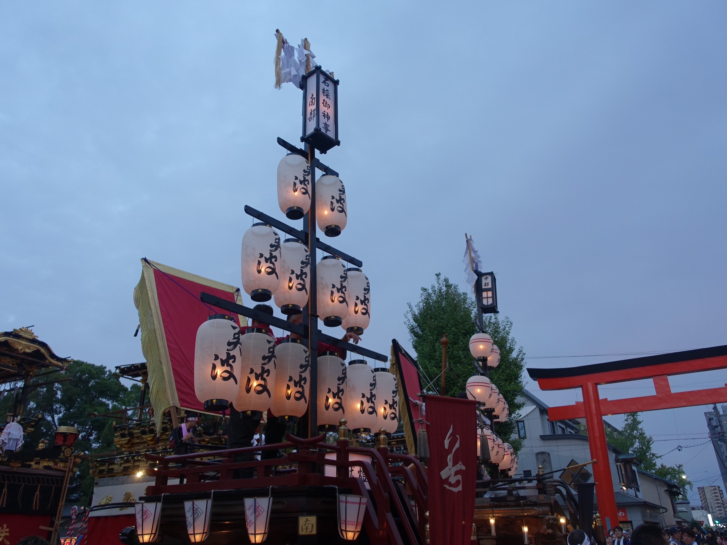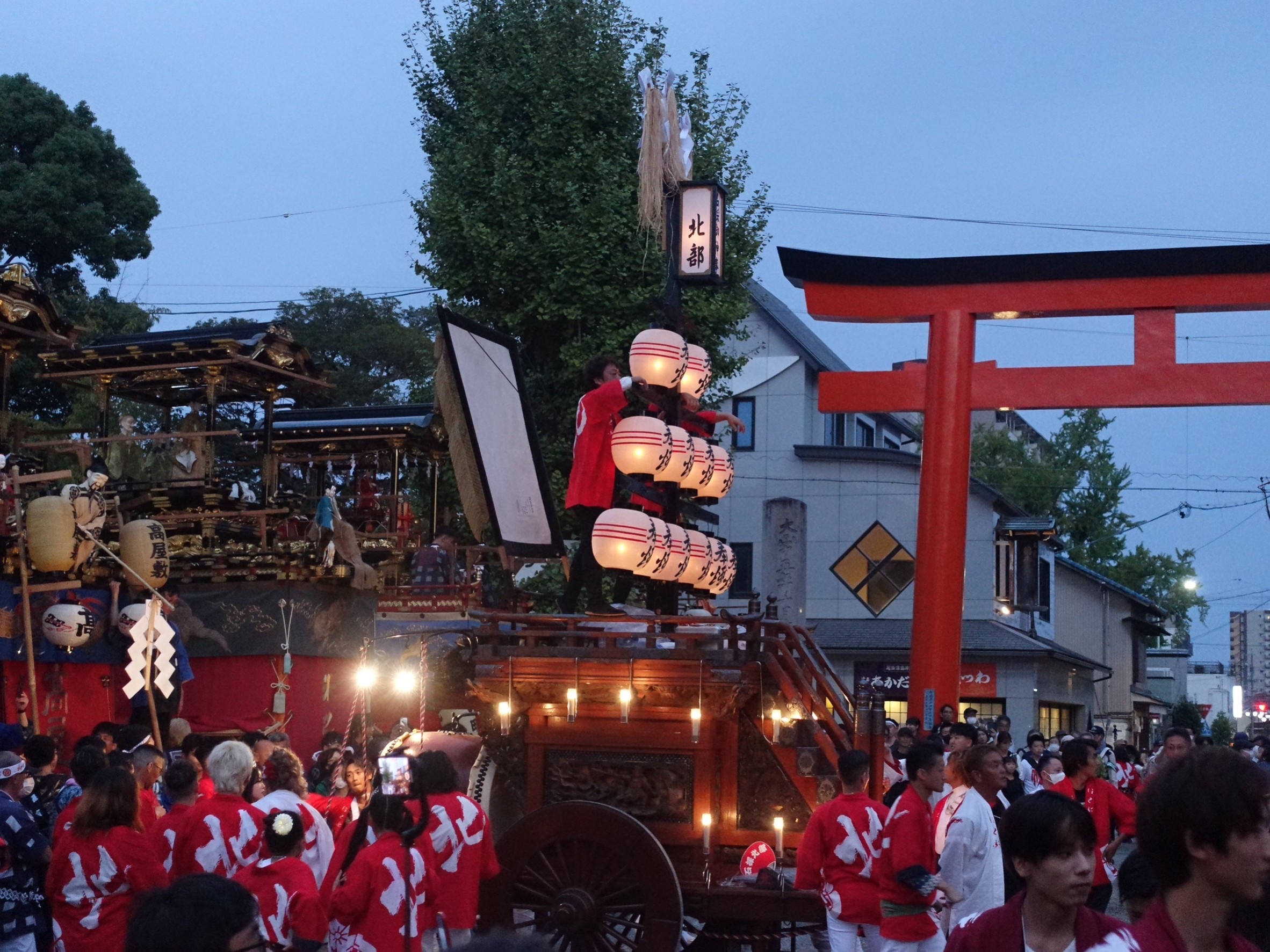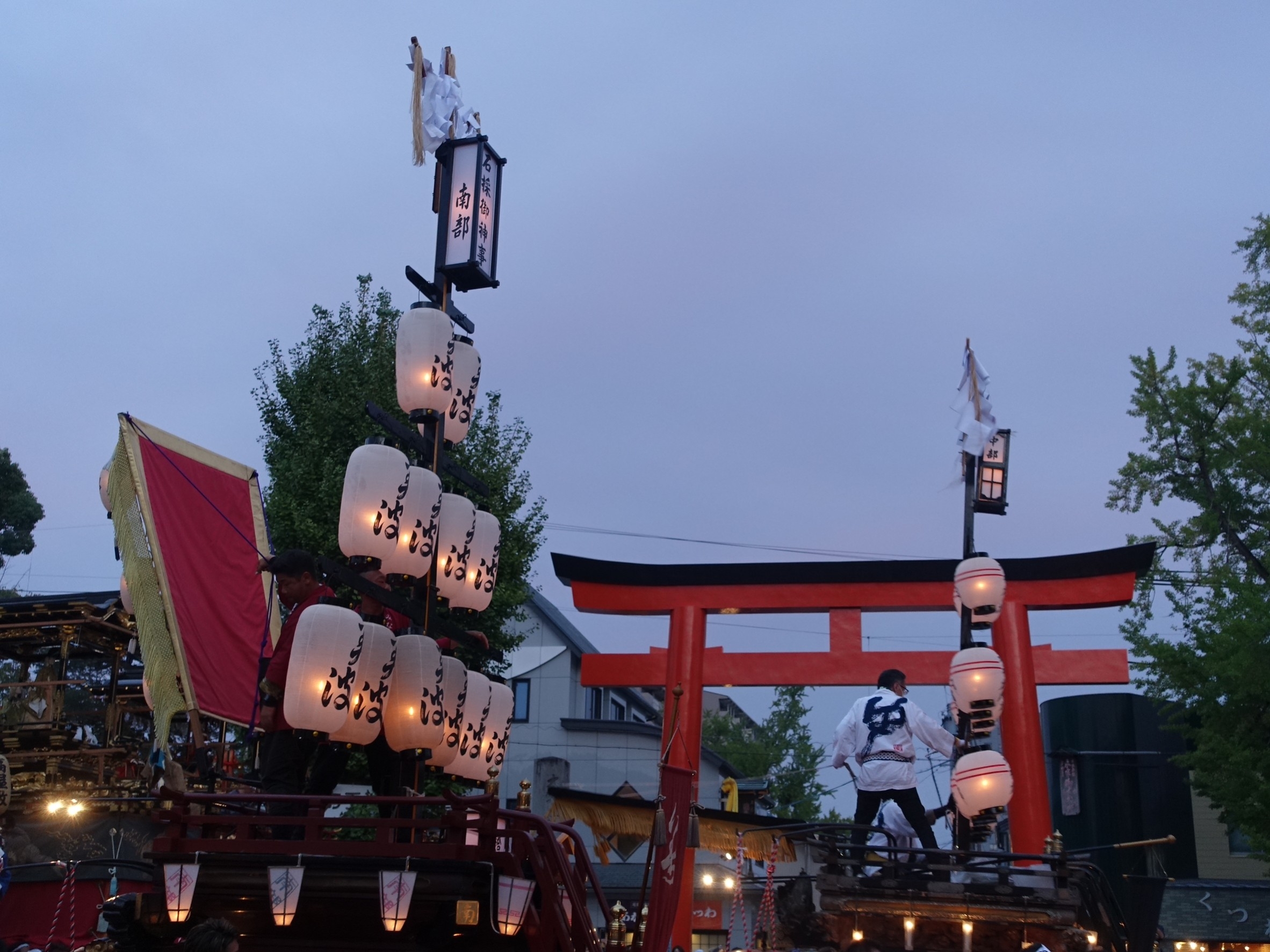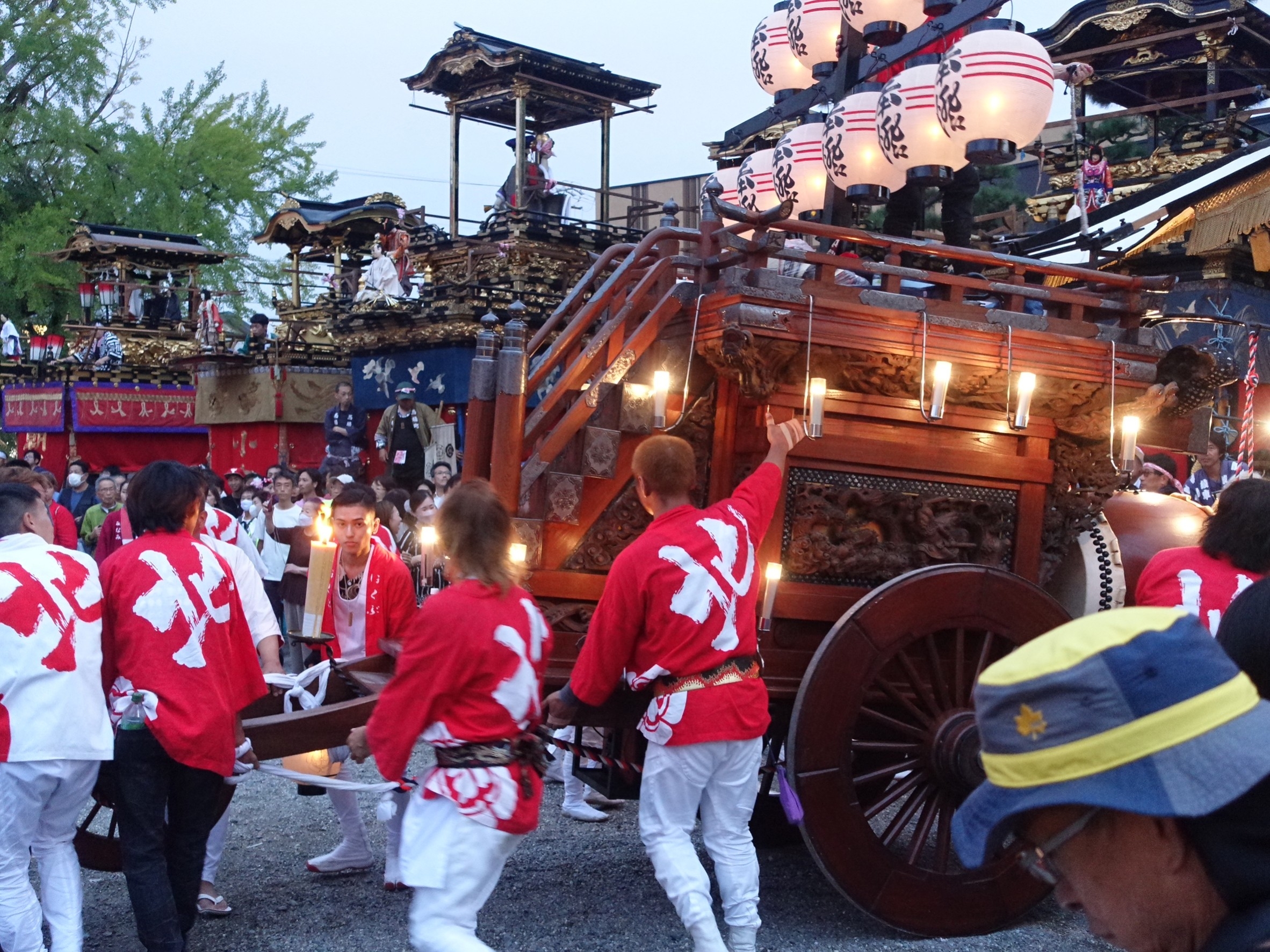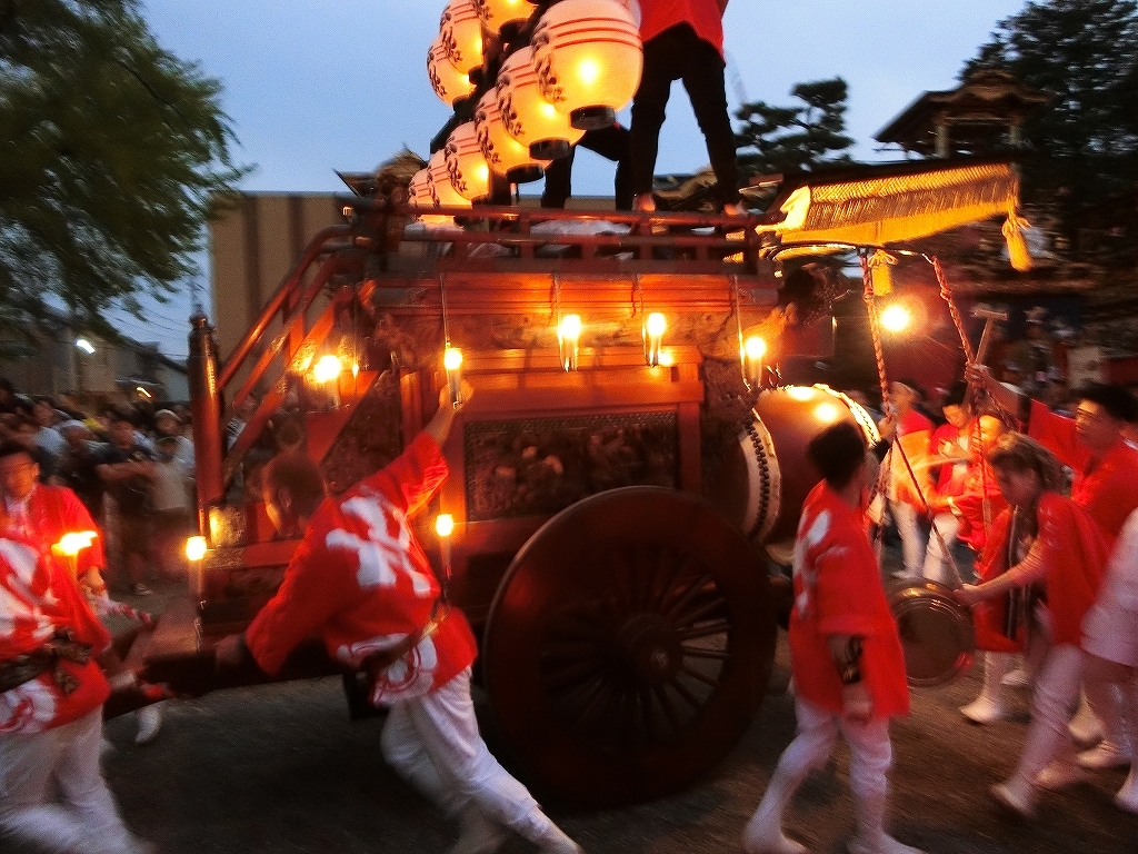 楼門前を出ると、3台の祭車が御祝儀の出たあちこちの山車前に向かいます。