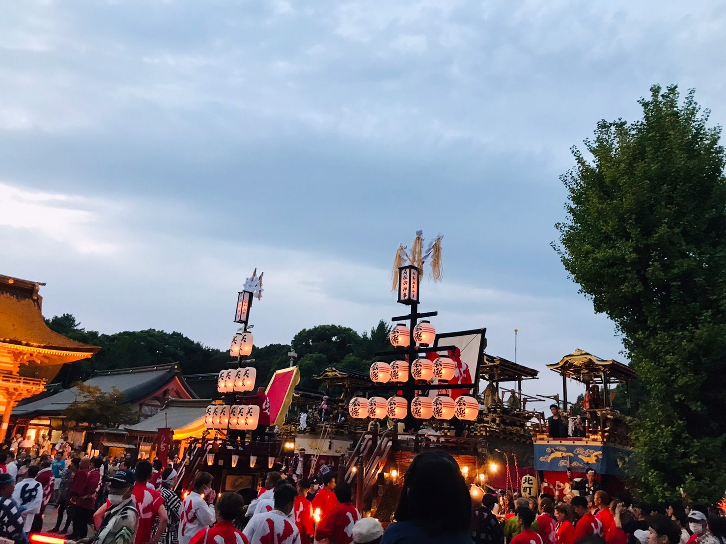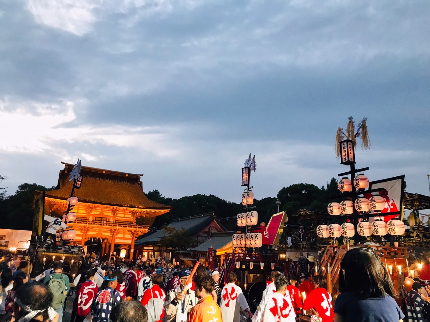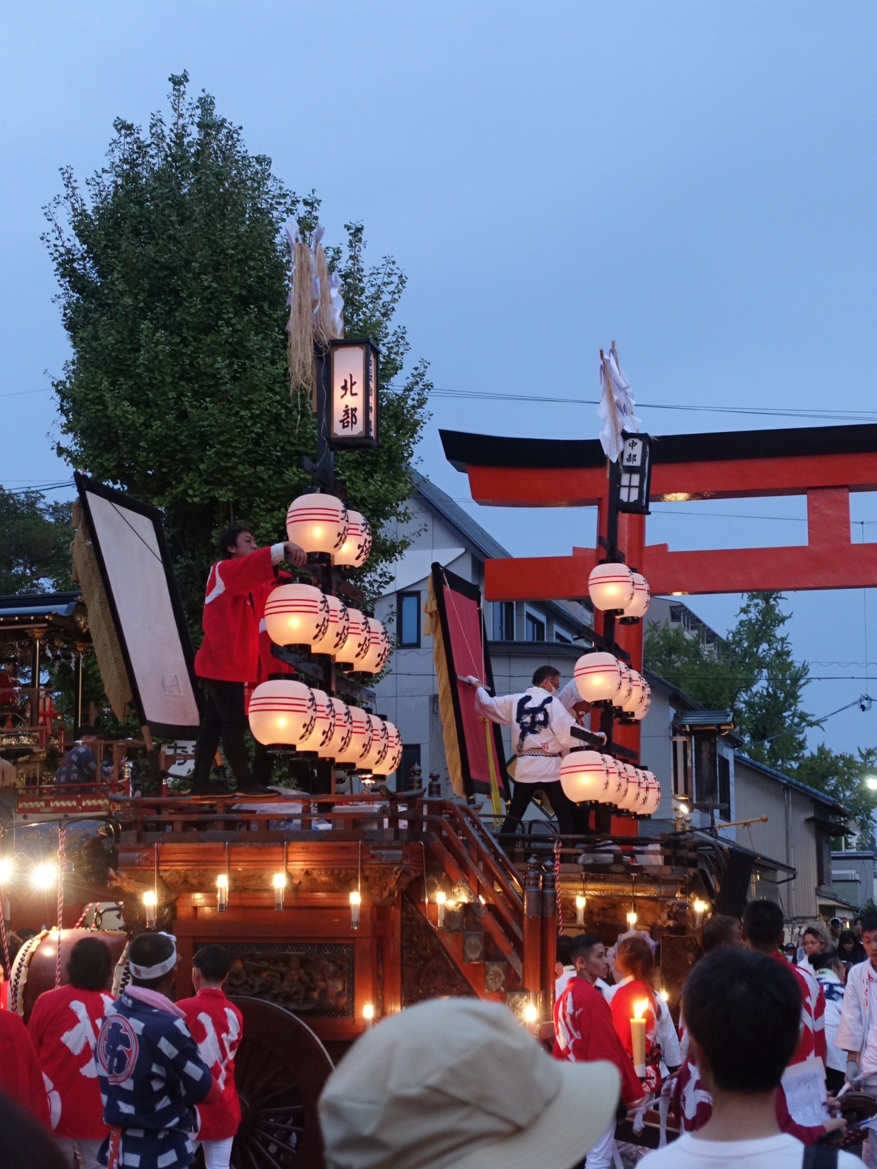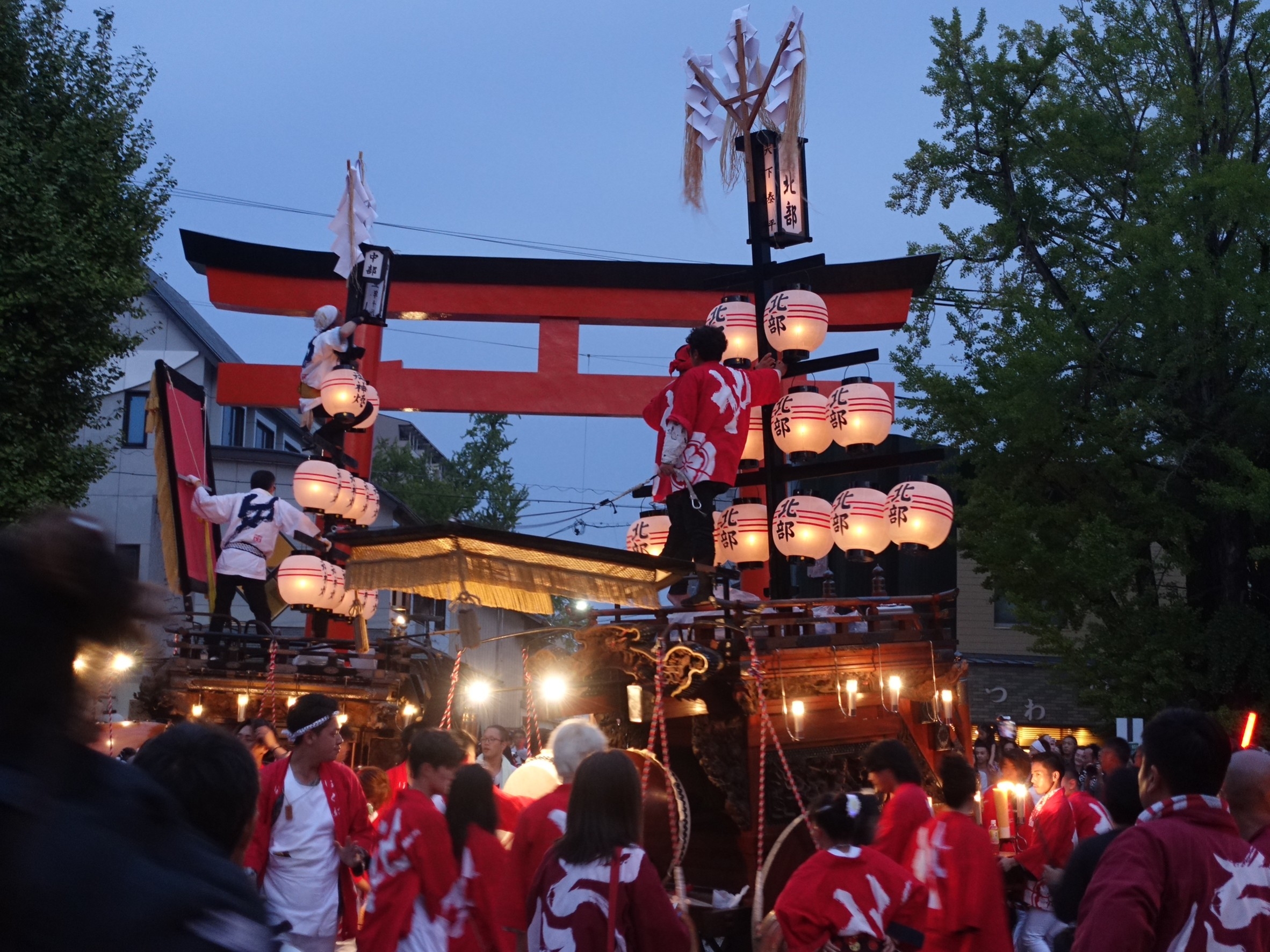 楼門前を出ると、3台の祭車が御祝儀の出たあちこちの山車前に向かいます。