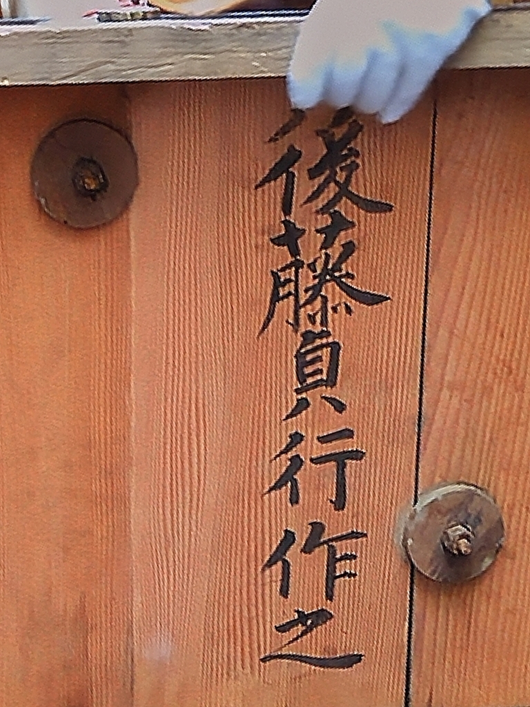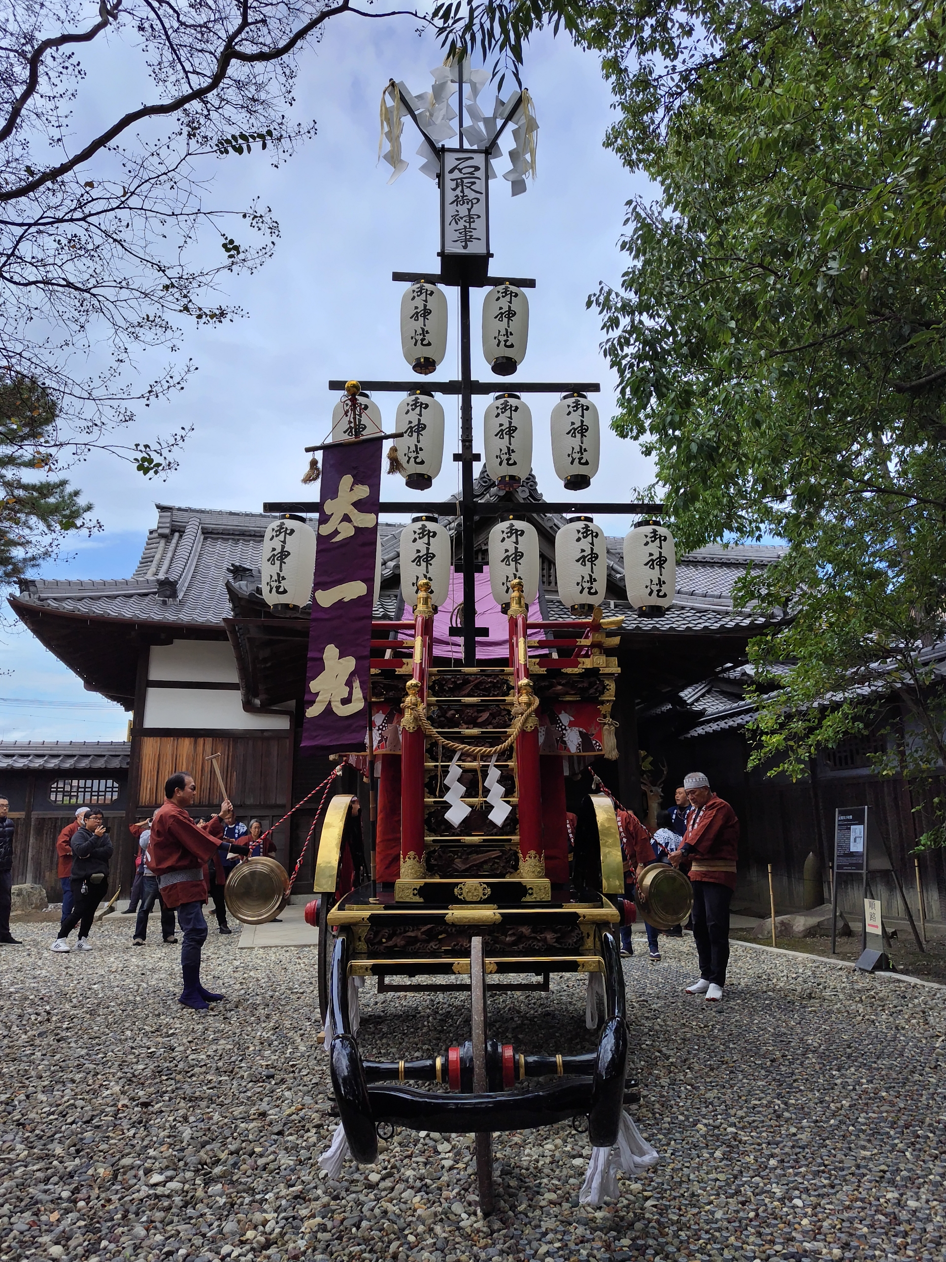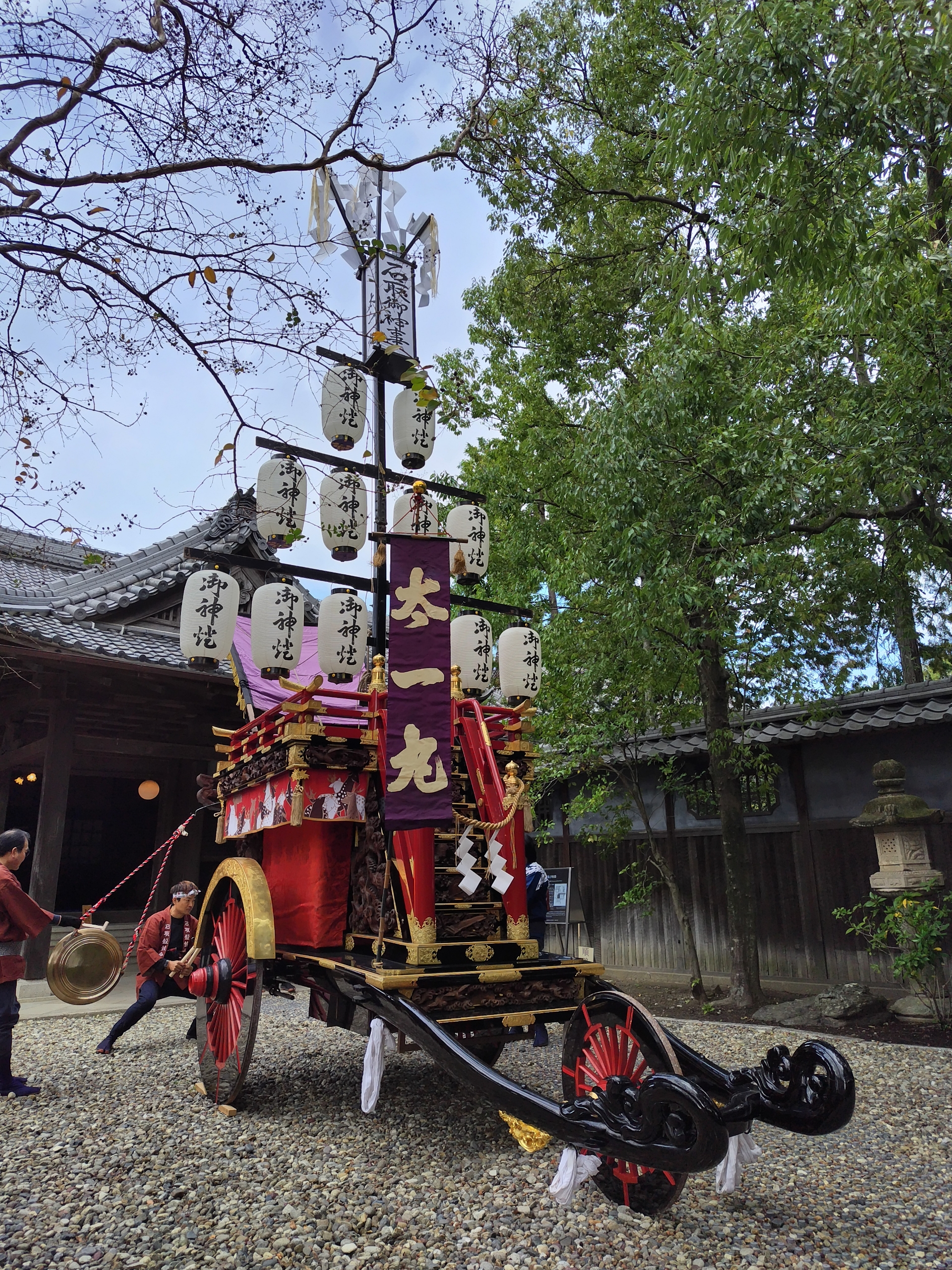 小雨が降る心配がある中、御殿玄関前に石取祭車(旧太一丸使用)が曳き込まれました。
