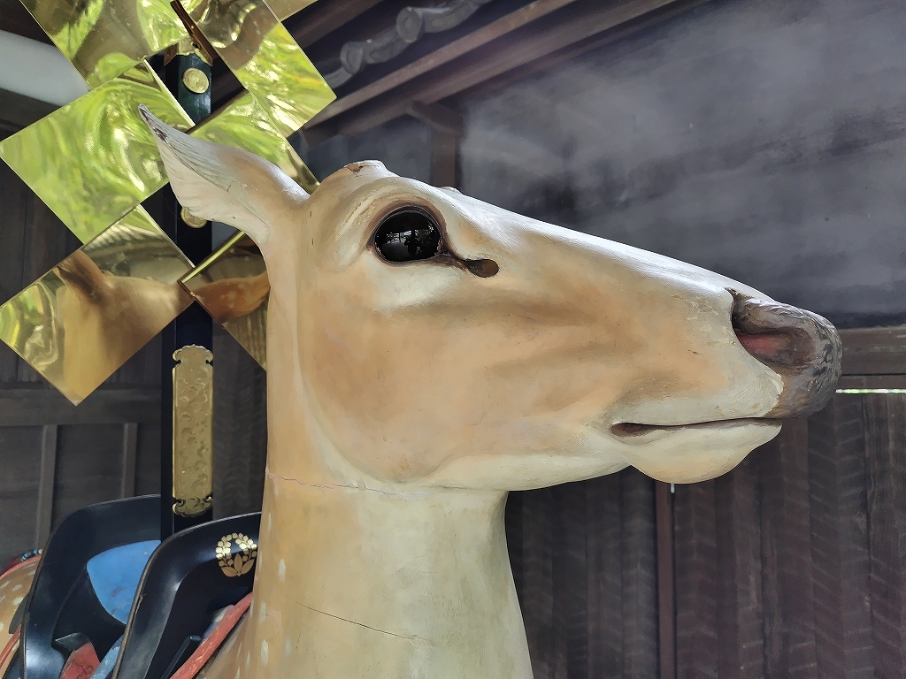 庭園内に曳き込んでから造りに神鹿を乗せればいいと思われるかもしれませんが、神鹿は祭車庫2階より吊り下げて祭車に乗せるため、地上から人力でリフトアップは無理なのです。