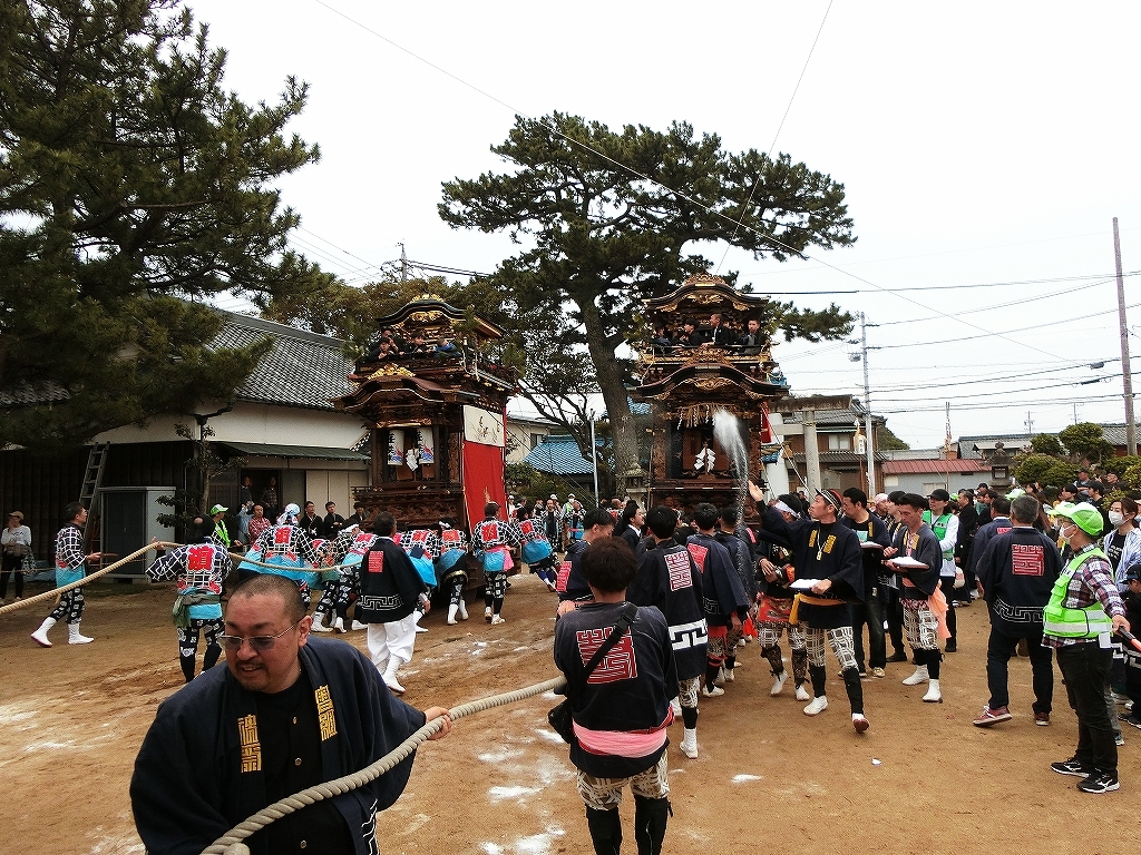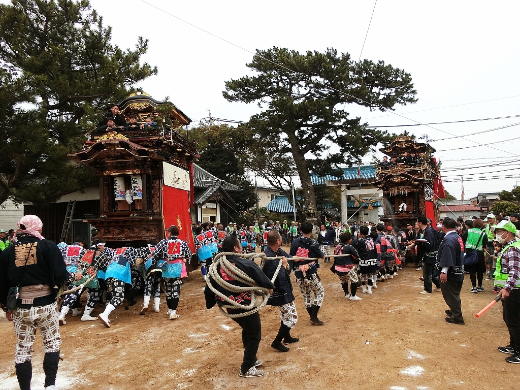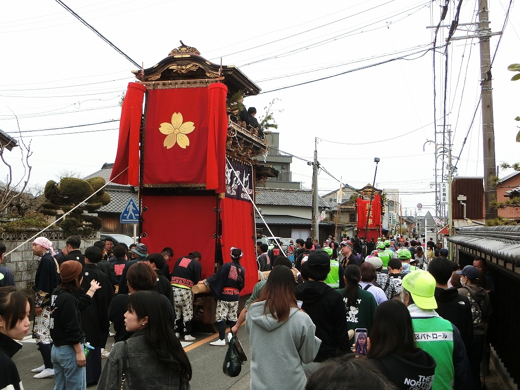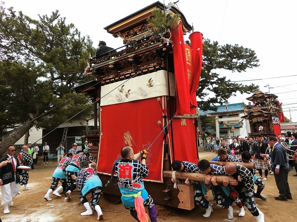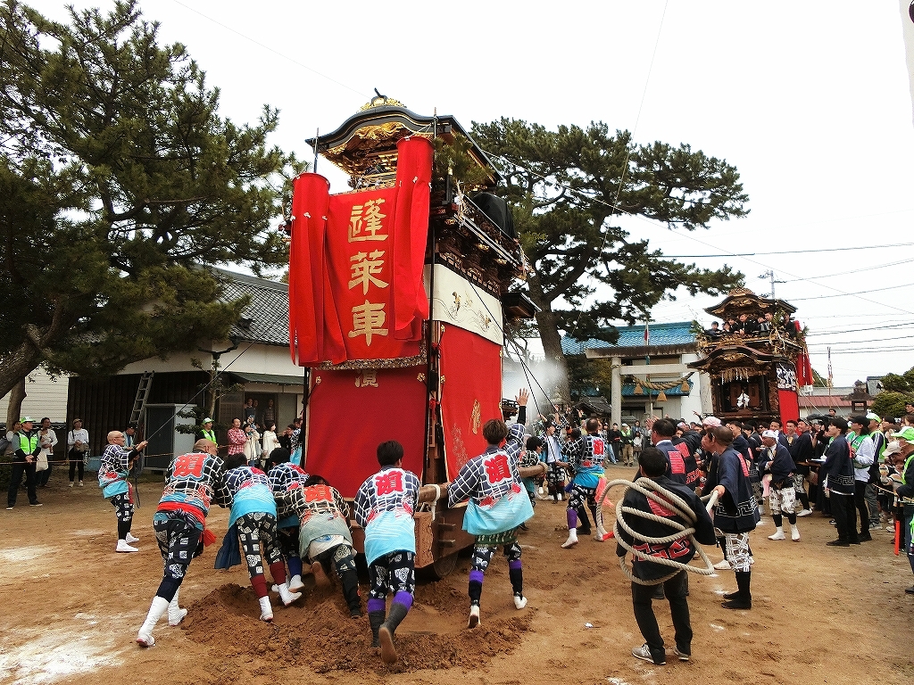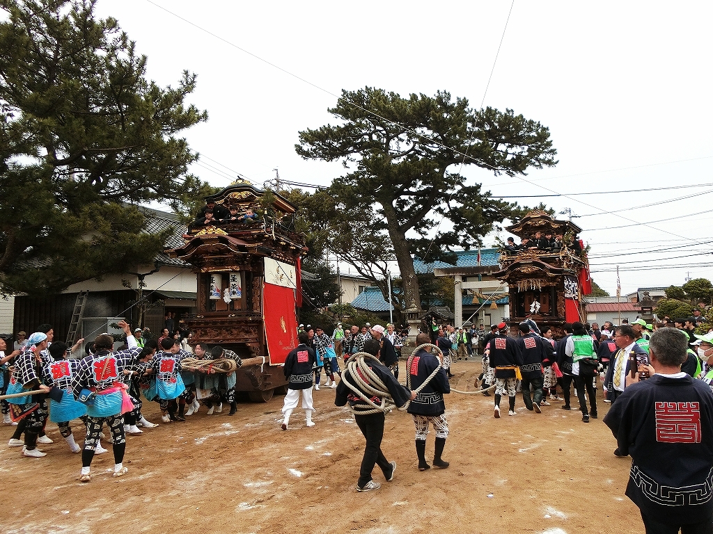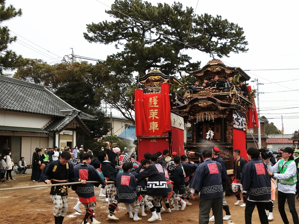 蓬莱車が方向転換を終えて先に境内を出ようとすると、東桜車も前に出て方向転換します。