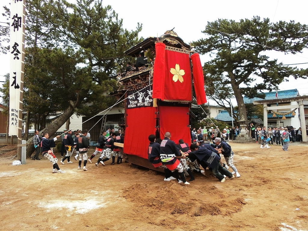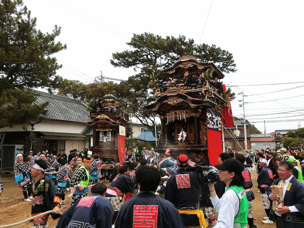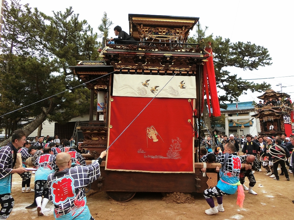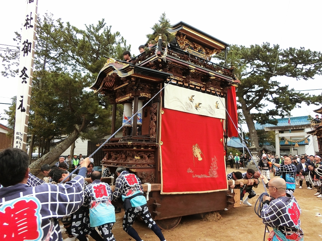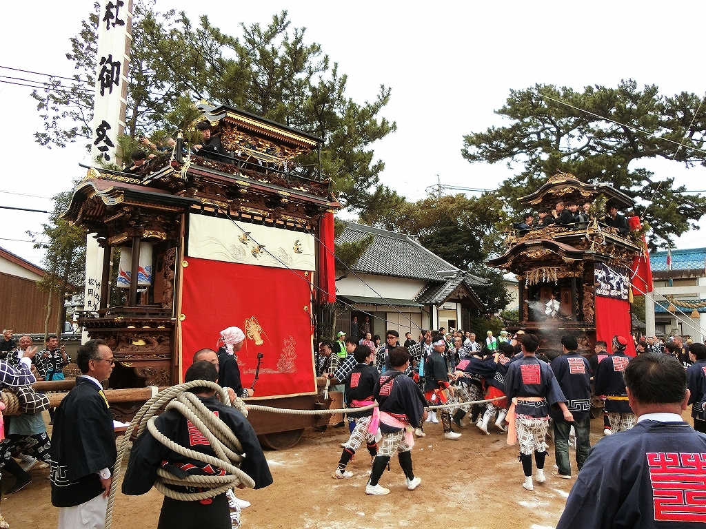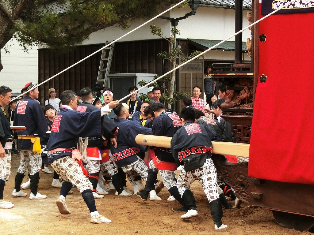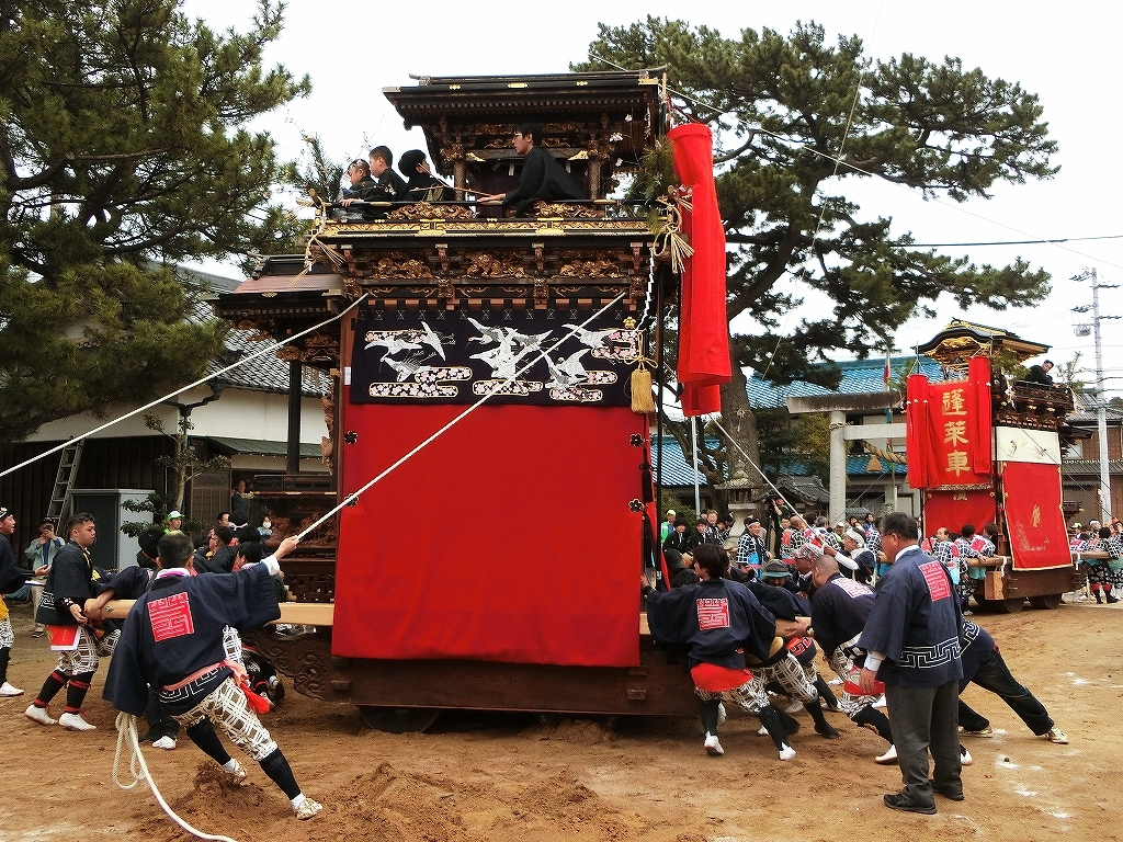 蓬莱車が方向転換を終えて先に境内を出ようとすると、東桜車も前に出て方向転換します。
