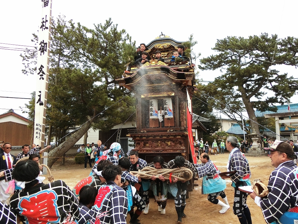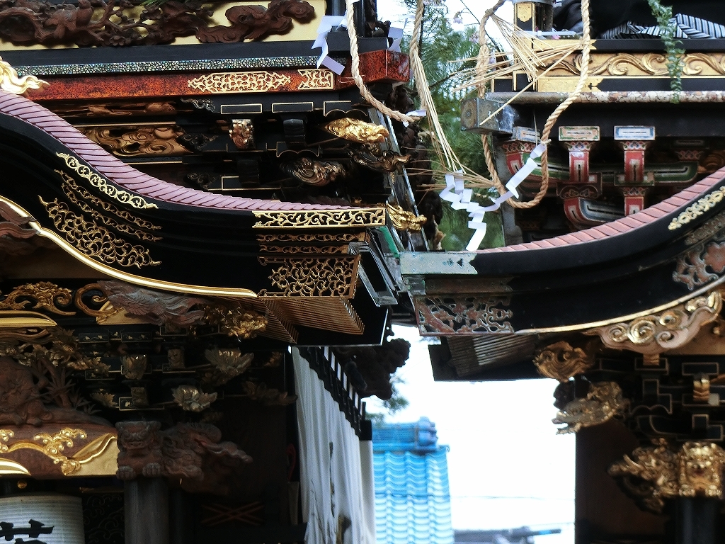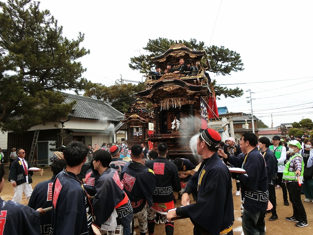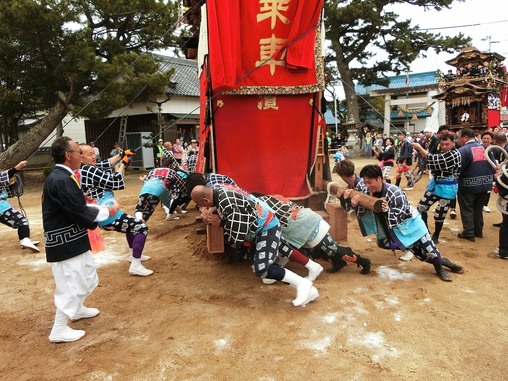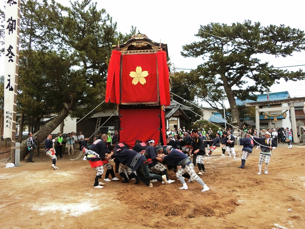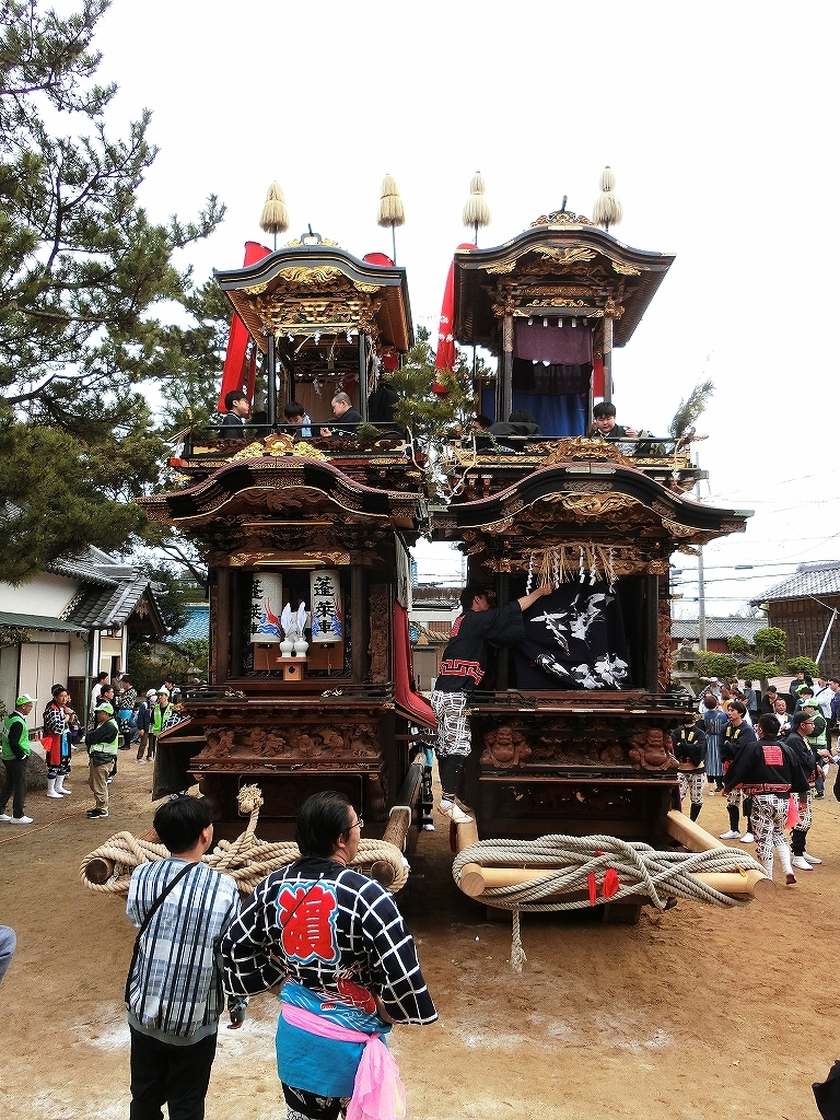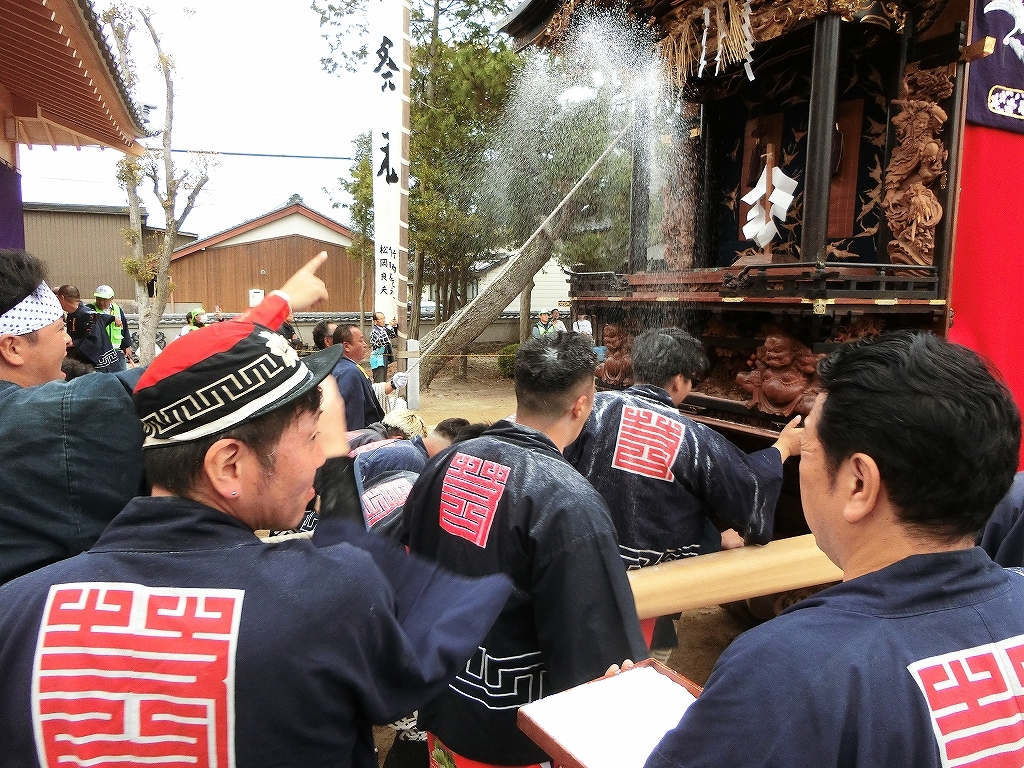 蓬莱車が方向転換を終えて先に境内を出ようとすると、東桜車も前に出て方向転換します。