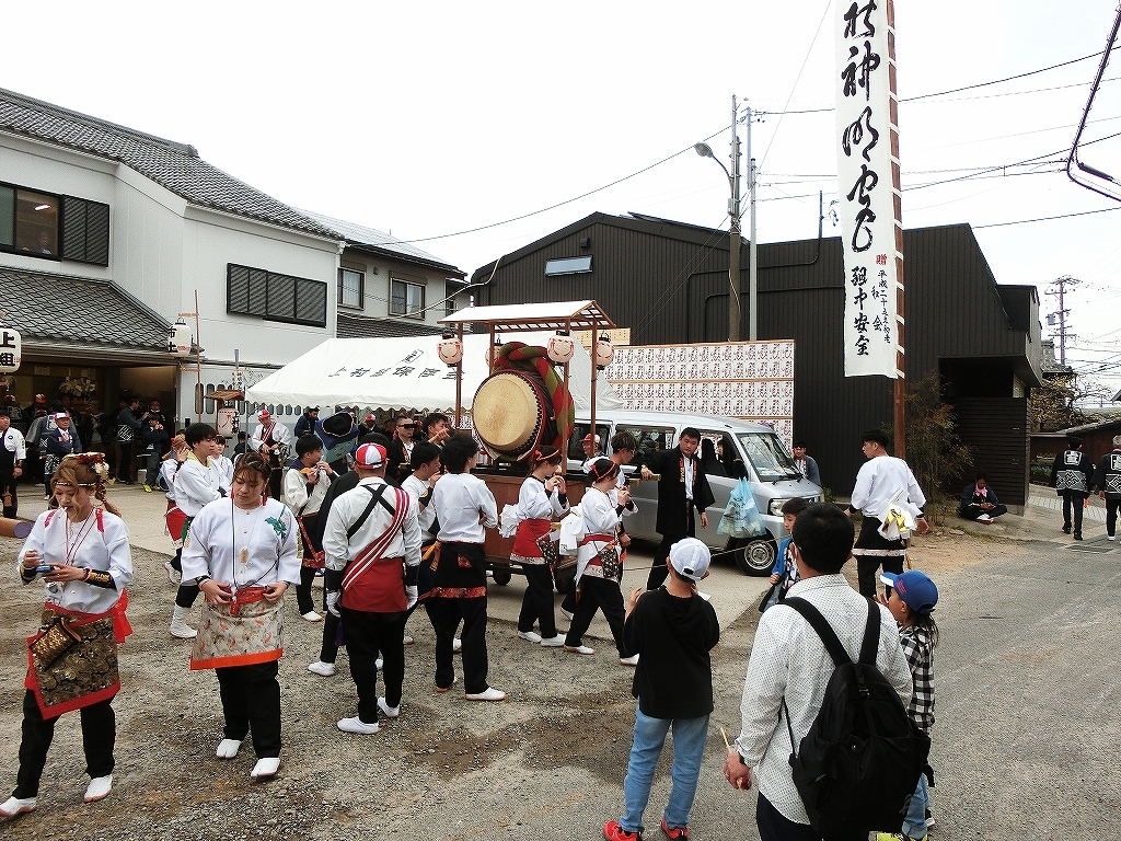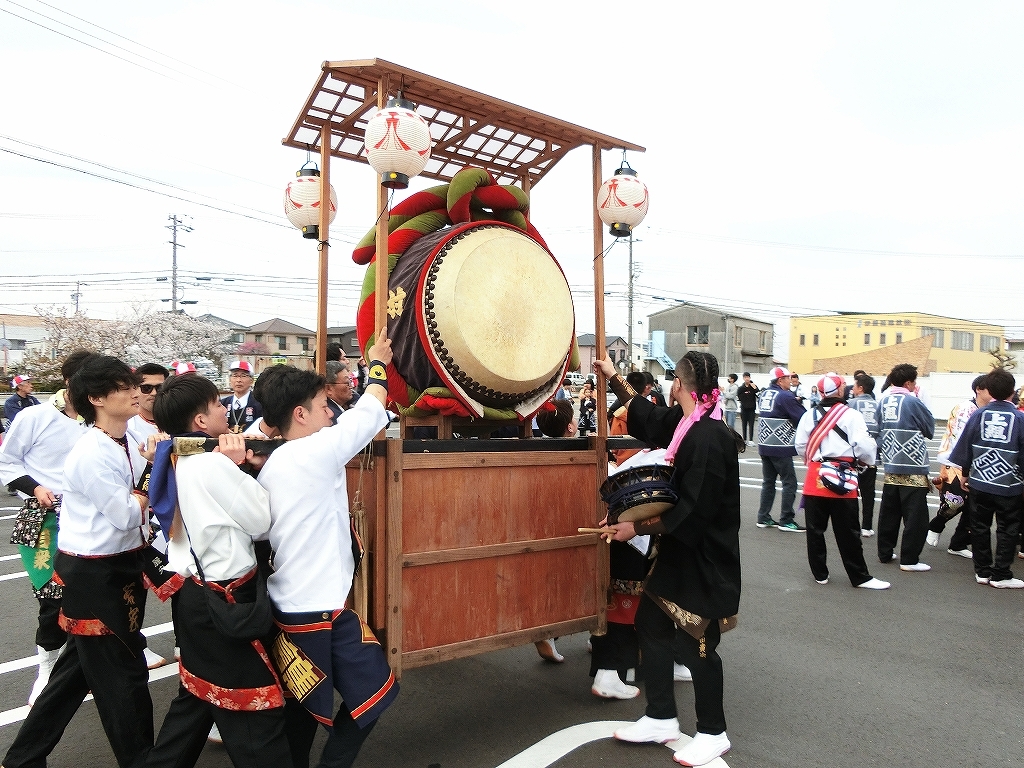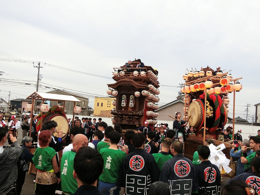 山車の前に両組の太鼓を置き、揃えて叩きました。