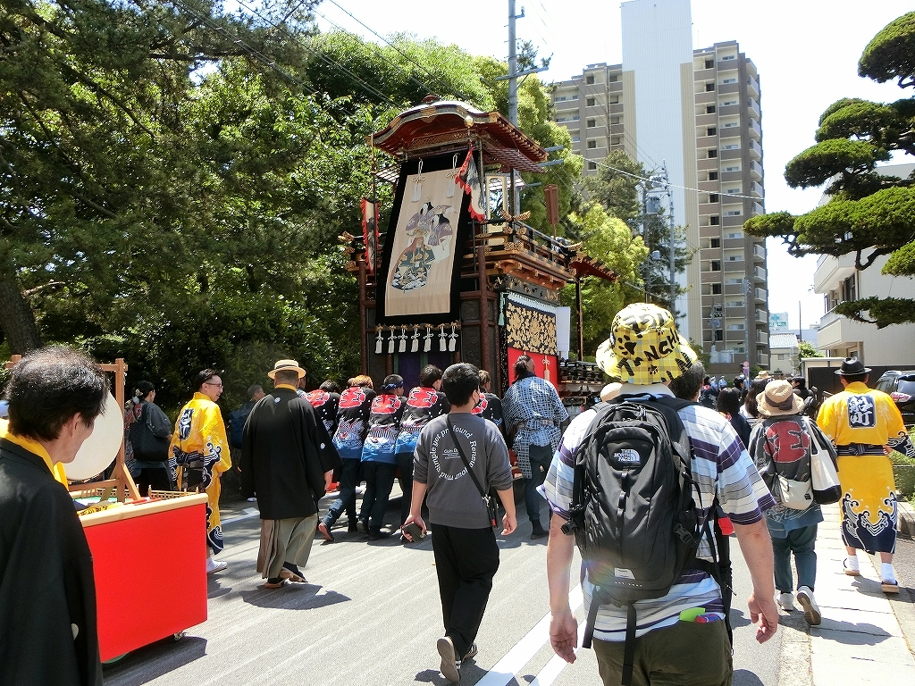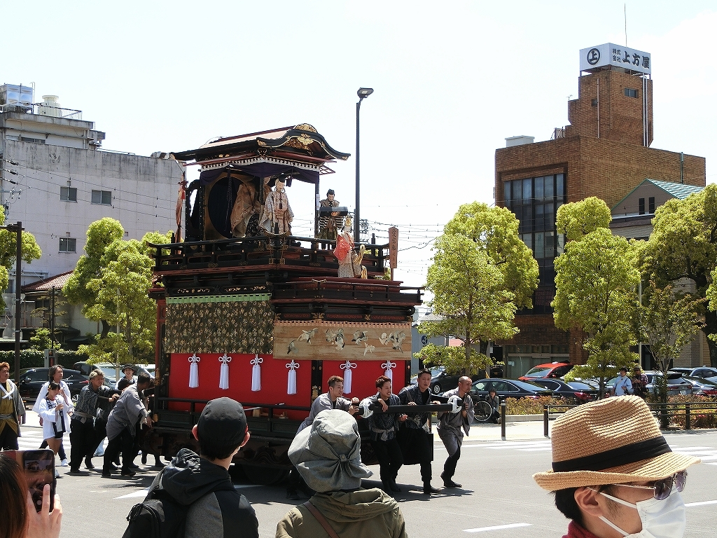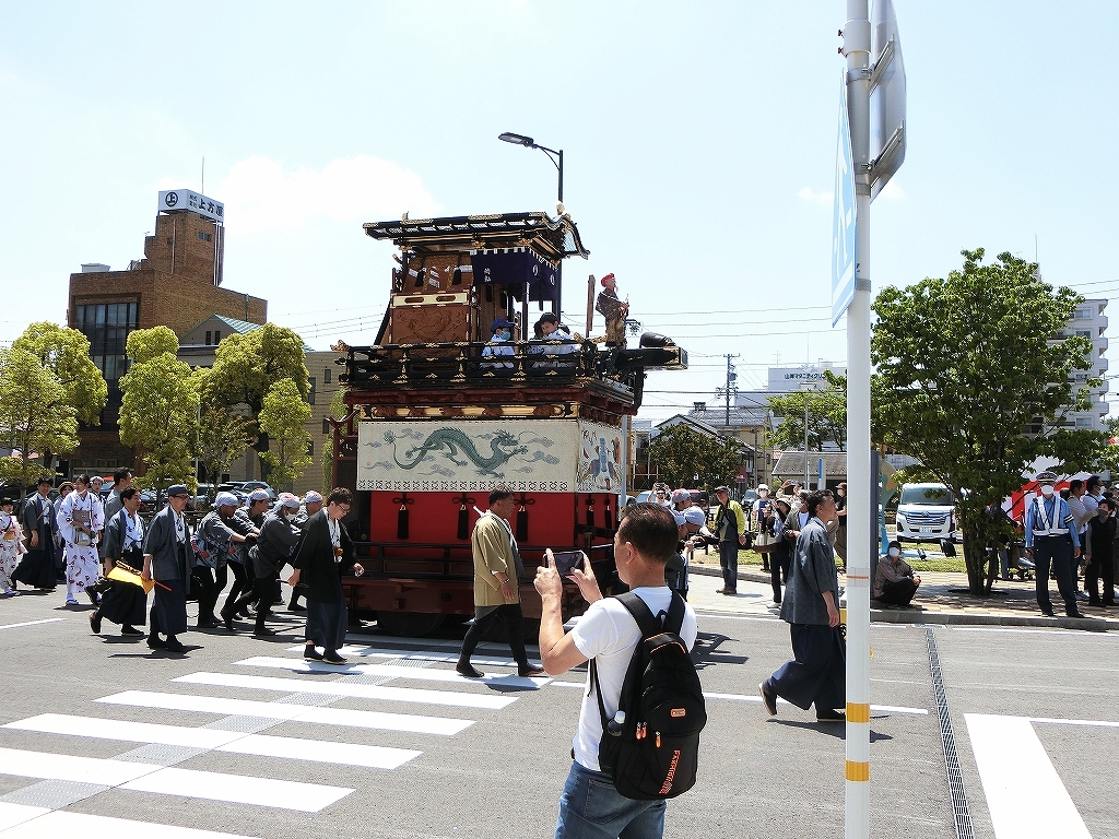 八幡神社での奉芸の後、市役所へ各軕がやってきます。