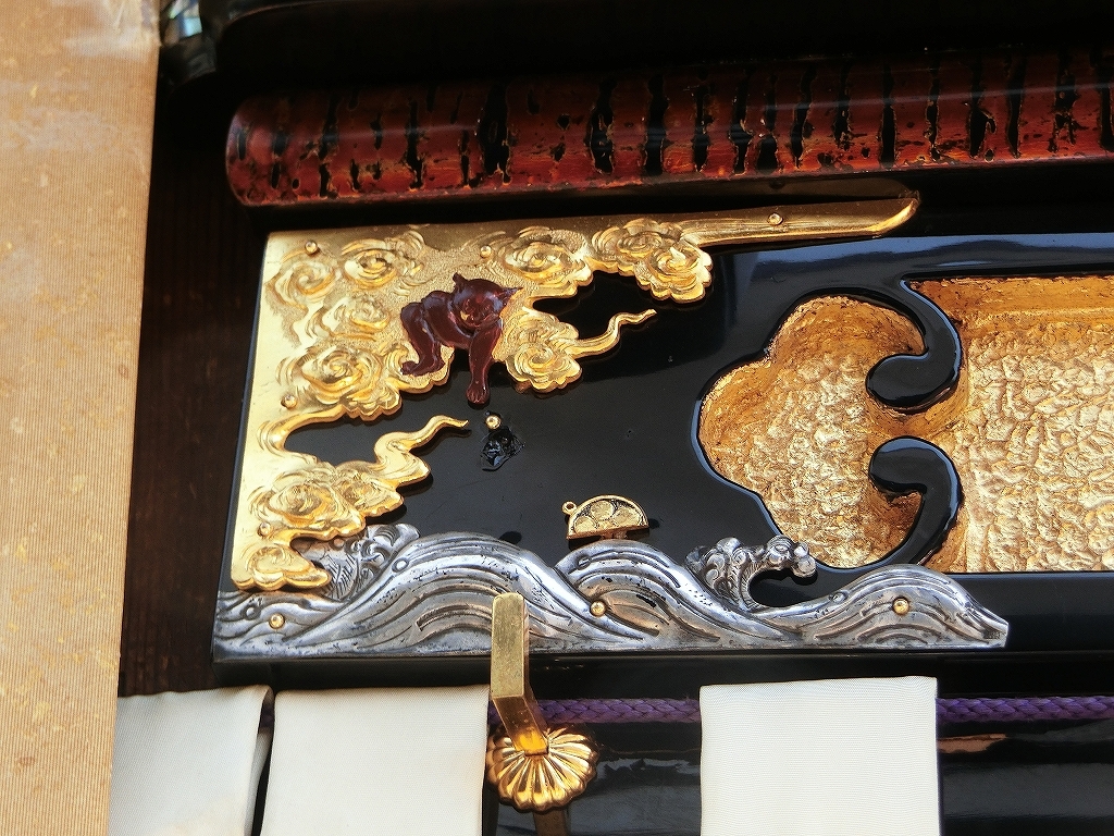 落語の"猫の皿"より考えられたと思われる、猫と皿(梅鉢紋入り)の意匠です。