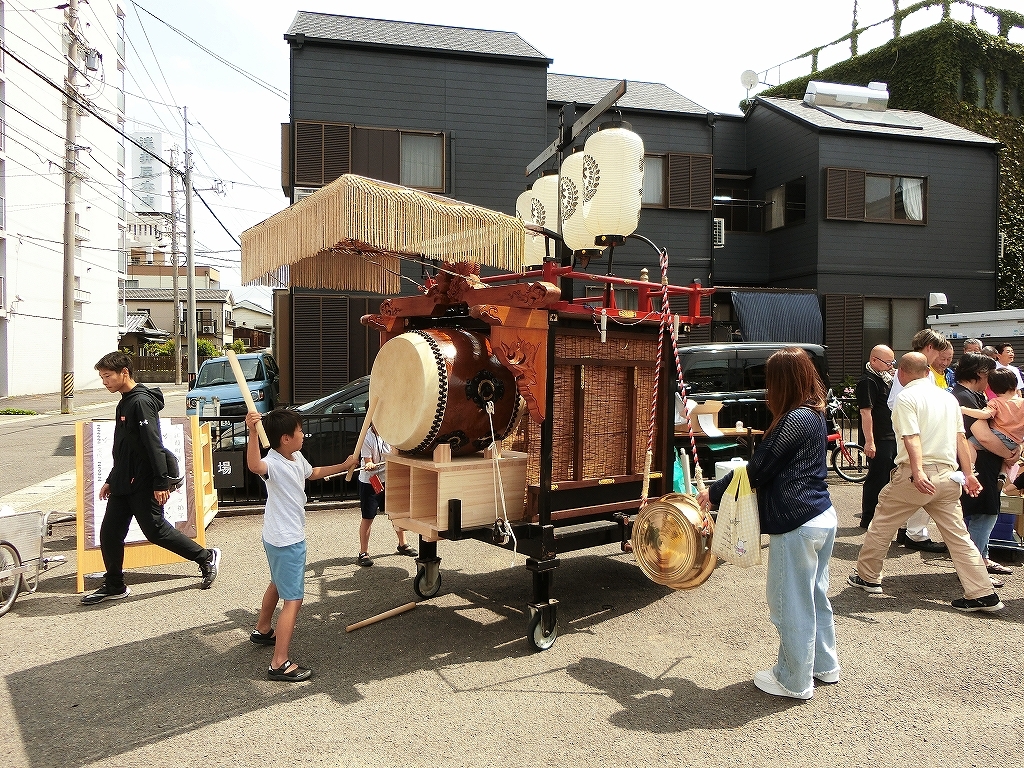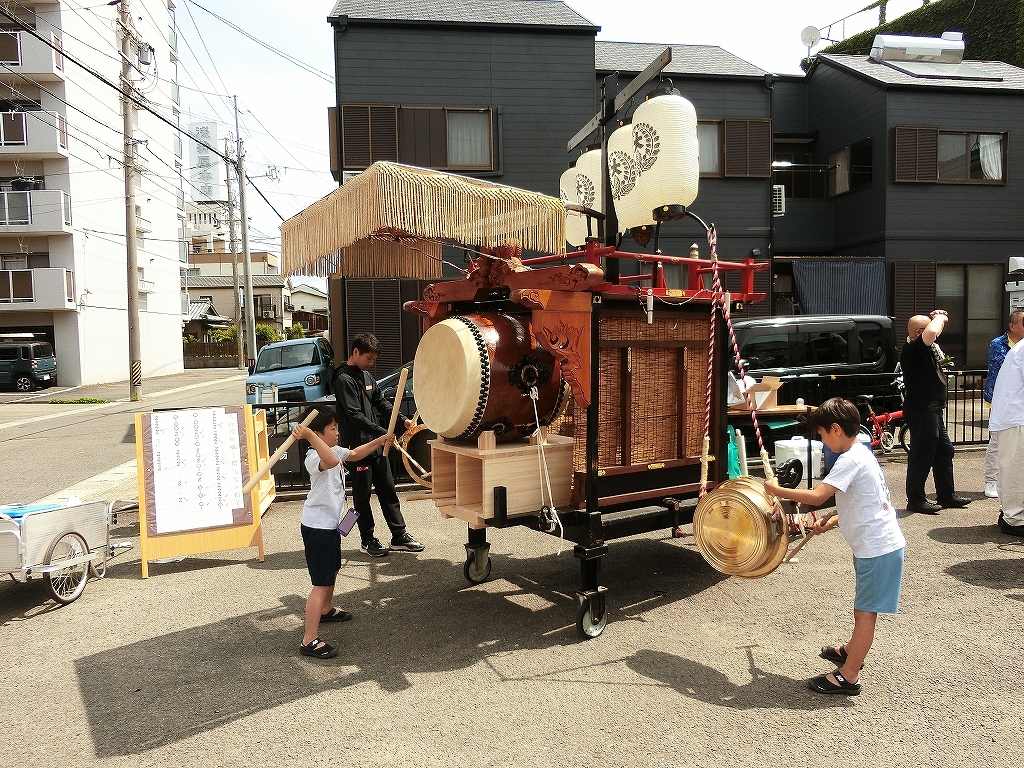 子供たちは、均車で練習太鼓の試し打ちを行っています。