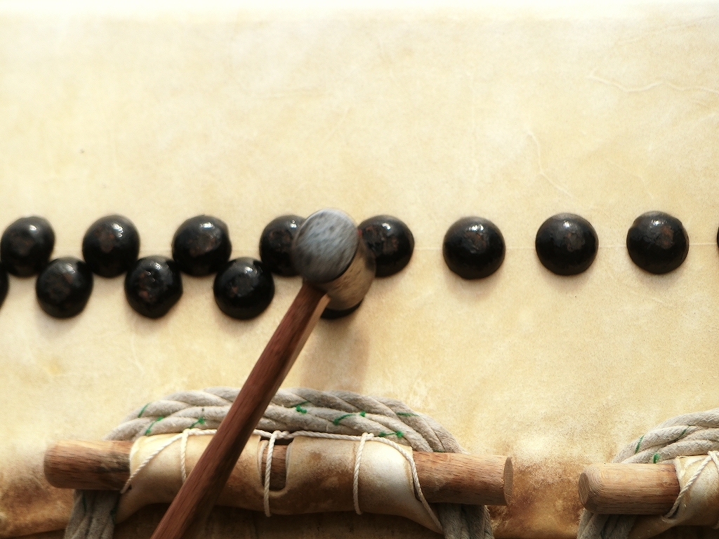 町内の人が納得する張り具合になると、鋲を打つために特製の定規で皮に筋を入れていきます。