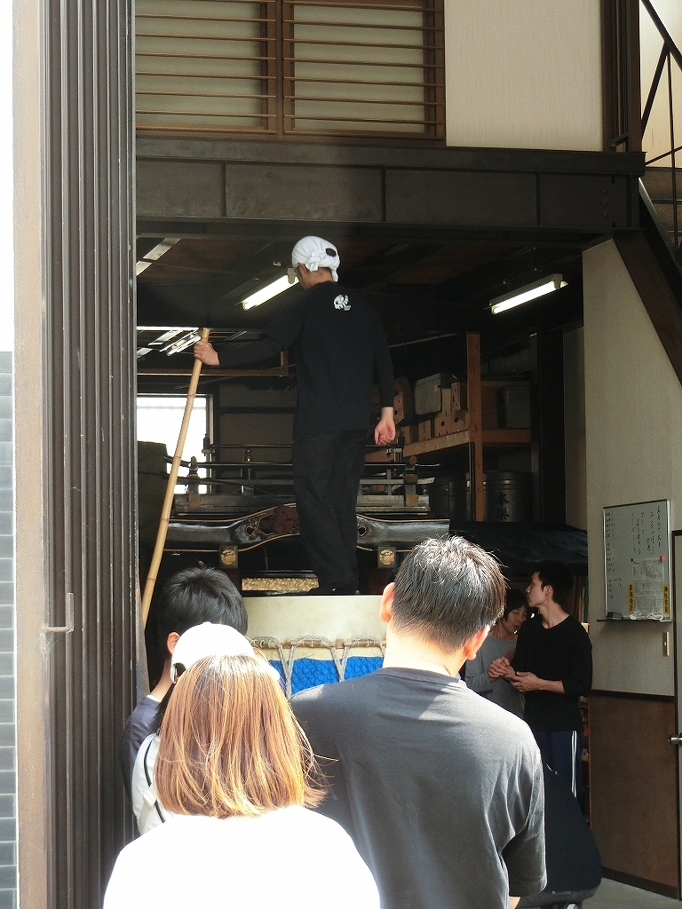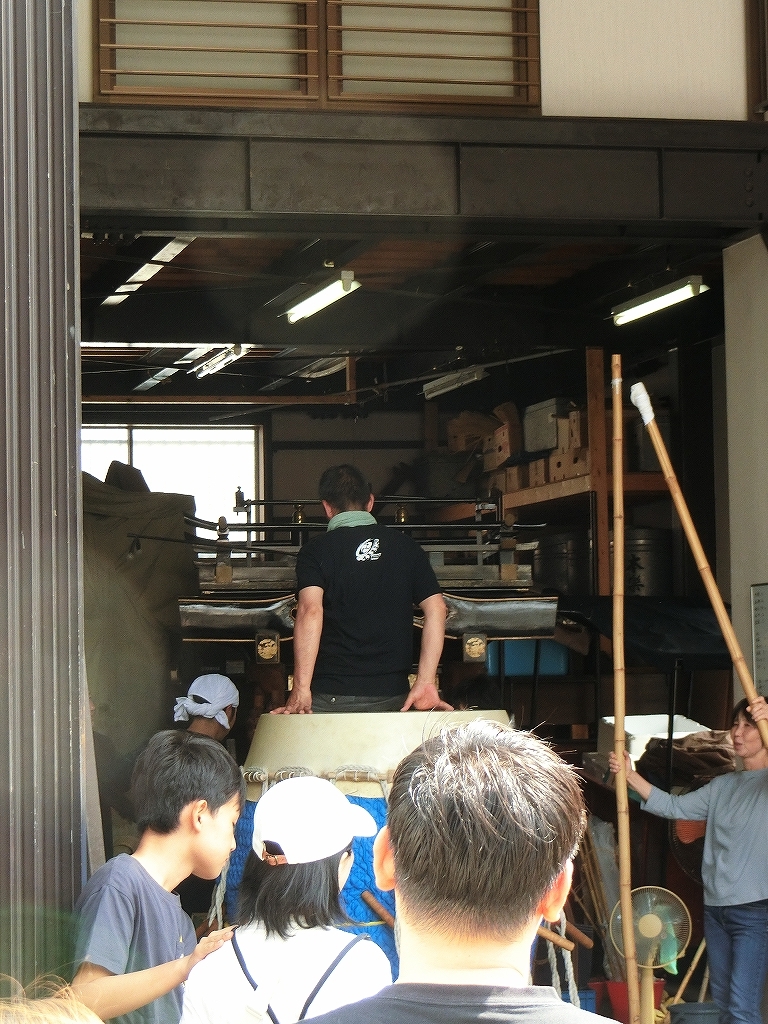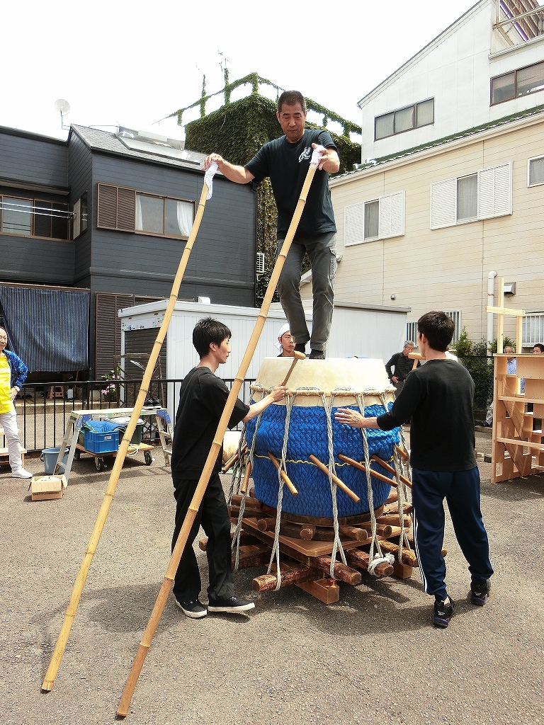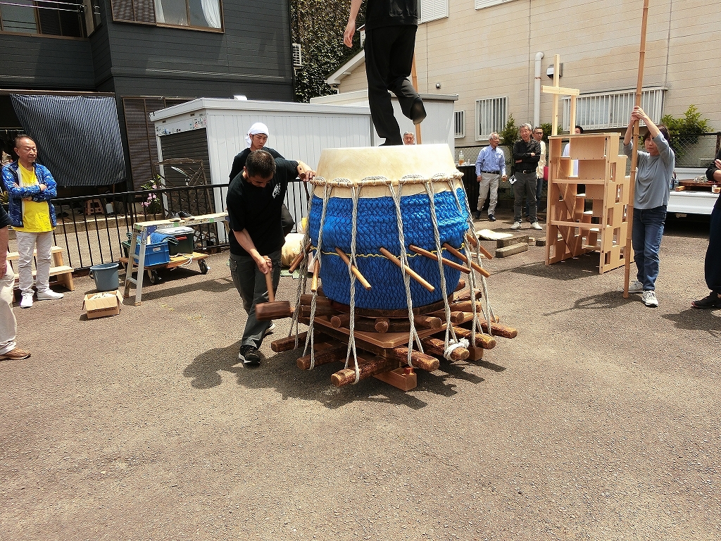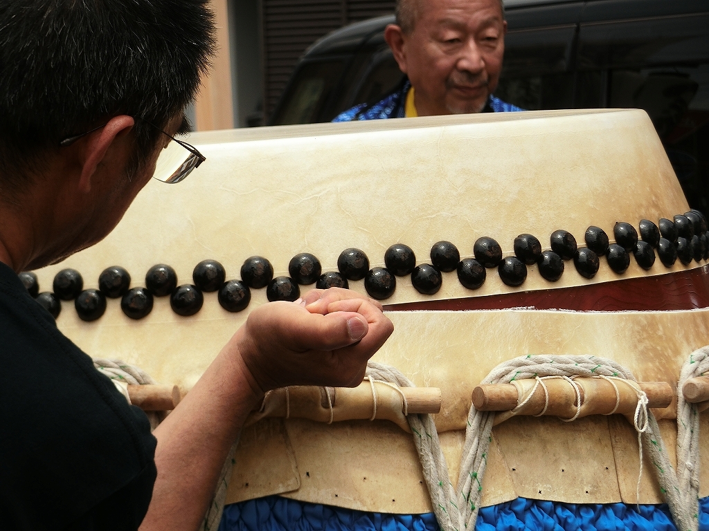 大将が太鼓の上に乗り、最終的な具合を確認します。