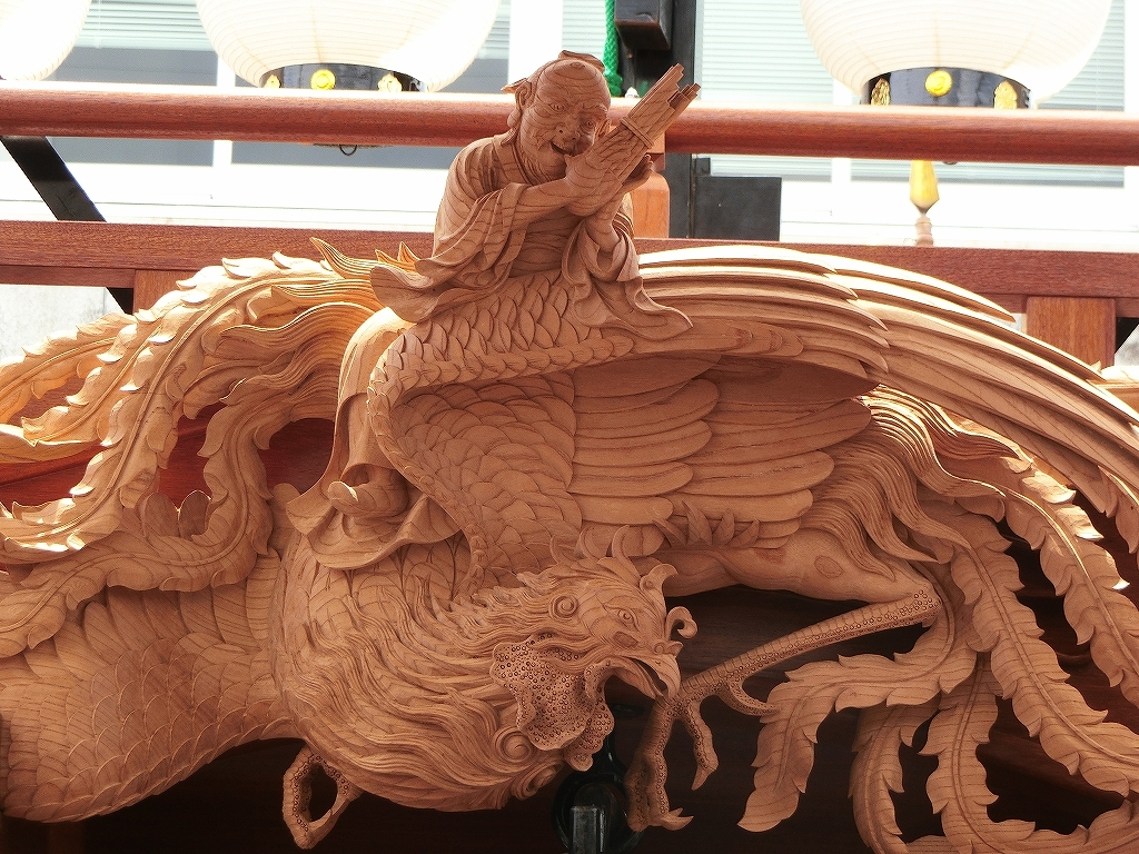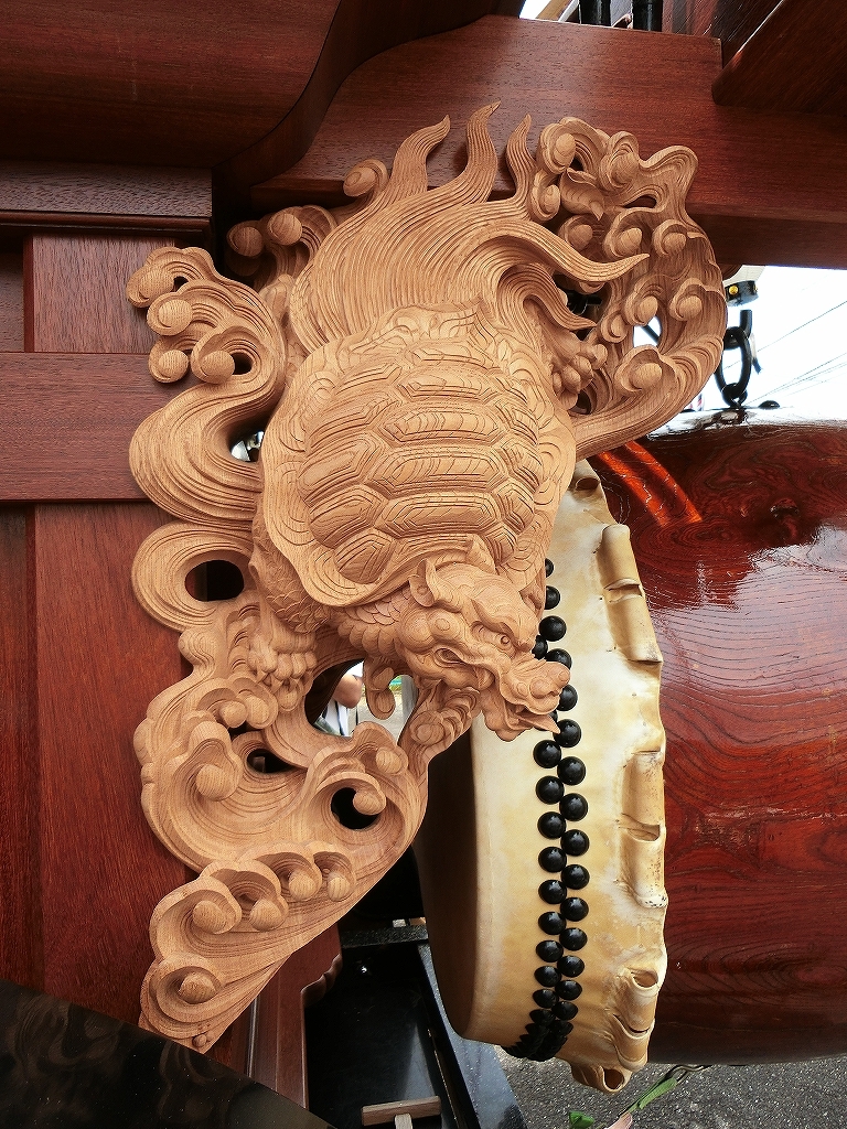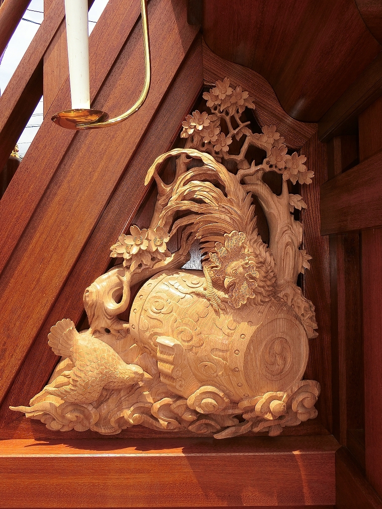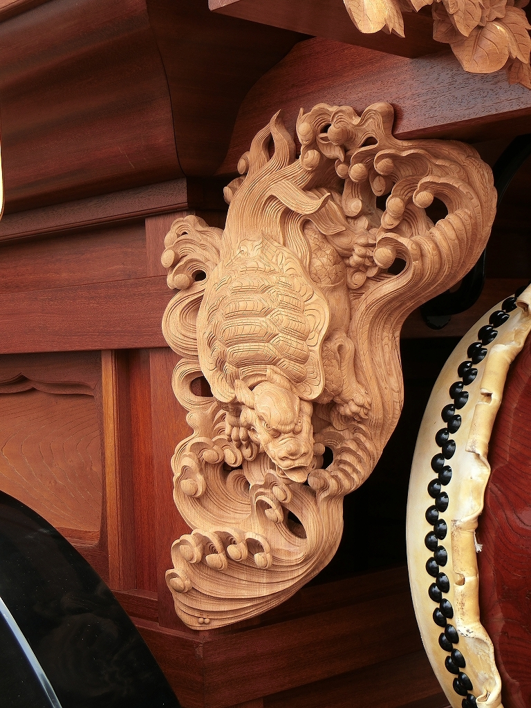 総彫りではなく、本来の太鼓掛枠に大型の彫刻が取り付けられました。