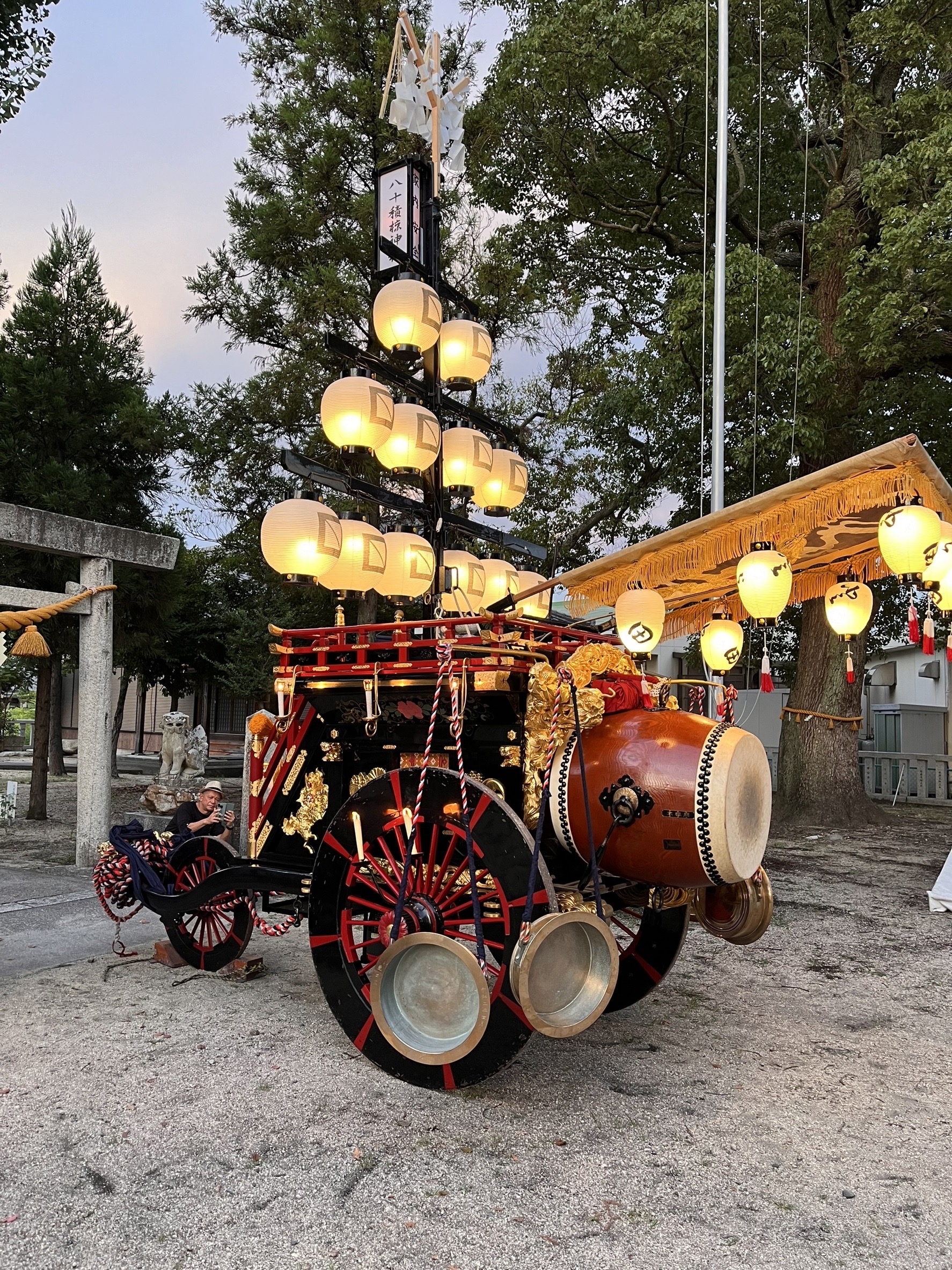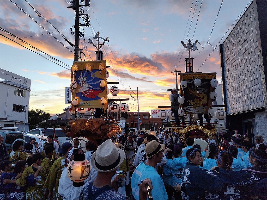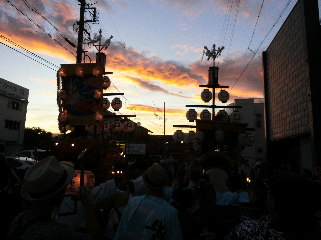 祭車に合わせると夕焼けは写らない。