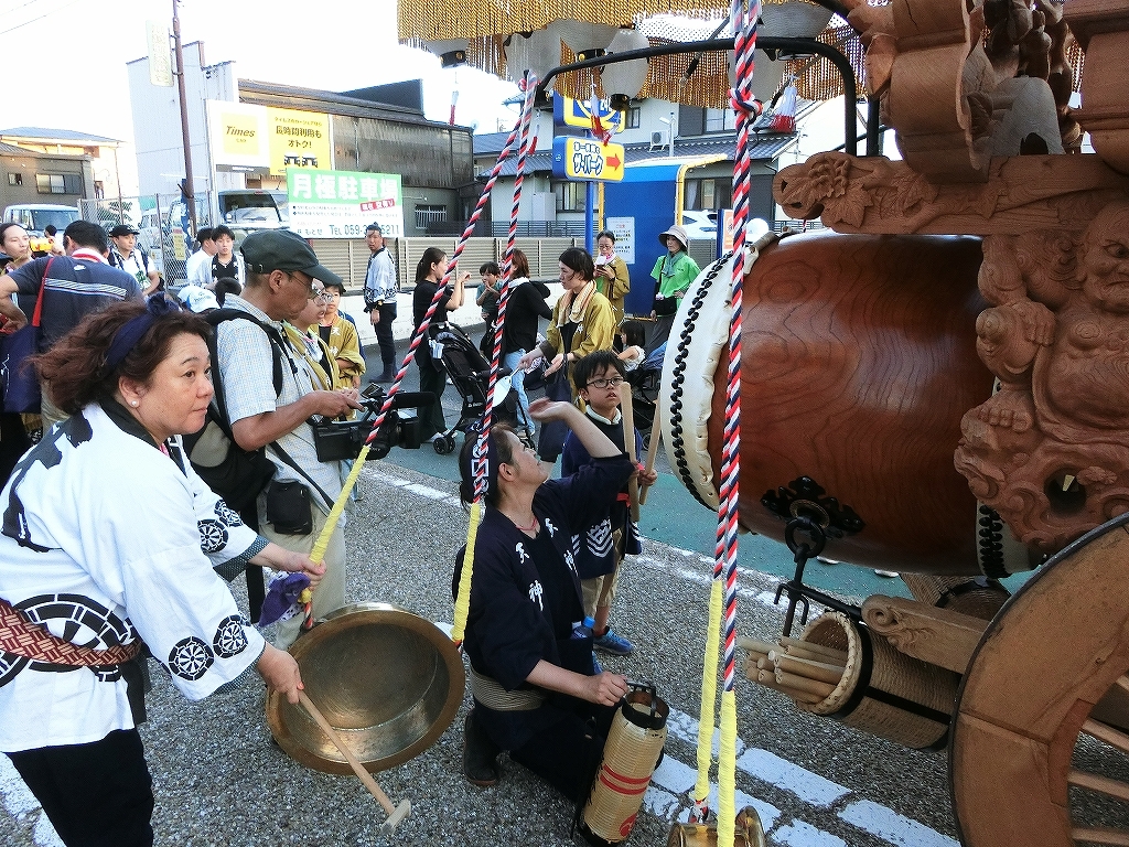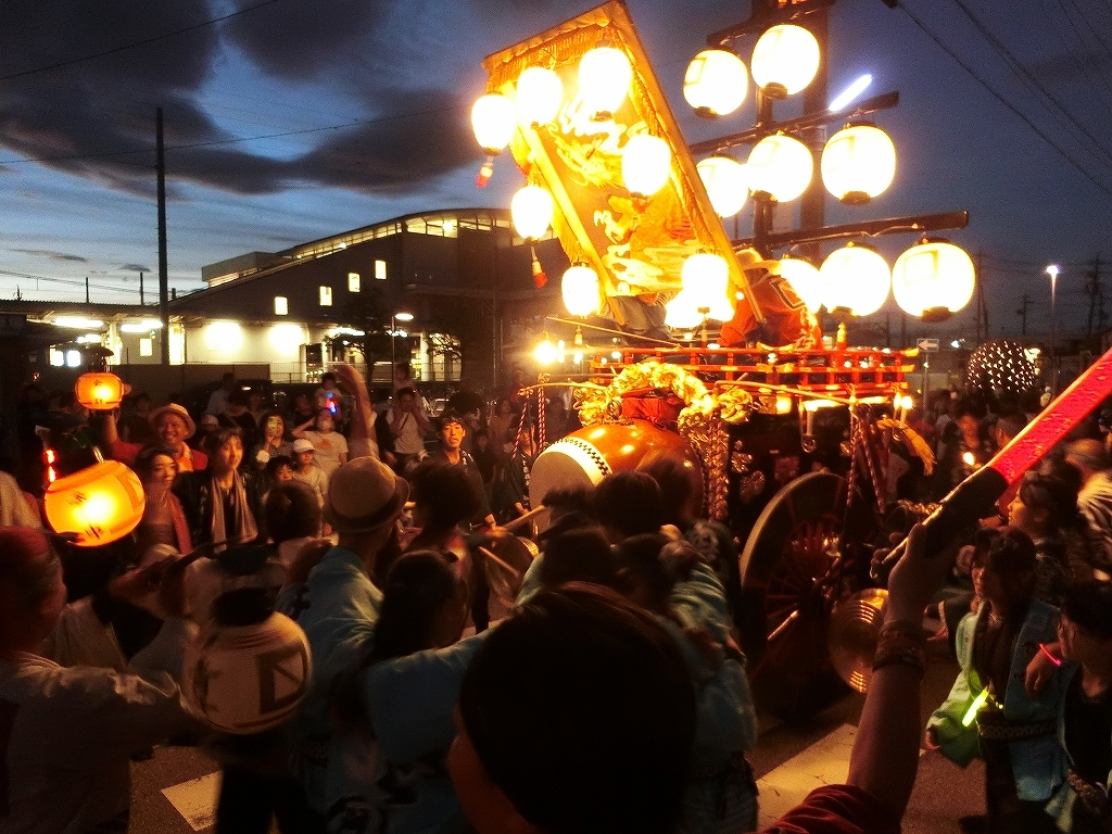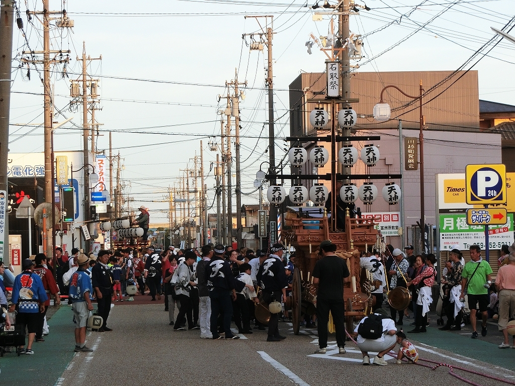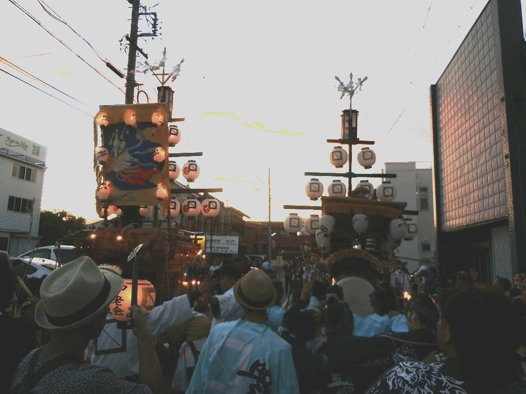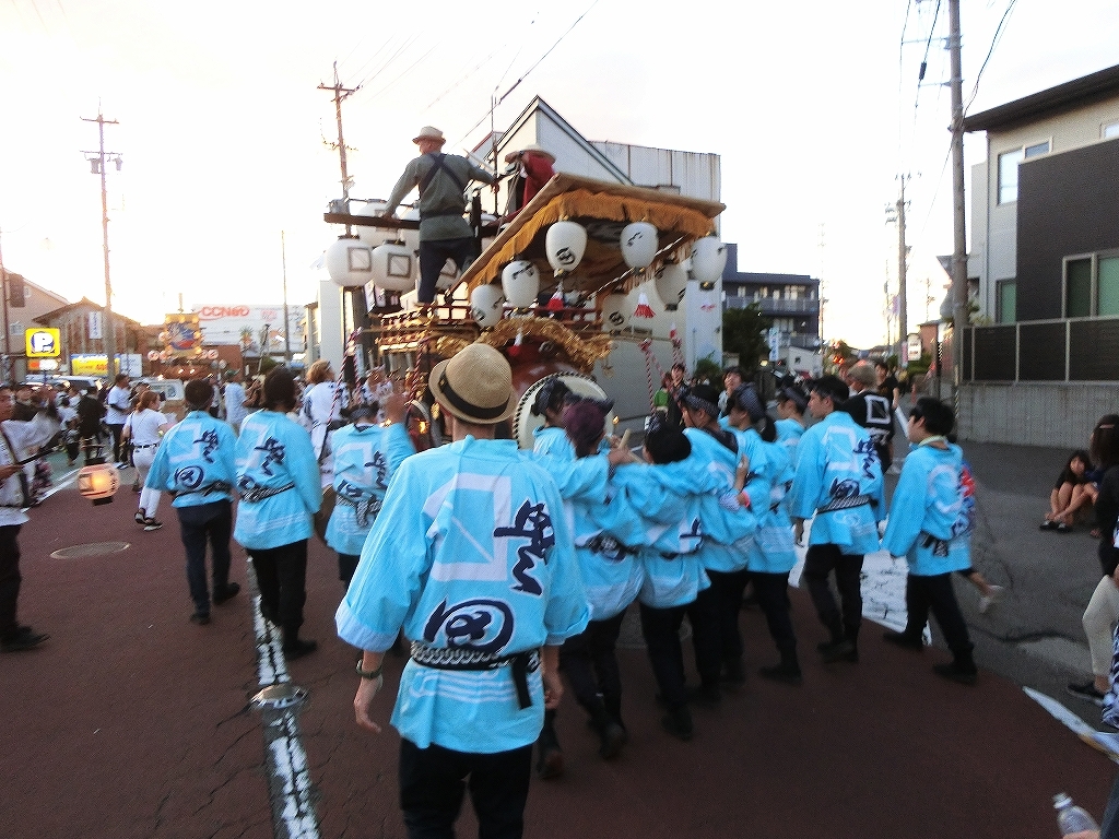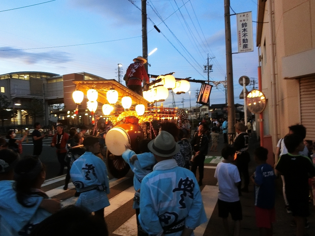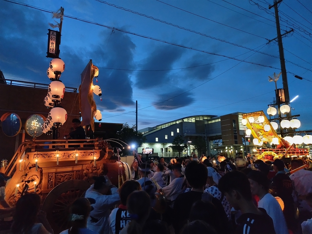 夕方、近鉄川越富洲原駅前に豊田と天神町の祭車が揃います!