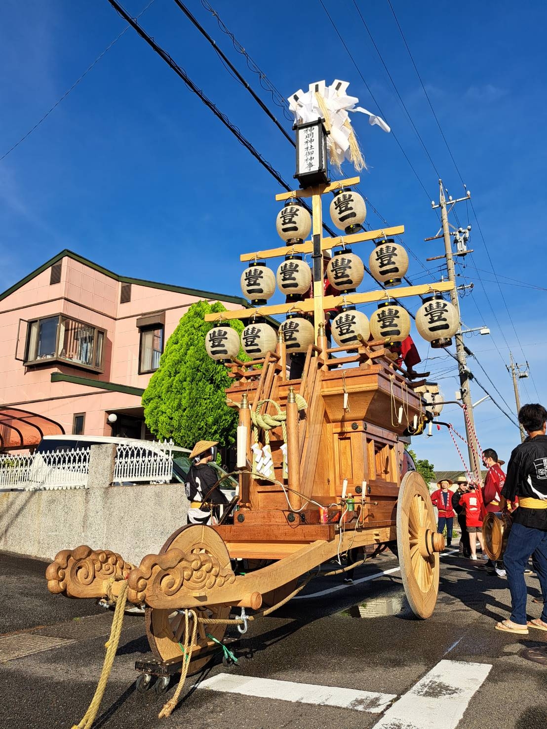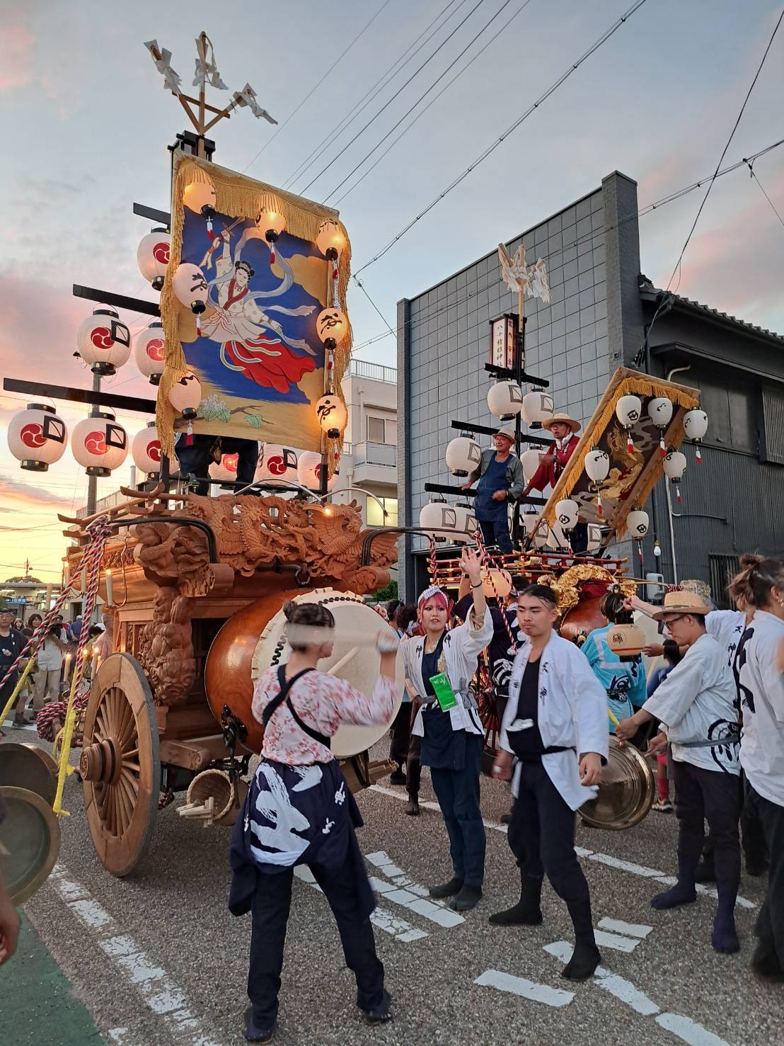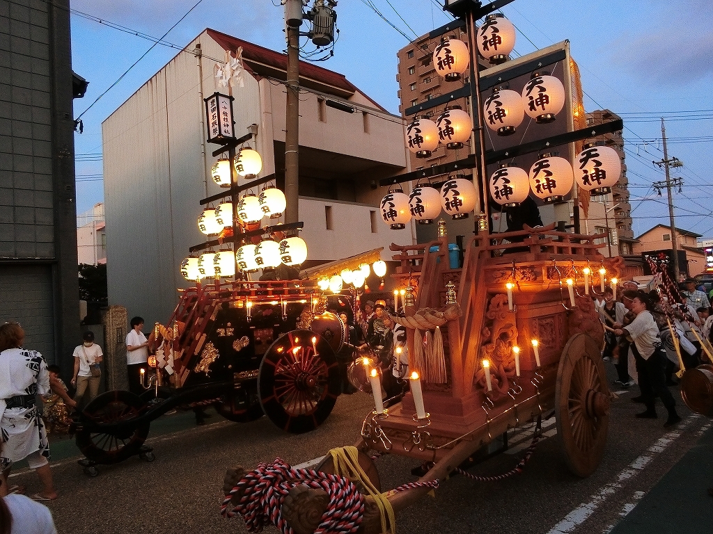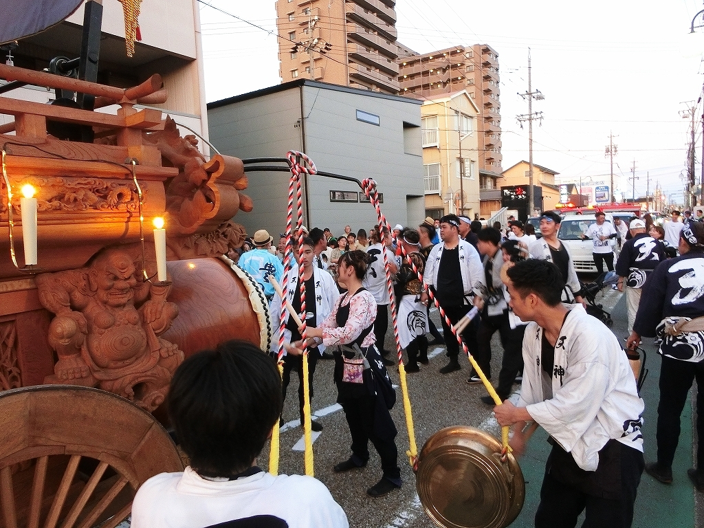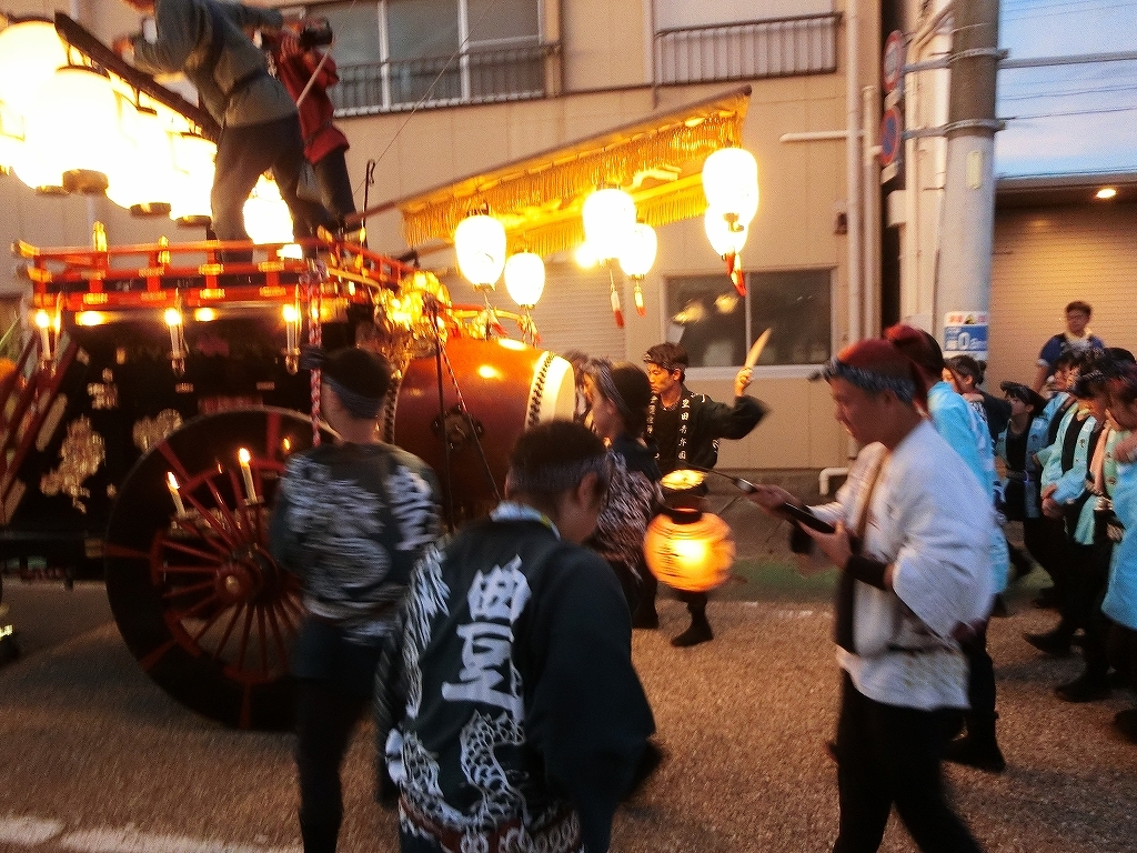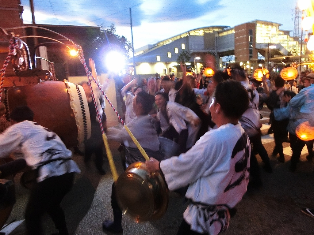 夕方、近鉄川越富洲原駅前に豊田と天神町の祭車が揃います!