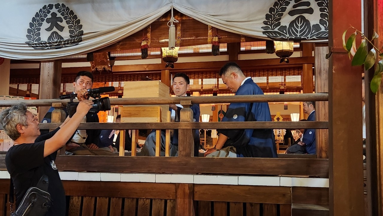 神事が終わると青年連盟幹事は拝殿の外で待機します。