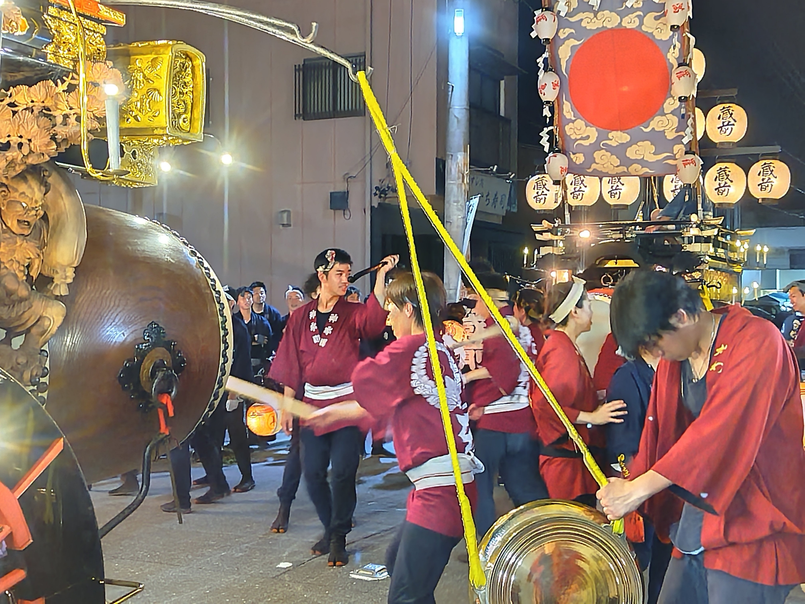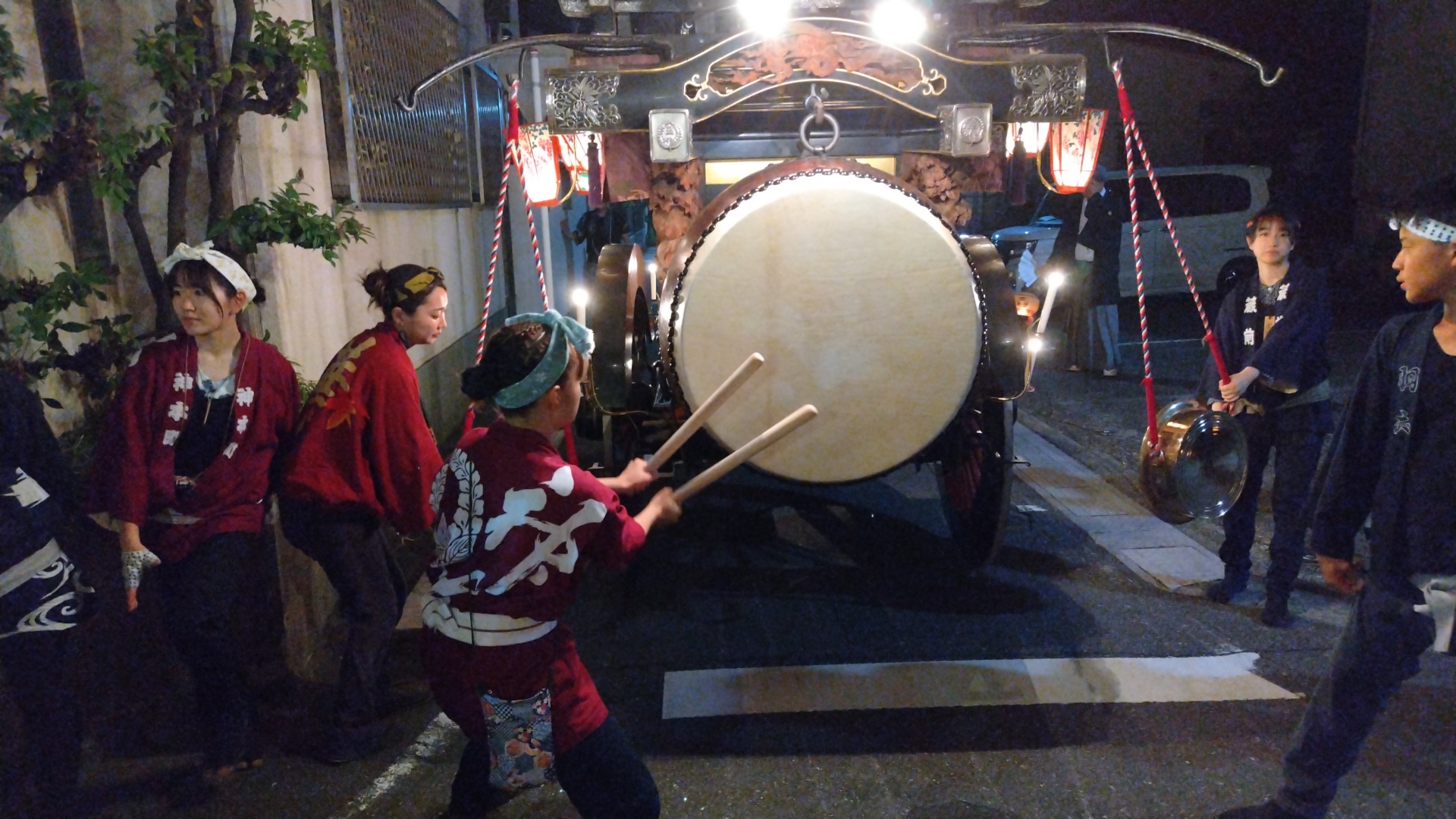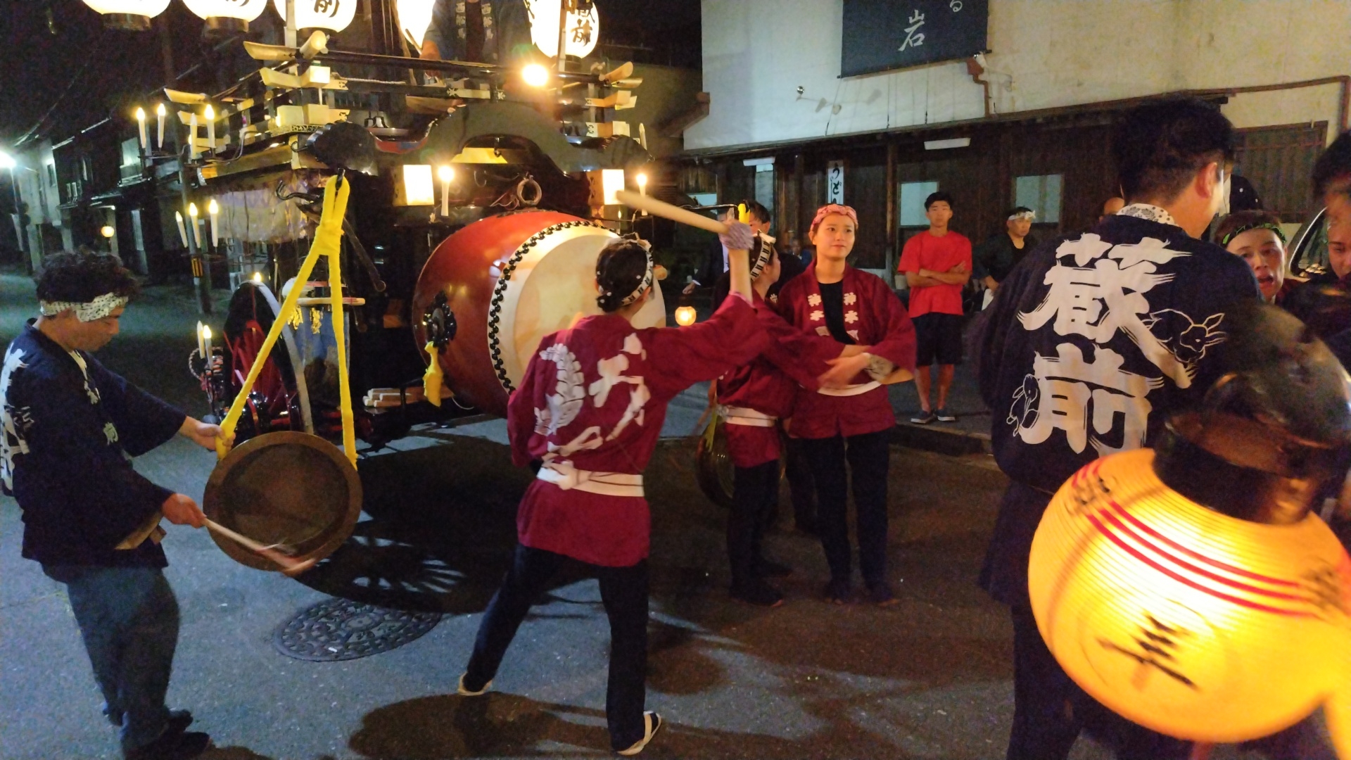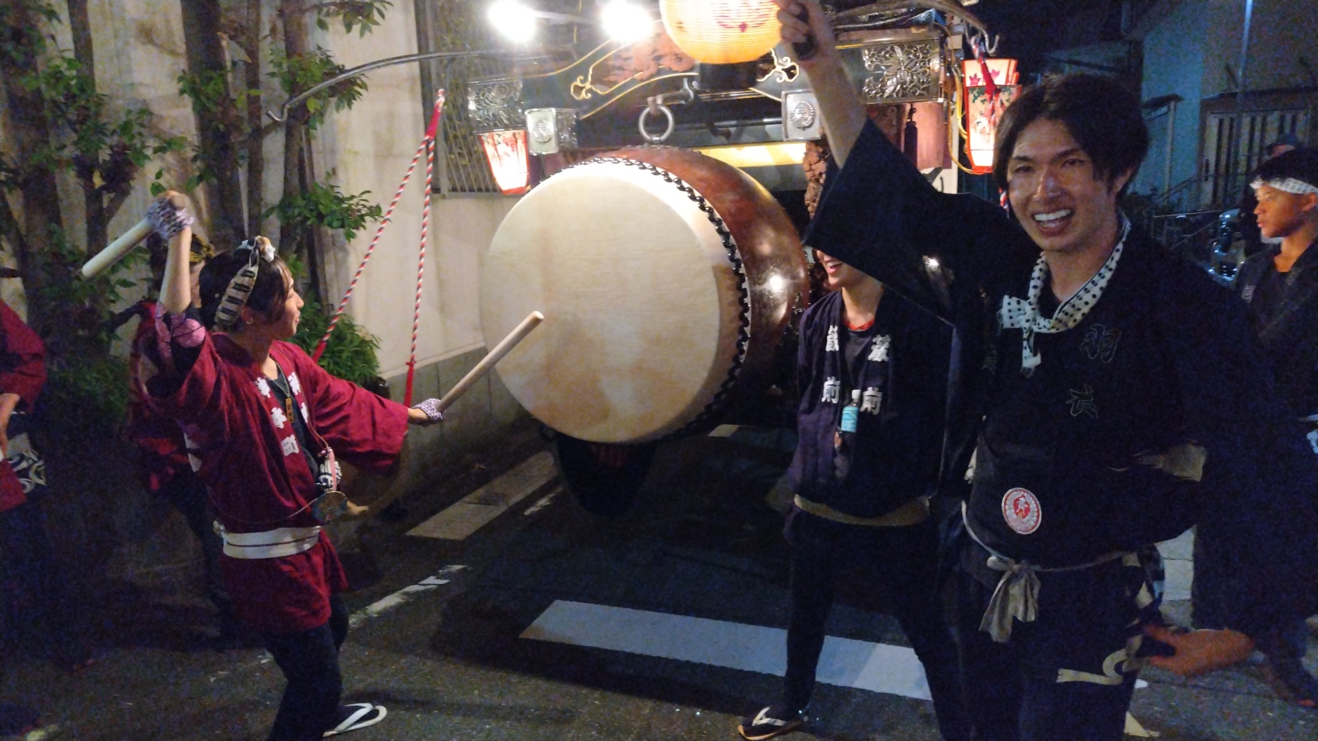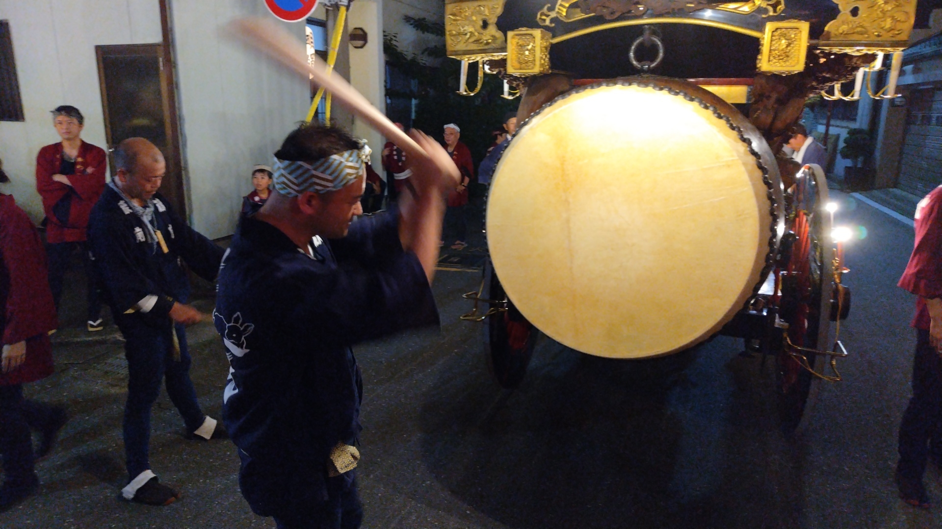 花街川口町祭車で叩かせていただく、上本町青年会員。