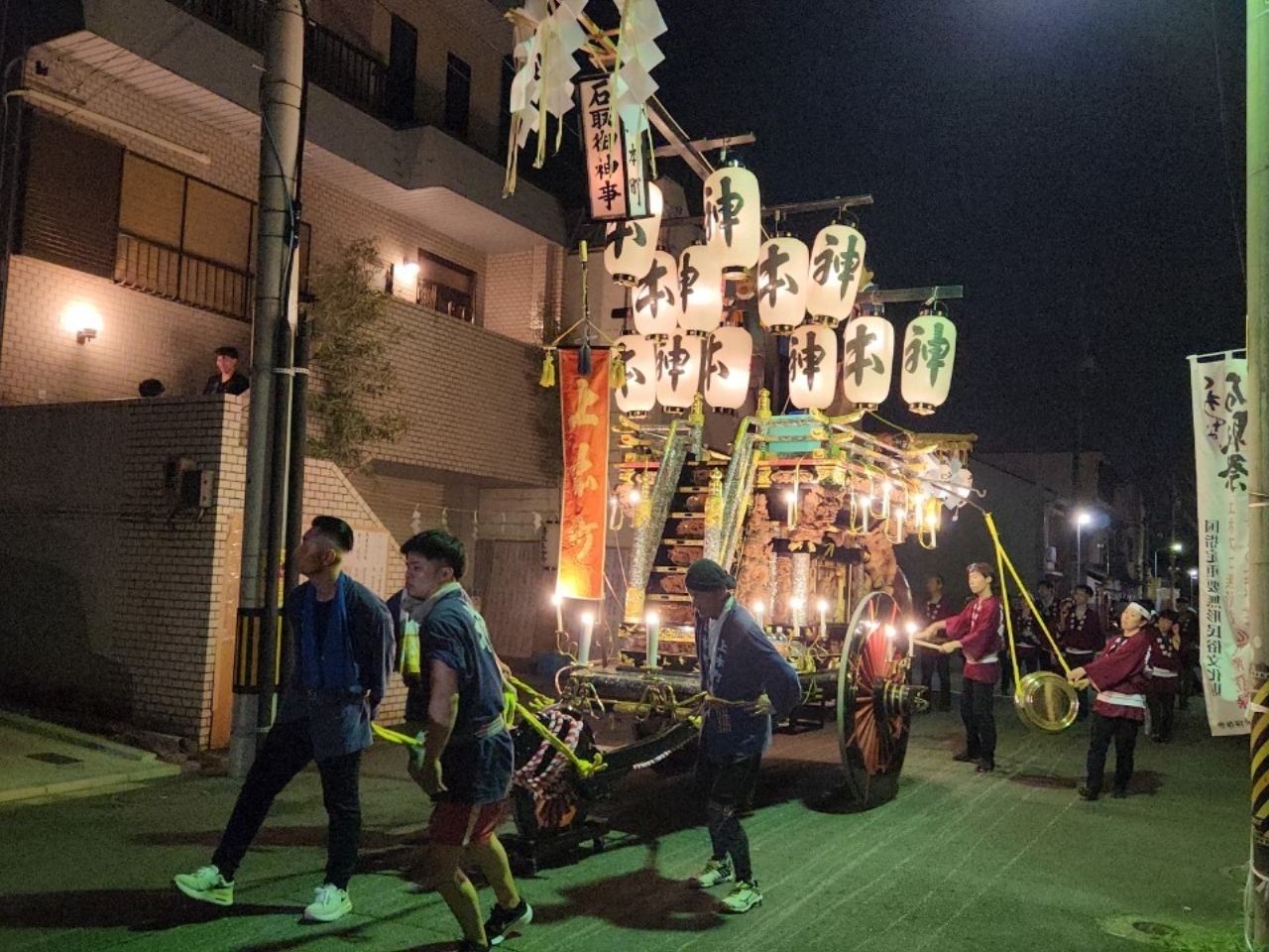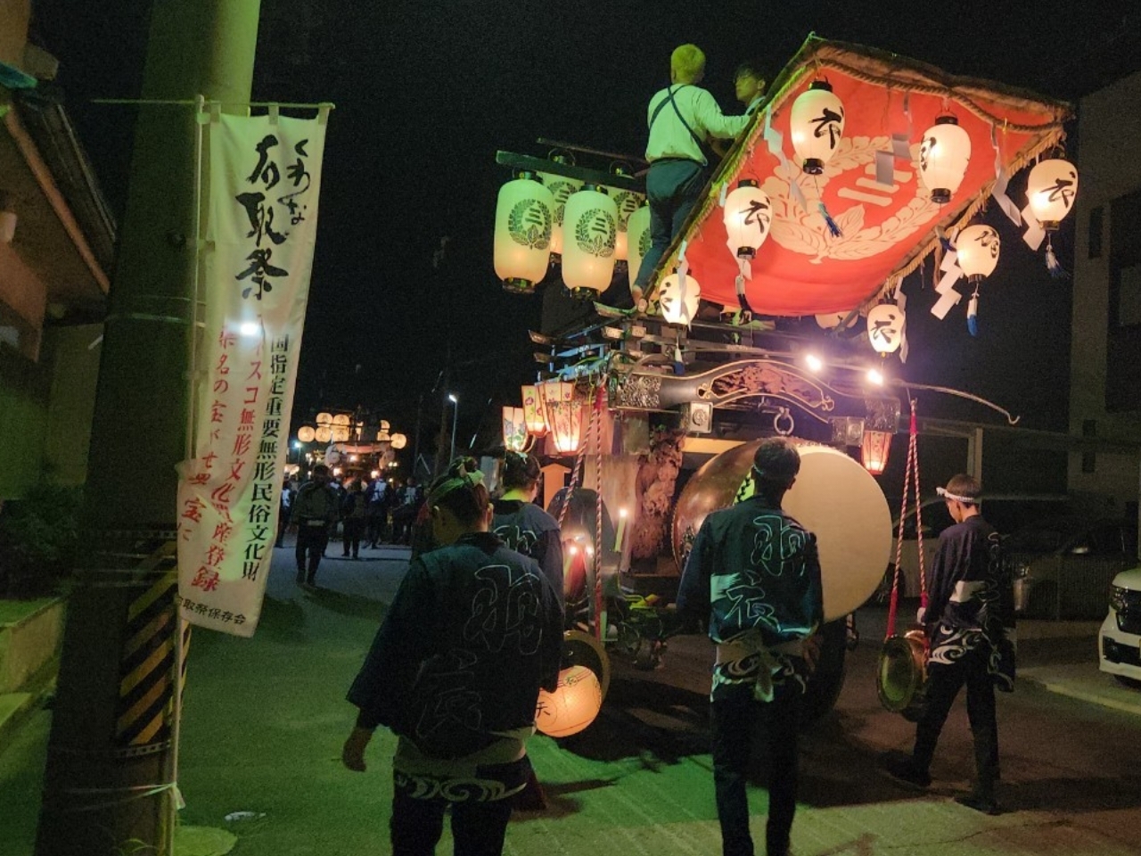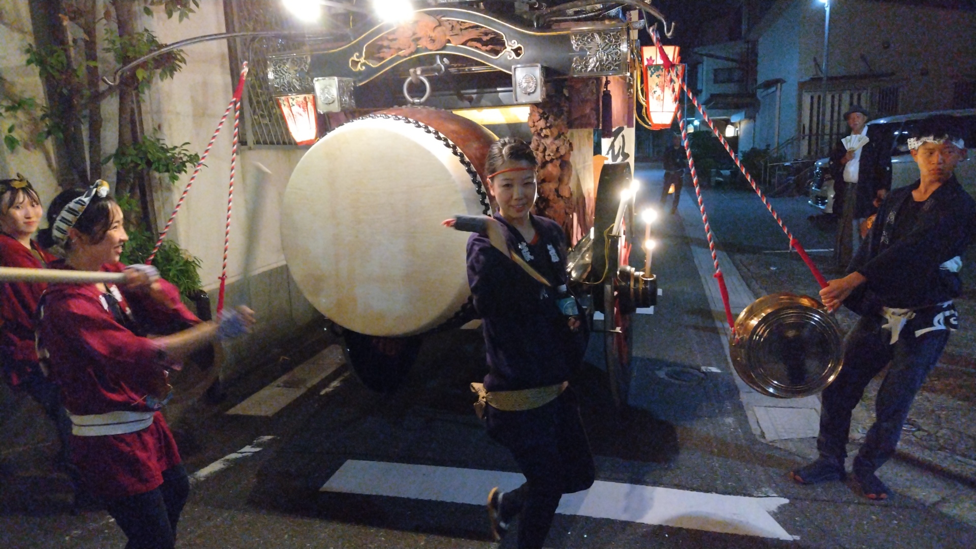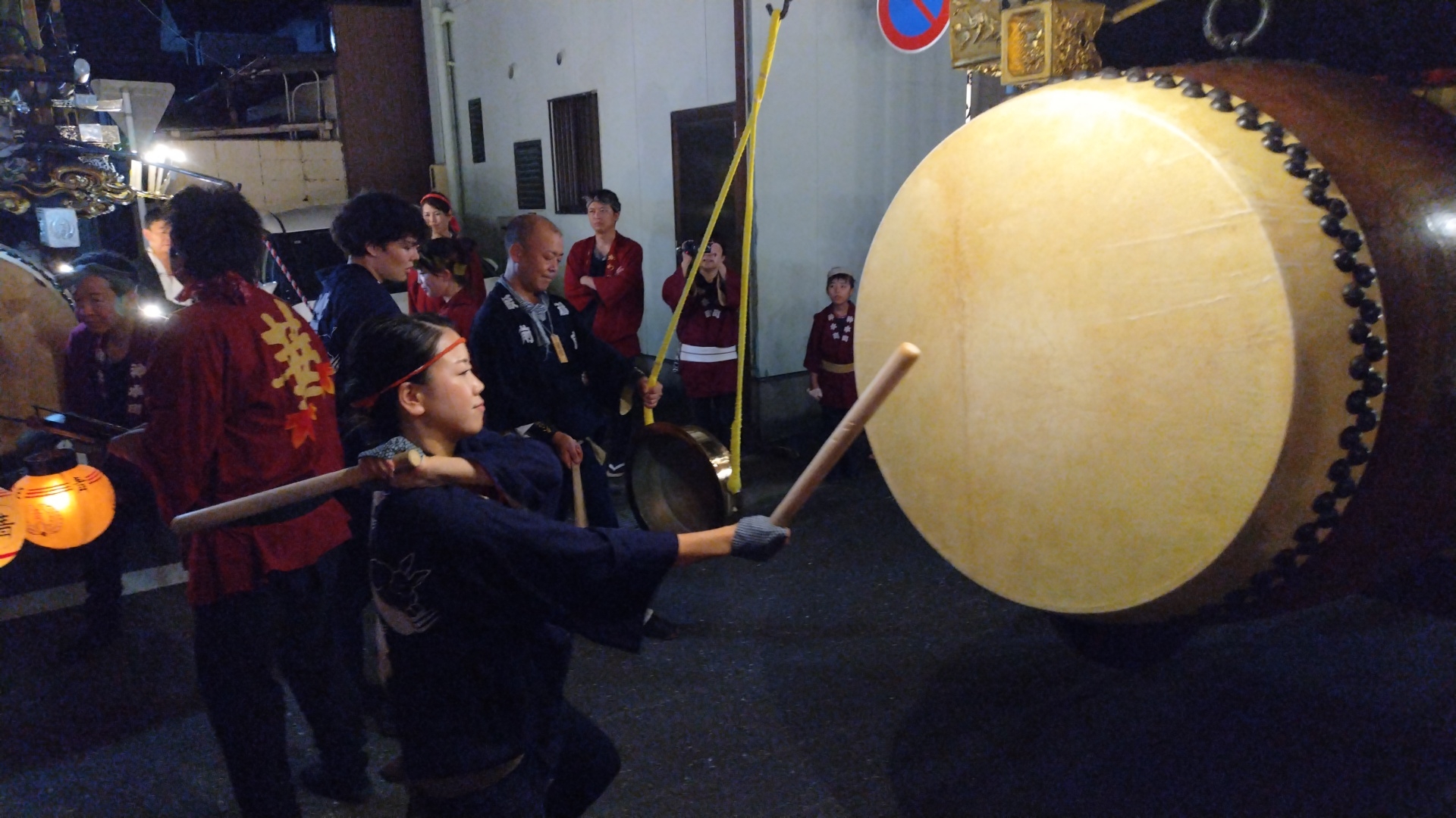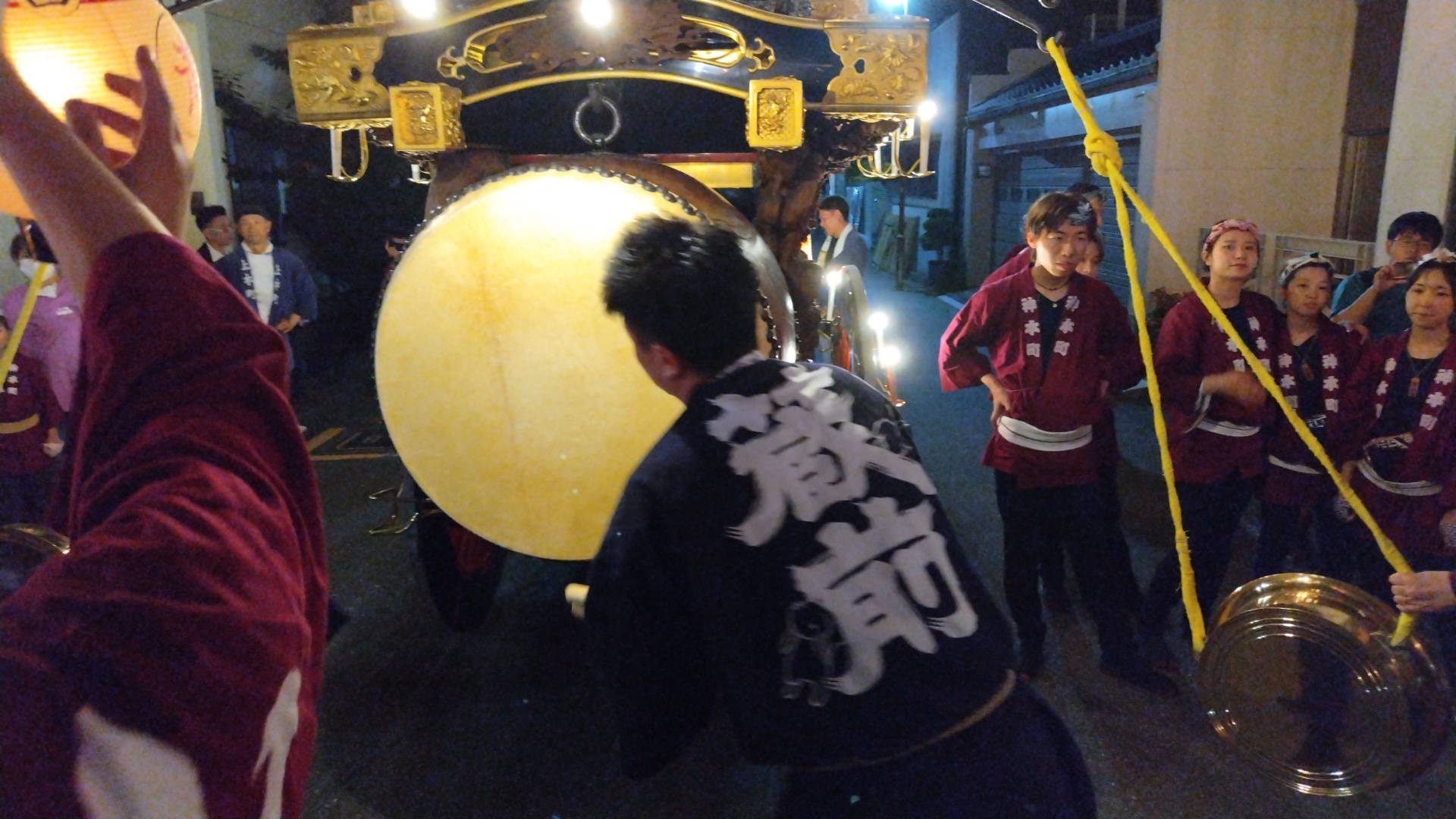 花街川口町祭車で叩かせていただく、上本町青年会員。