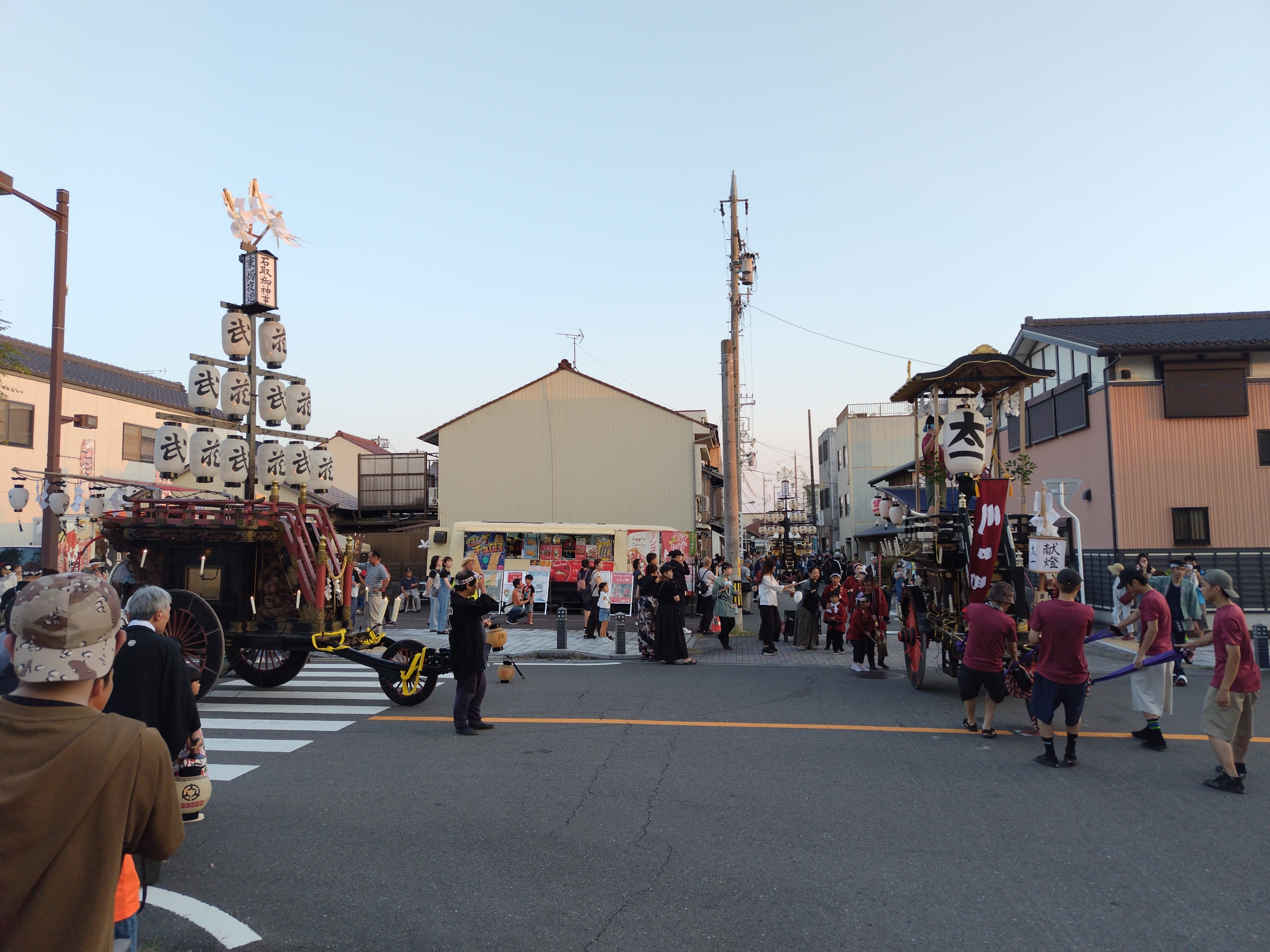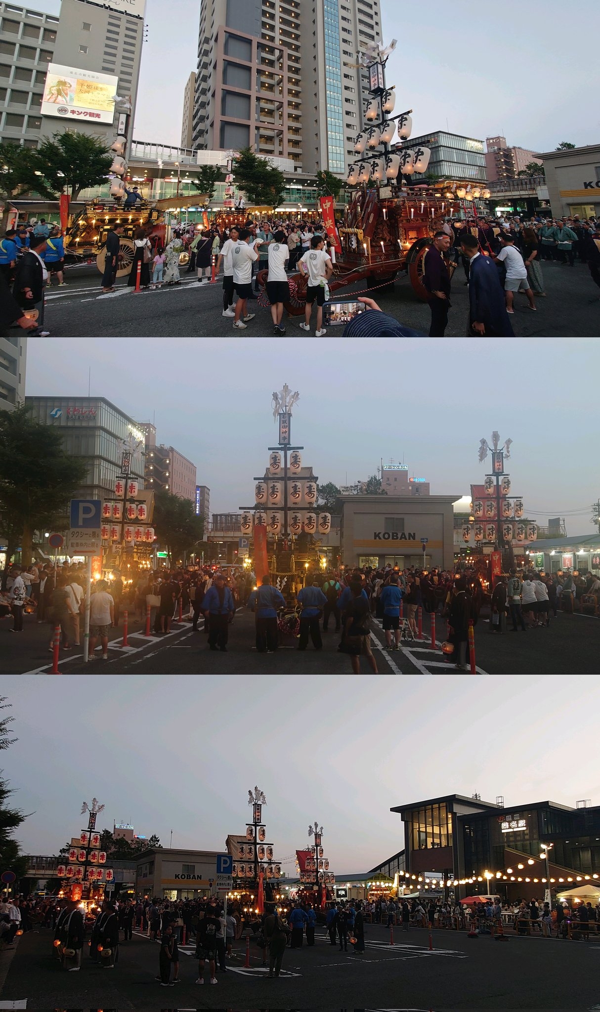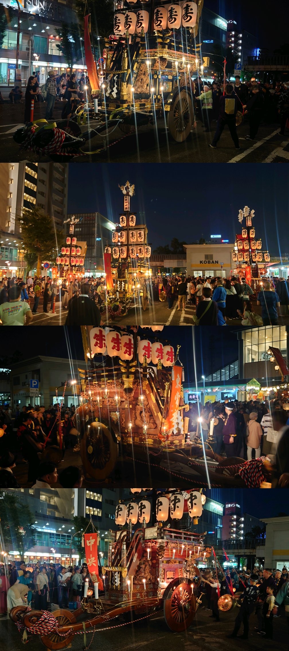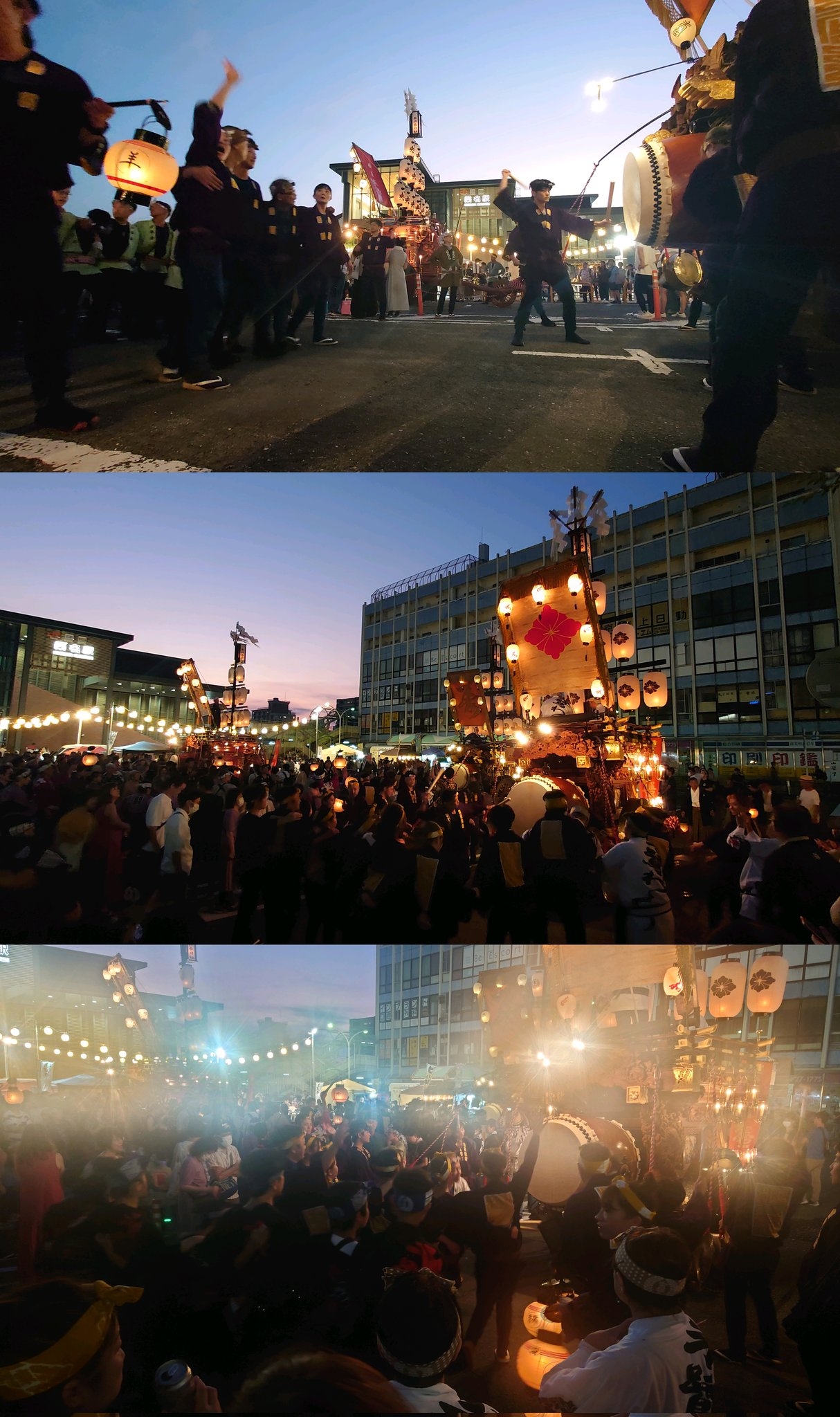 東側に東常盤町祭車、北側に壽町祭車、西側に中央通祭車が並びます。