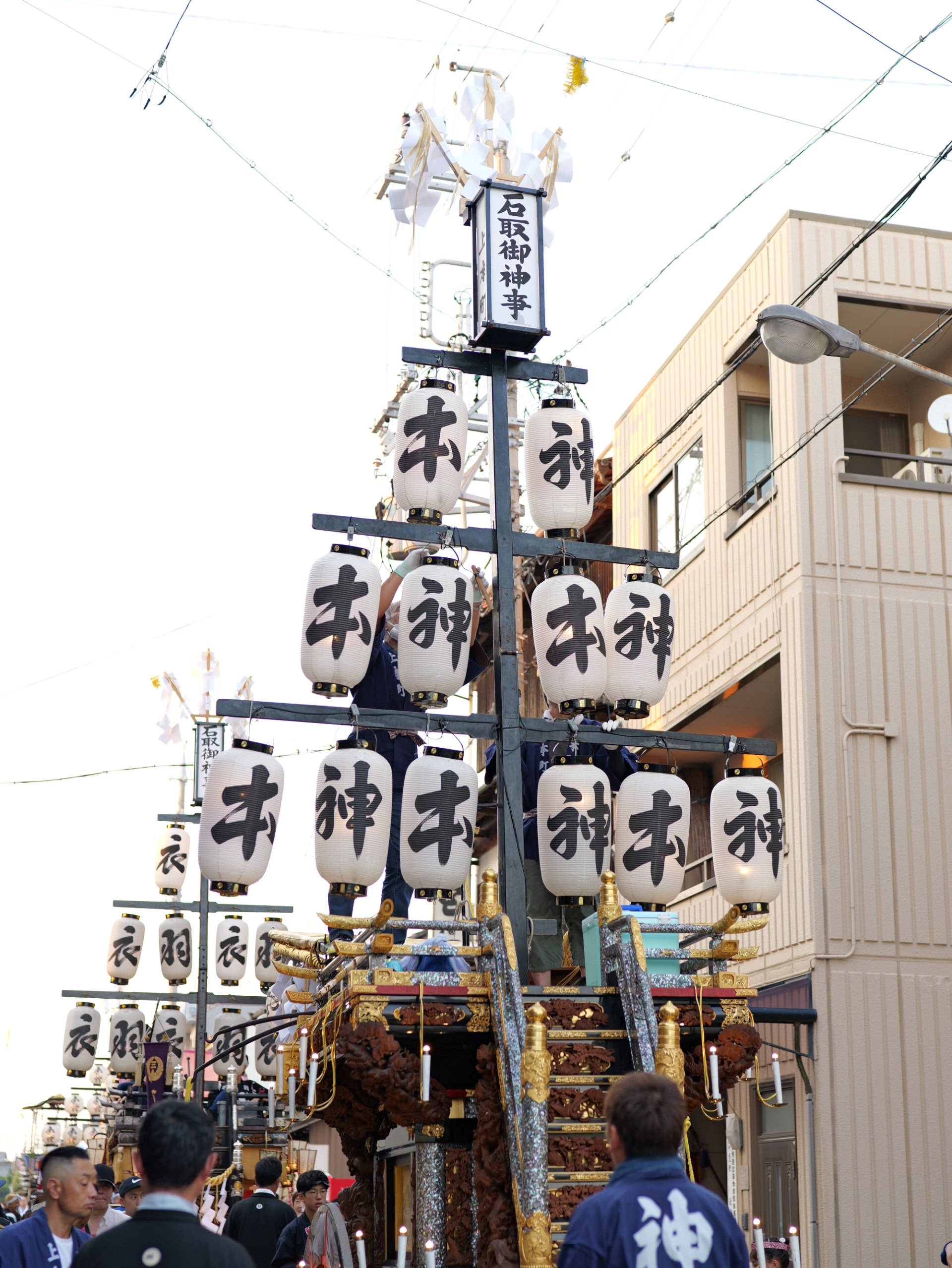 夕御饌祭で祭事委員に渡された斎火を、祭車と馬上提燈に移します。