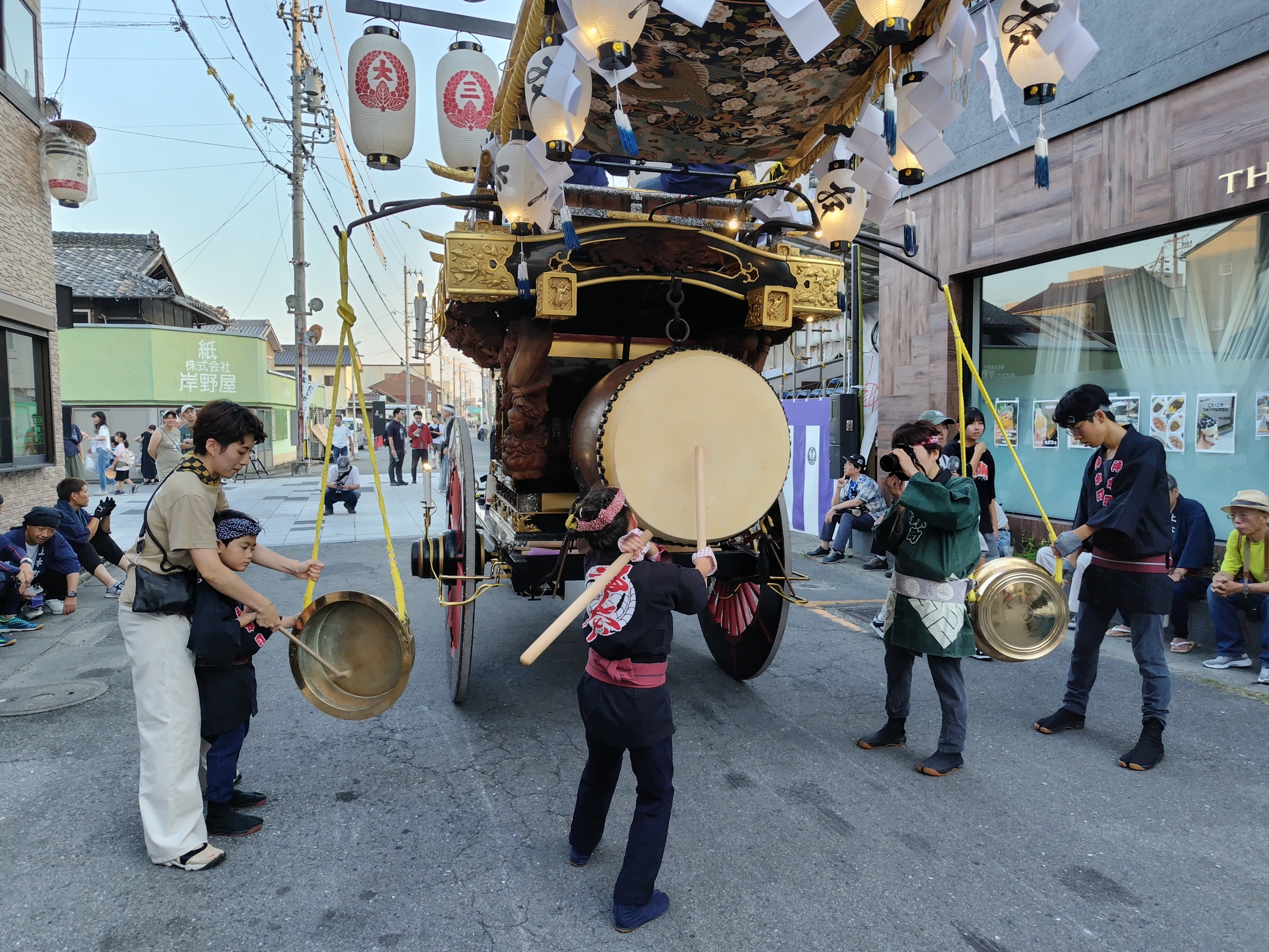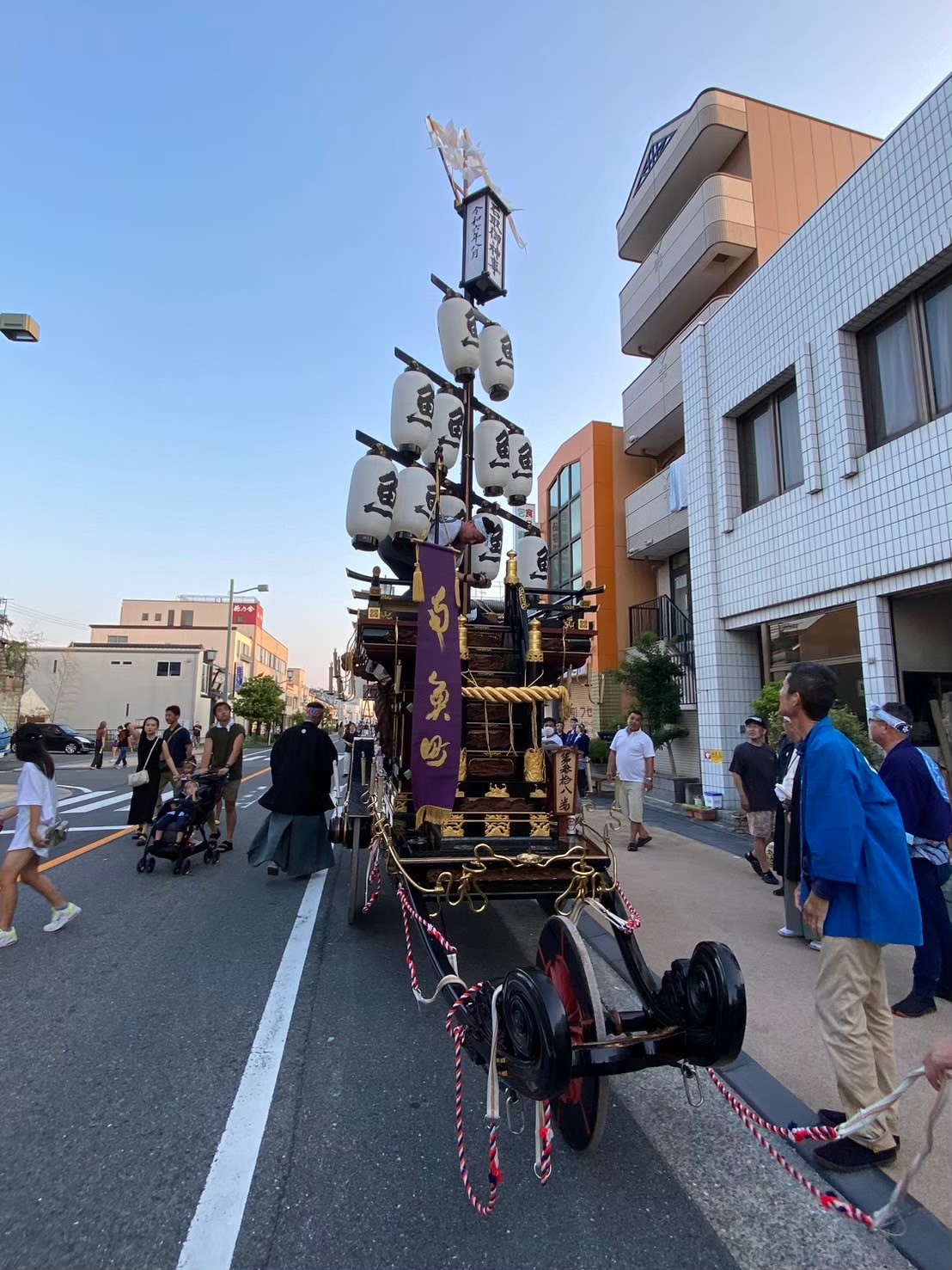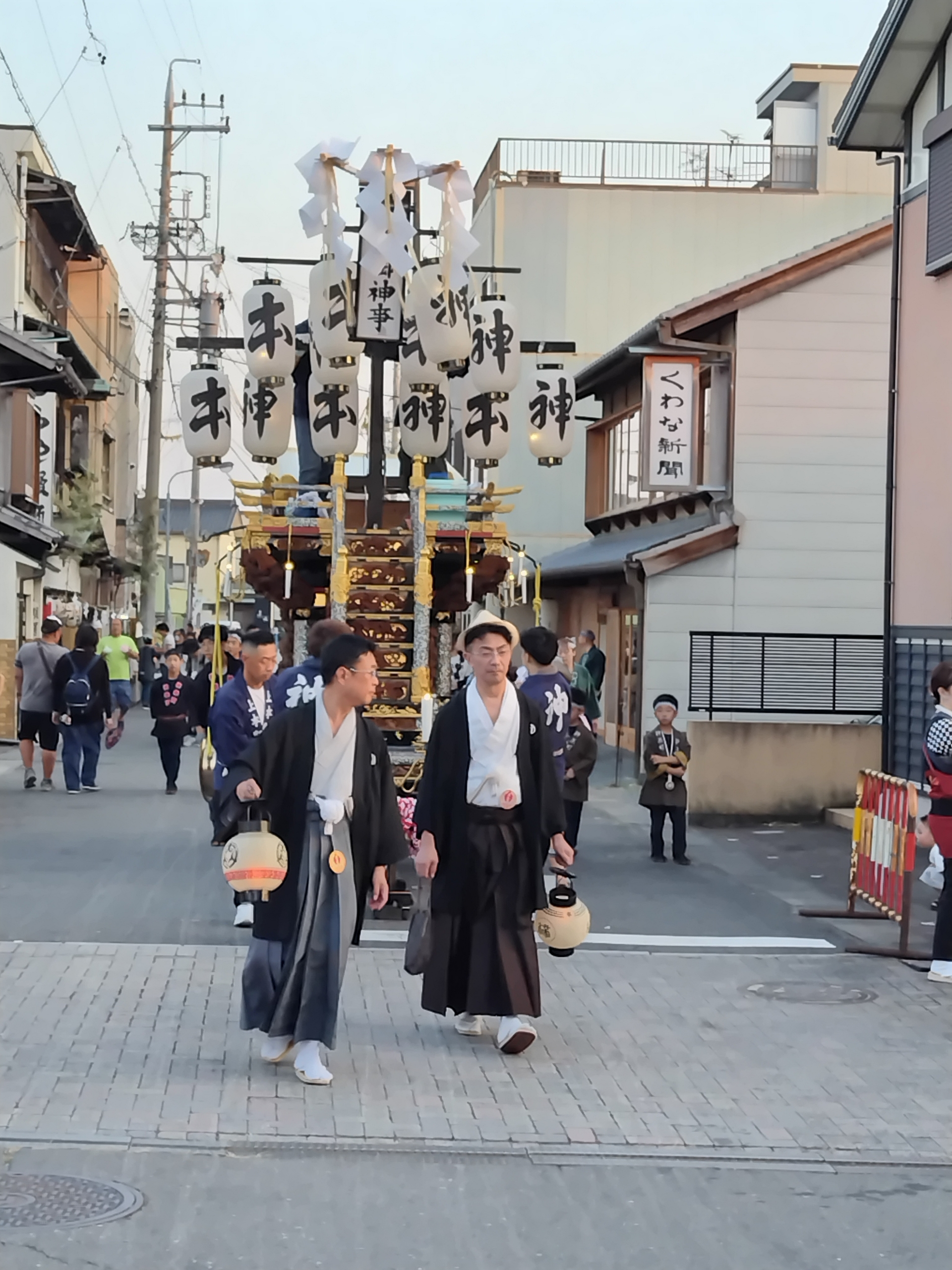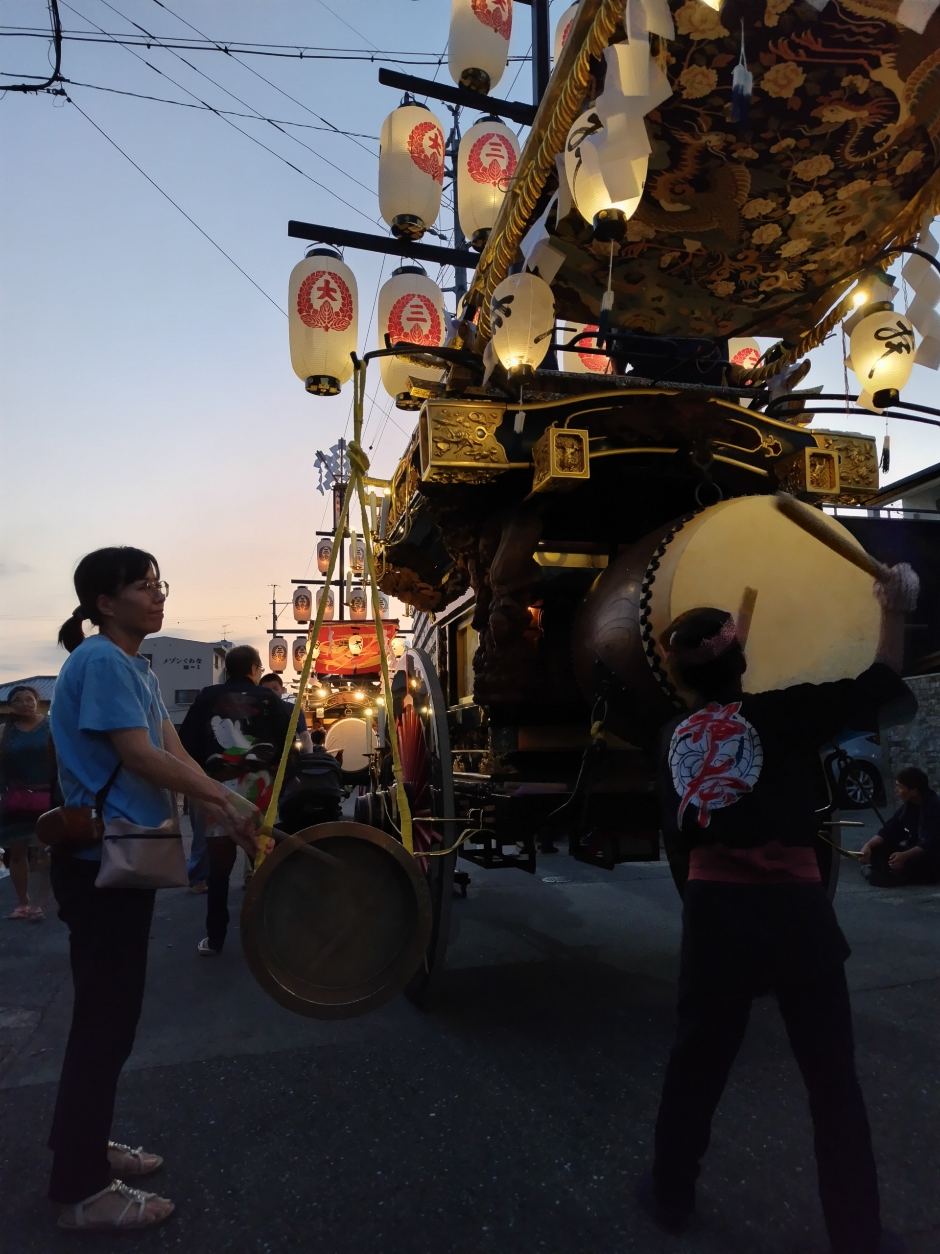後方に桑名駅前から組内に戻る、第十一組の祭車が見えます。