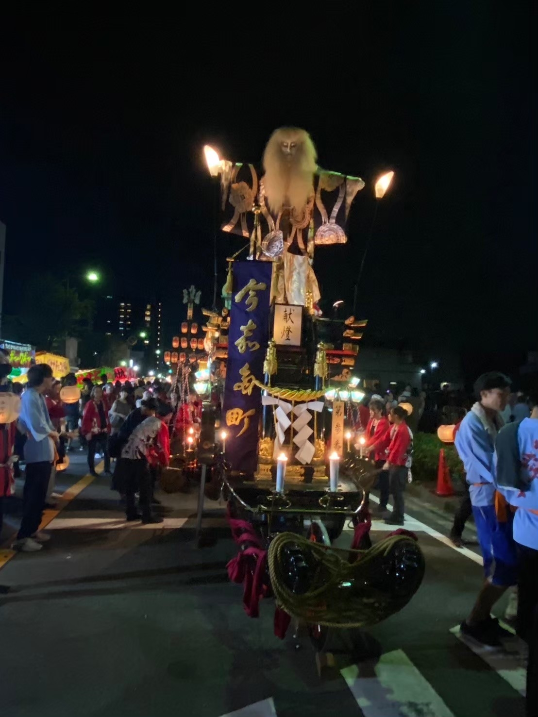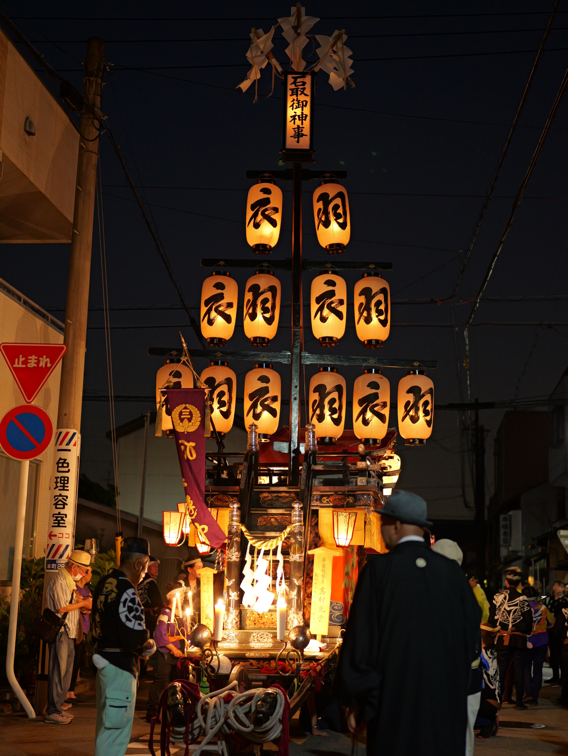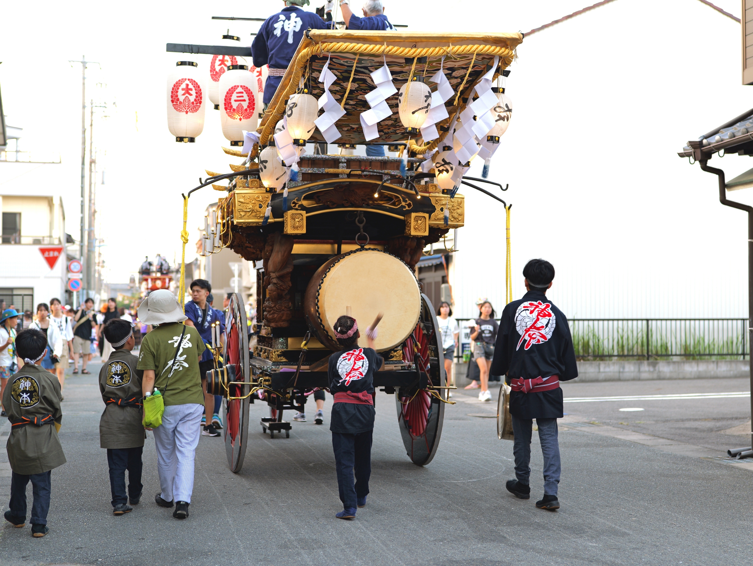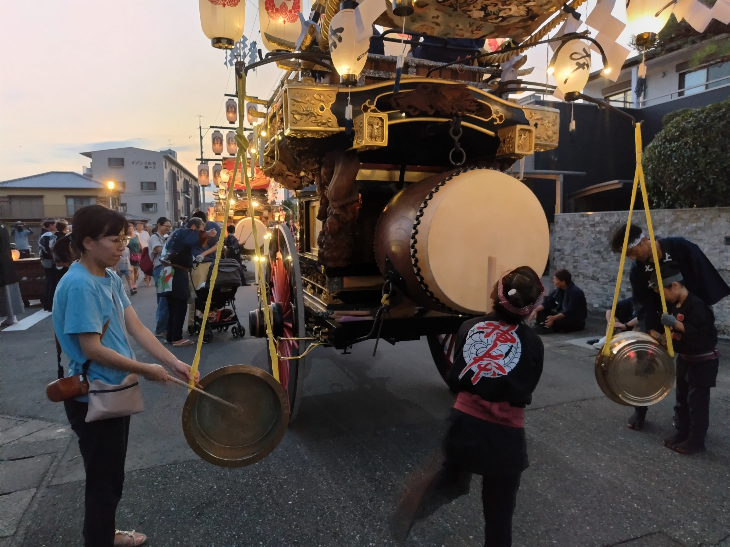 後方に桑名駅前から組内に戻る、第十一組の祭車が見えます。