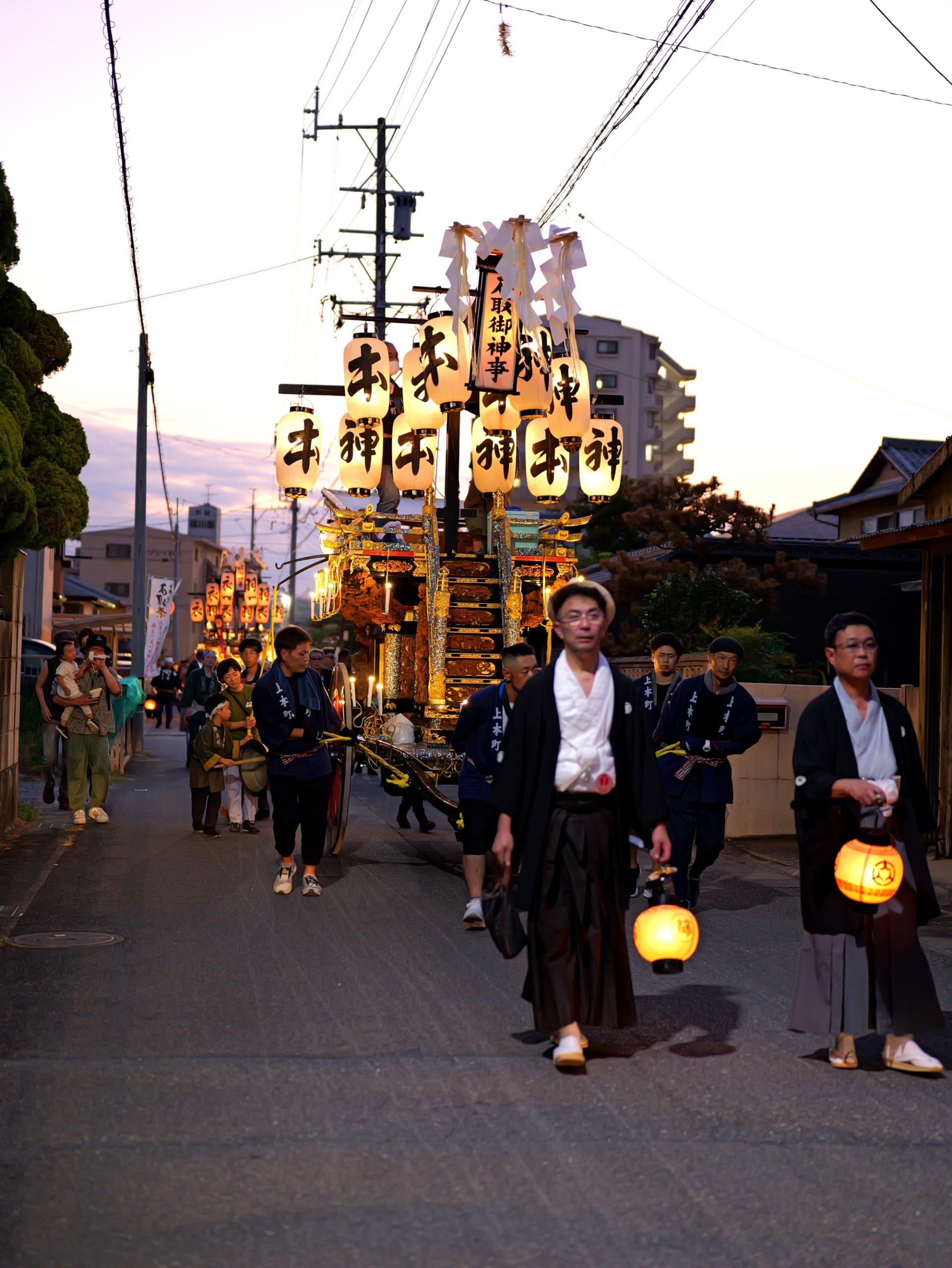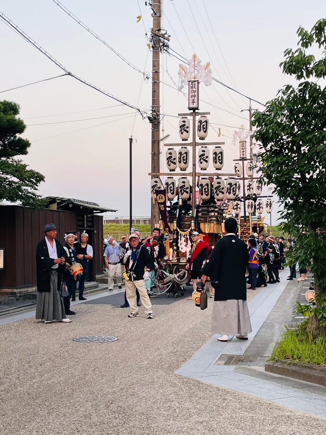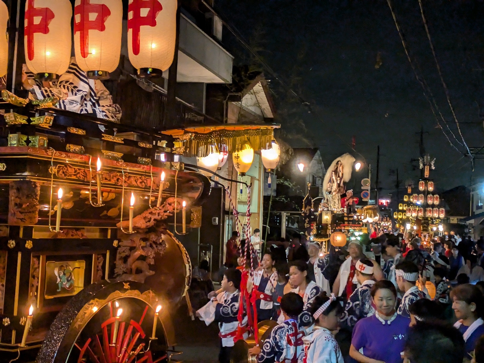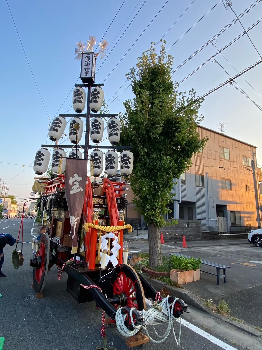 後方に桑名駅前から組内に戻る、第十一組の祭車が見えます。