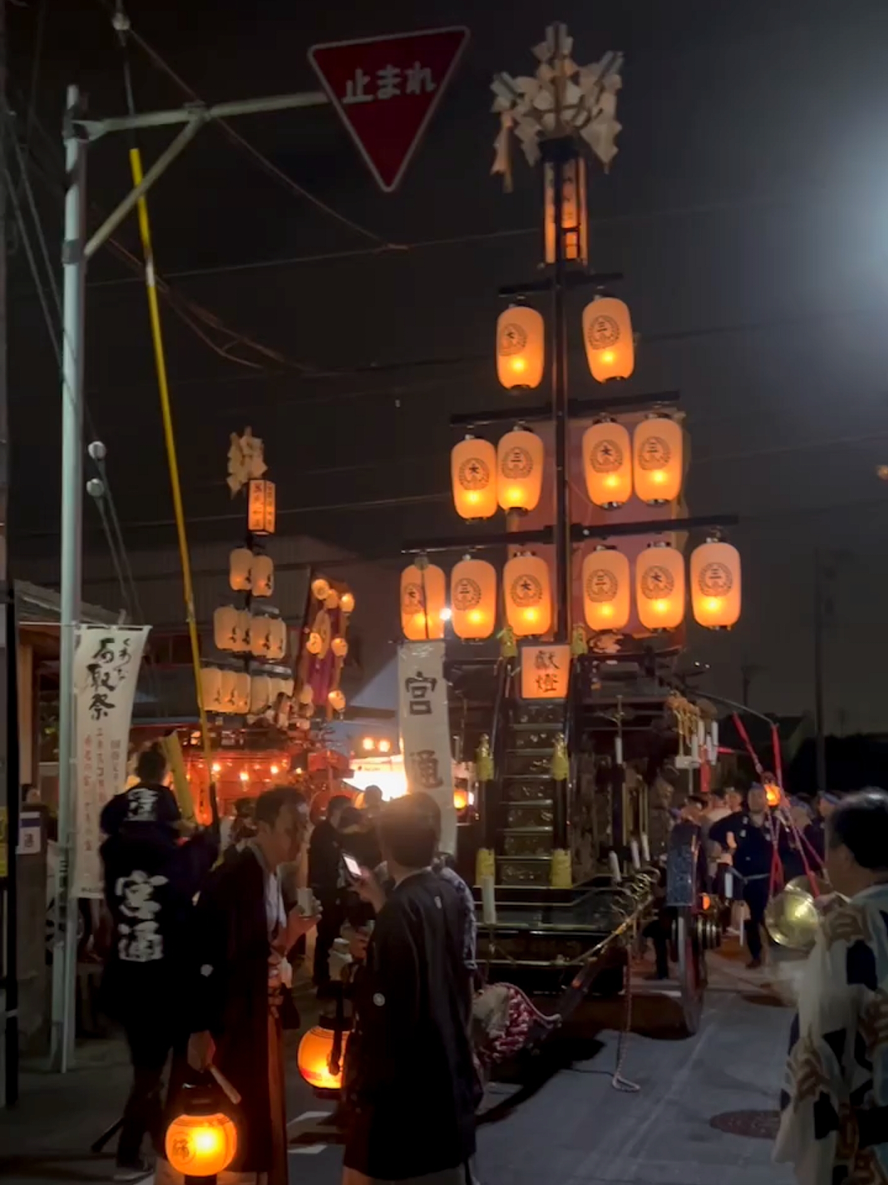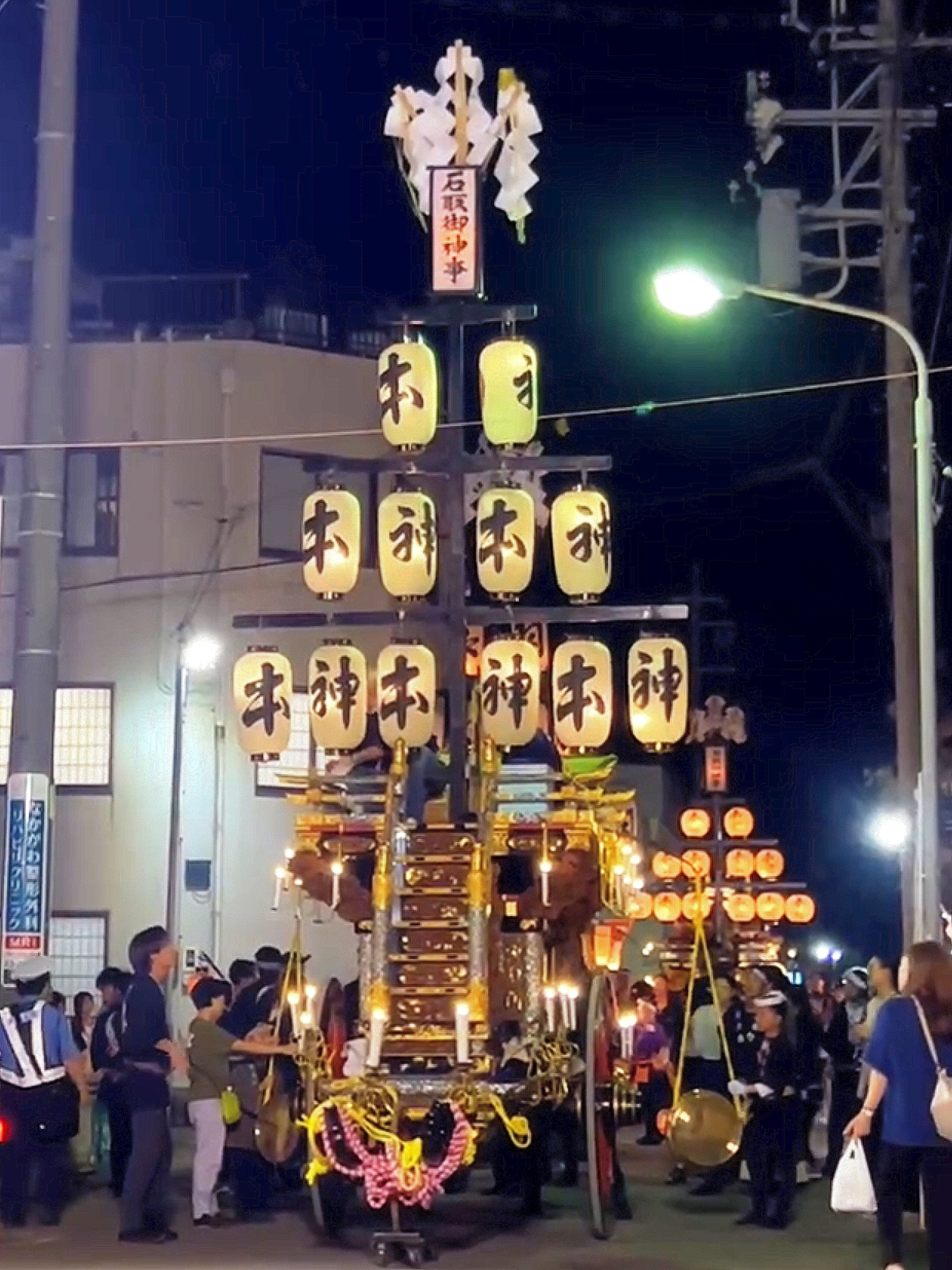 片町祭車の青銅鳥居通過後、宮通祭車と京町祭車が続きます。