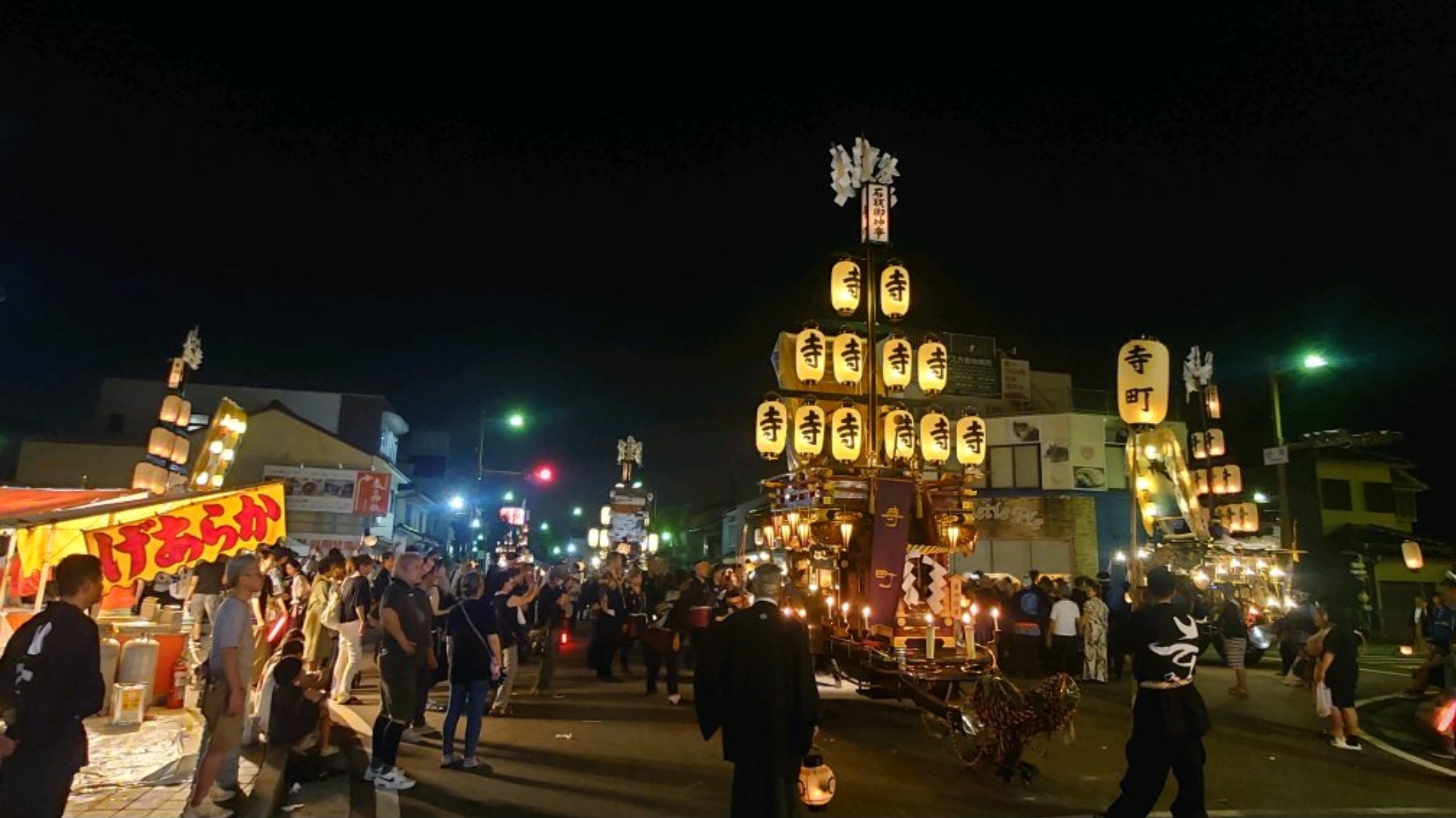 新町祭車を追い抜く時、反対側に露店商があったので斜行して進みます。