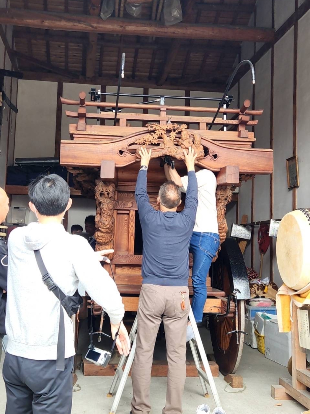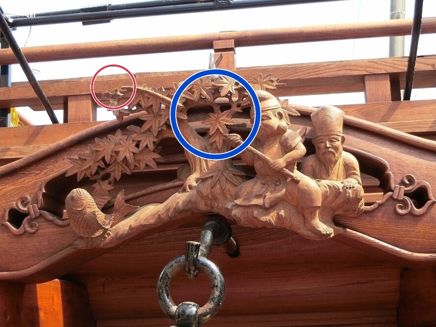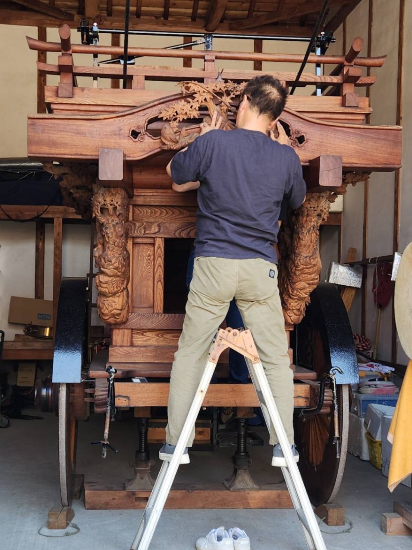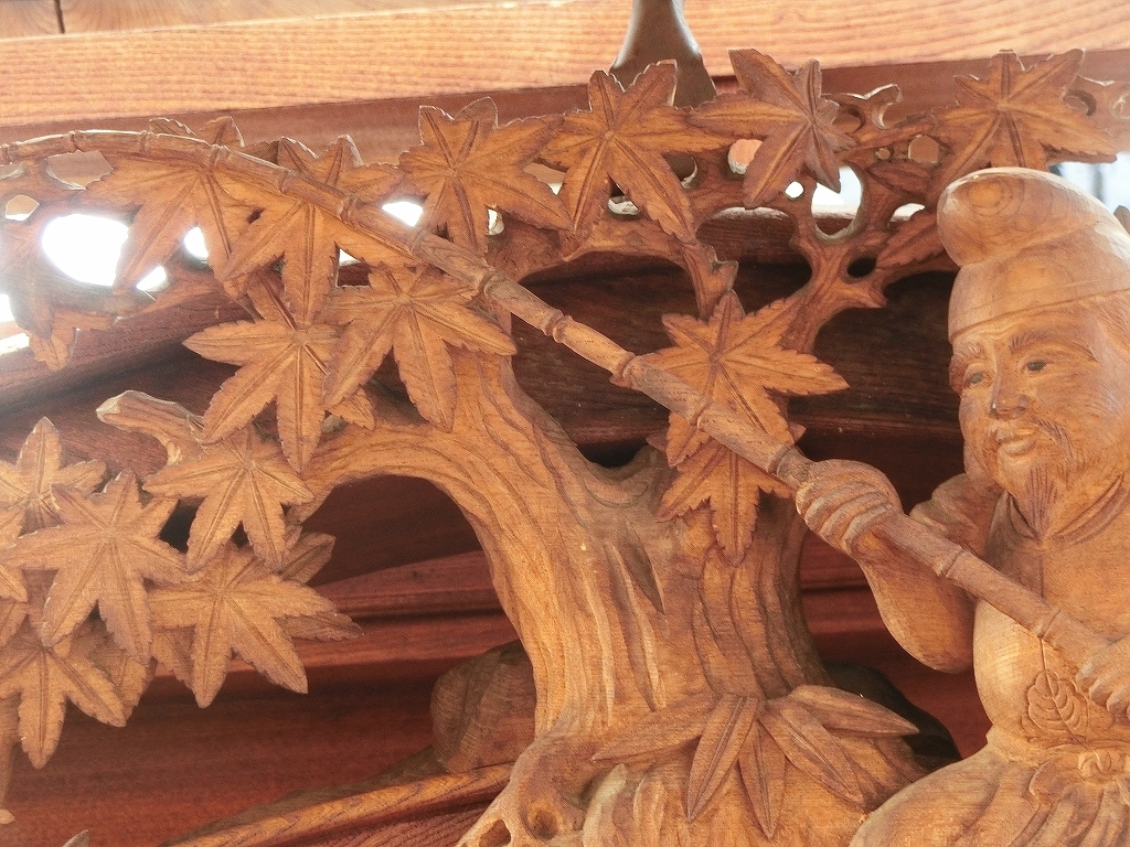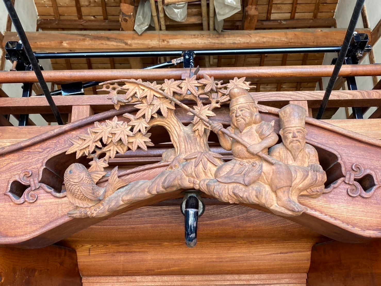 8/4 蛭子町祭車太鼓掛彫刻の修復が完了し、取り付けられました。